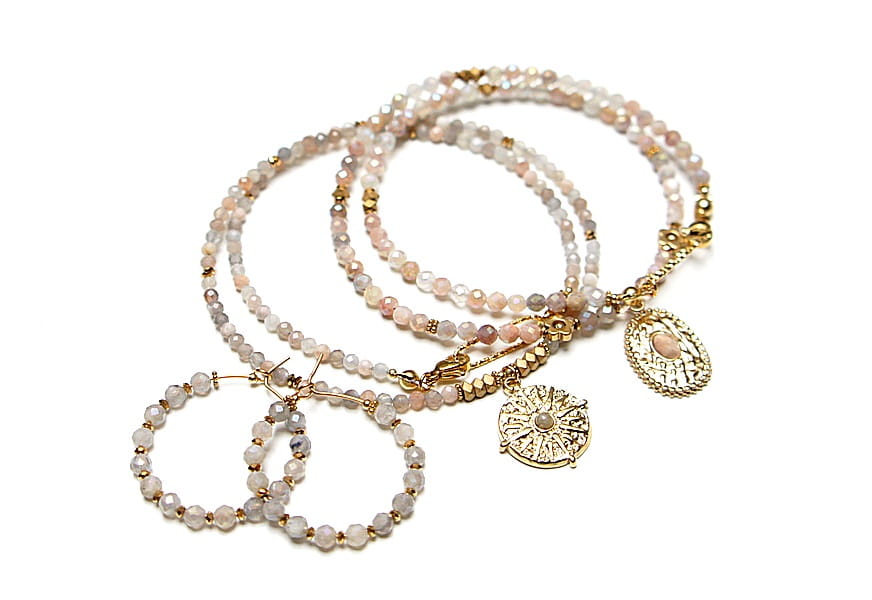 Kolczyki wykonane ze stali szlachetnej pokrytej zlotem, kuleczek fasetowanych, galwanizowanych labradorytów [3mm], oponek fasetowanych labradorytów [3mm] oraz przekładek z hematytu [1mm]. Średnica kół 30mm. Biżuteria ozdobnie zapakowana.