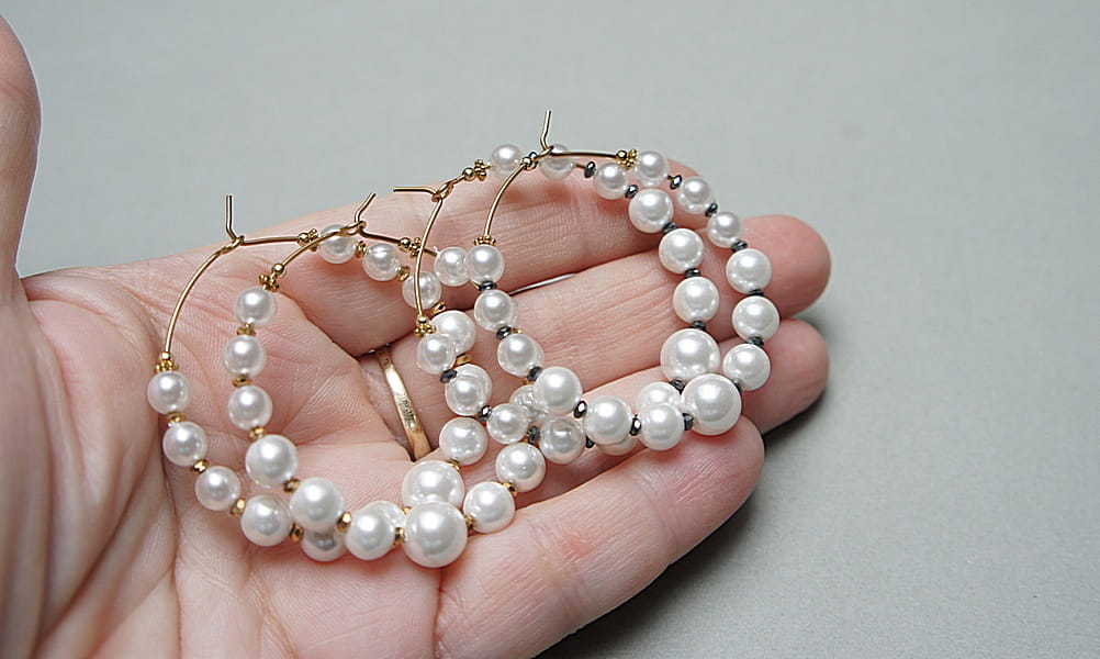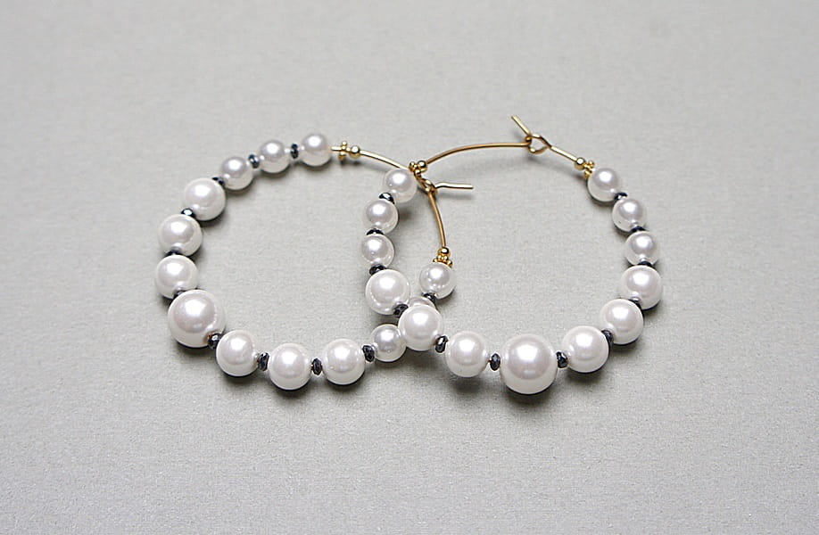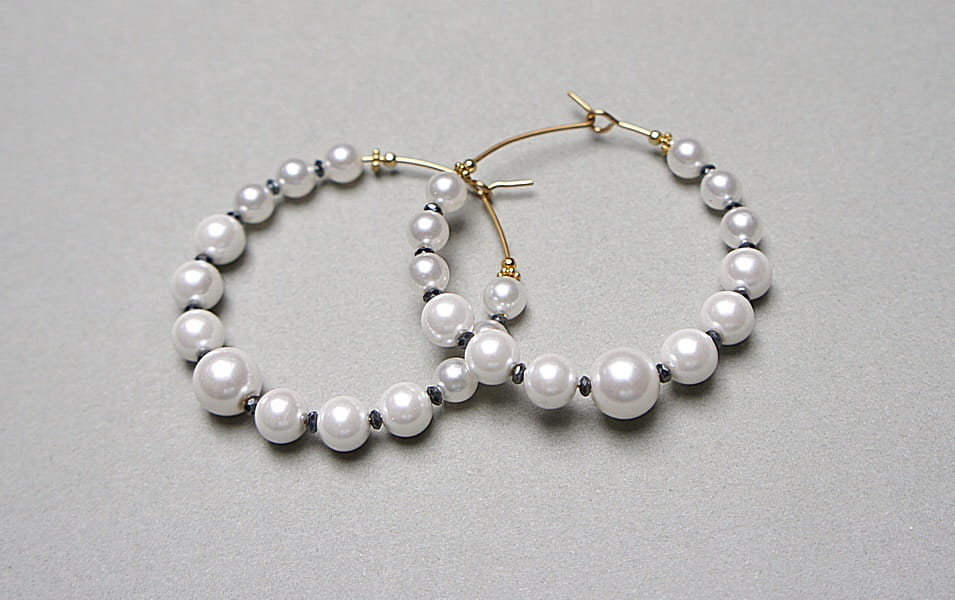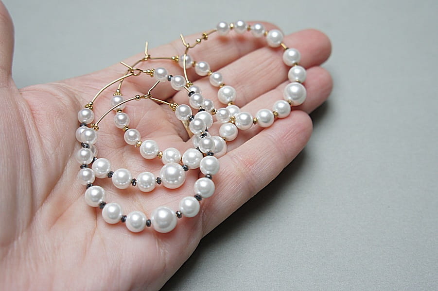 Kolczyki wykonane ze stali szlachetnej pokrytej zlotem, pereł seashell [5, 6, 8 i 10mm], przekładek z hematytu [4 x 1mm]. Średnica kół 40mm. Biżuteria ozdobnie zapakowana.