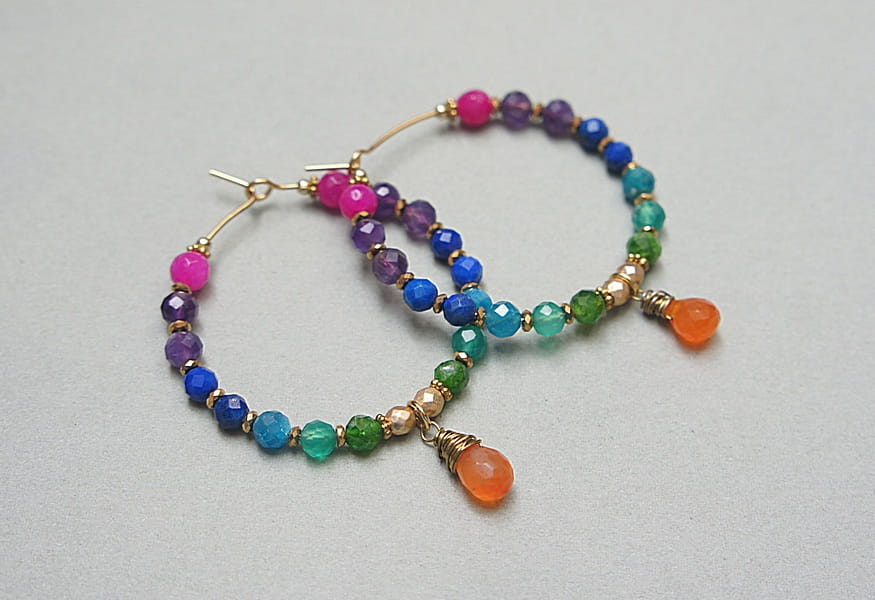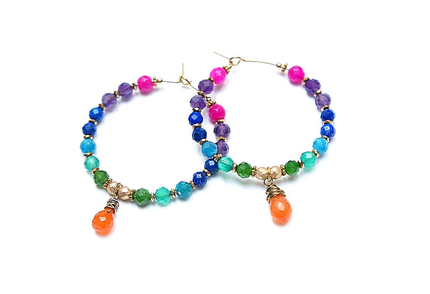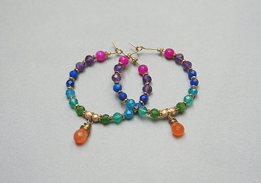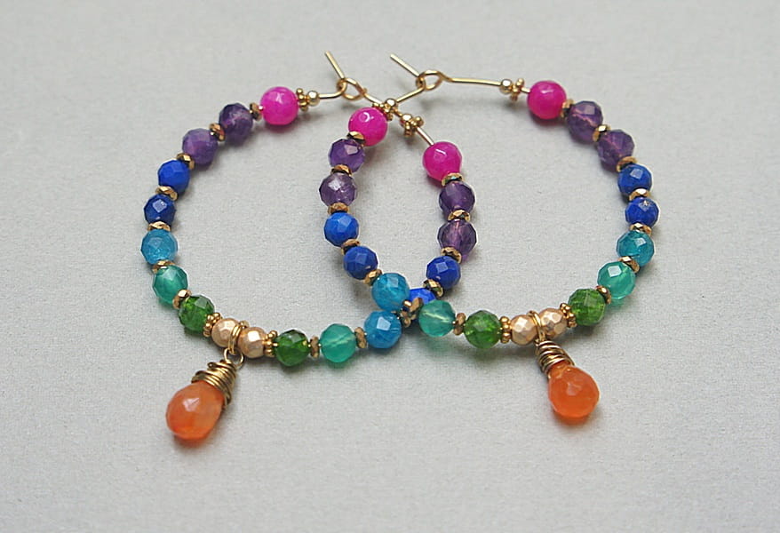 Kolczyki wykonane ze stali szlachetnej pokrytej zlotem, oraz naturalnych minerałów: ametysty [4mm], jadeity [4mm], lapis lazuli [4mm], apatyt [4mm], onyks zielony [4mm], diopsyd [4mm], hematyt platerowany [3mm] oraz zawieszki - brioletka karneolu. Średnica kół 35mm. Biżuteria ozdobnie zapakowana.