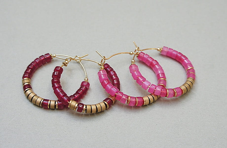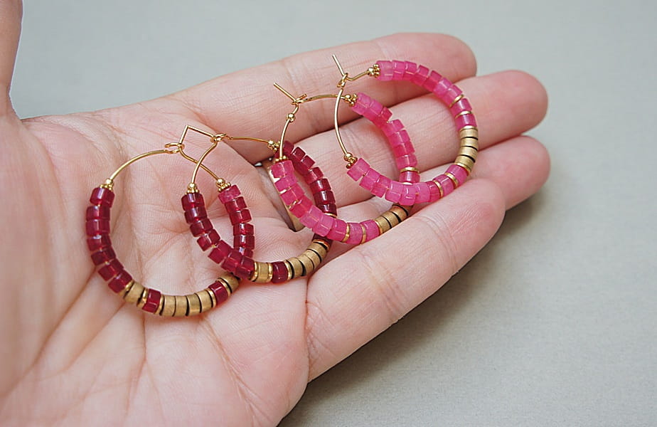Kolczyki wykonane ze stali szlachetnej pokrytej zlotem, talarków jadeitów [4 x 2mm],talarków matowych hematytów [4 x 2mm]. Średnica kół 30mm. Biżuteria ozdobnie zapakowana.