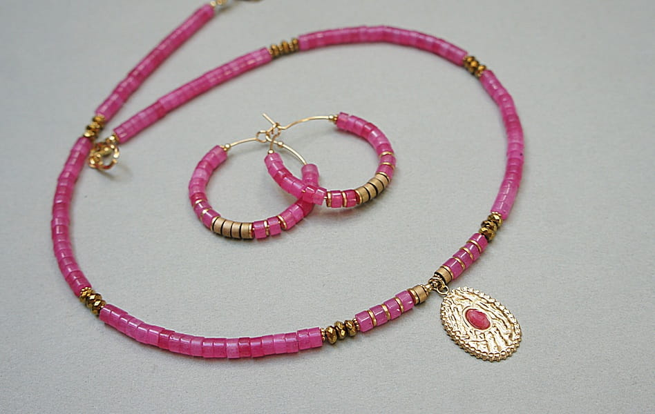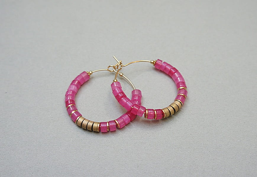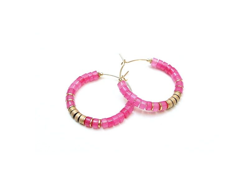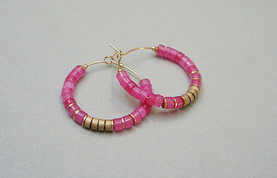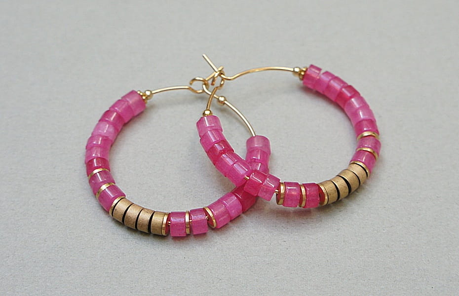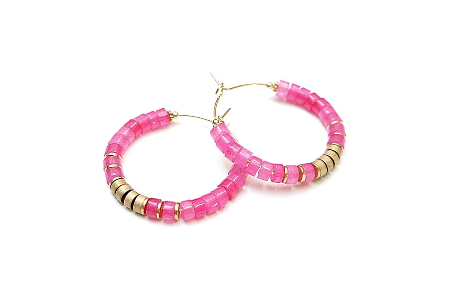 Kolczyki wykonane ze stali szlachetnej pokrytej zlotem, talarków jadeitów [4 x 2mm],talarków matowych hematytów [4 x 2mm]. Średnica kół 30mm. Biżuteria ozdobnie zapakowana.
