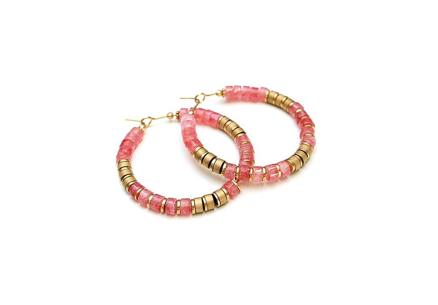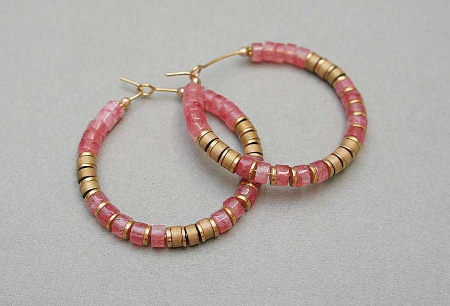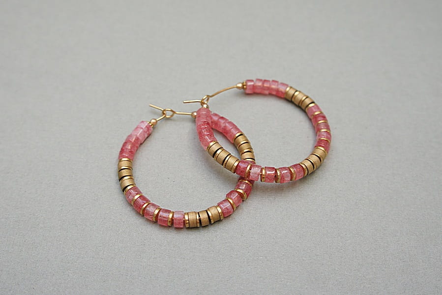 Kolczyki wykonane ze stali szlachetnej pokrytej zlotem, talarków naturalnych kwarców strawberry [4 x 2mm],talarków matowych hematytów [4 x 2mm]. Średnica kół 35mm. Biżuteria ozdobnie zapakowana.