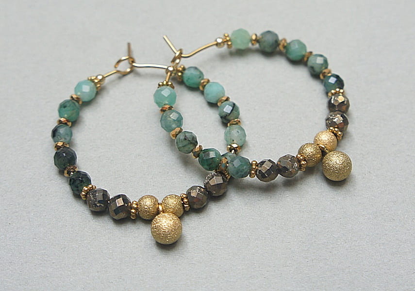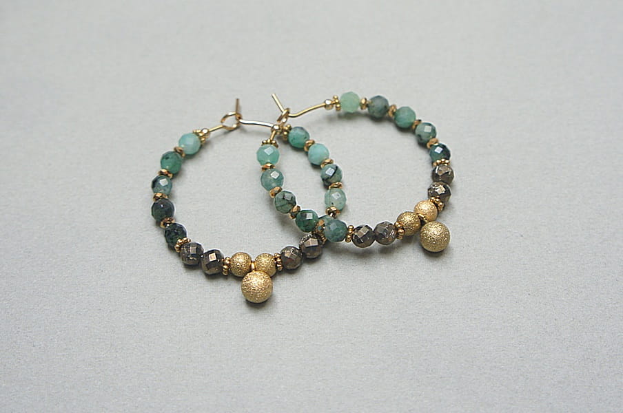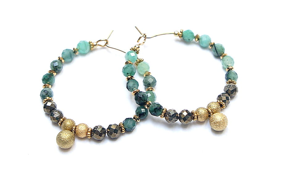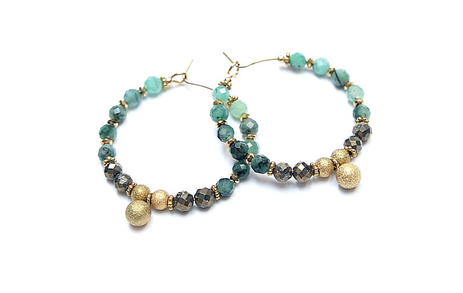 Kolczyki wykonane ze stali szlachetnej pokrytej zlotem, szmaragdów fasetowanych [3,5mm], pirytów fasetowanych [3,5mm], przekładek z hematytu [1mm]. Średnica kół 30mm. Biżuteria ozdobnie zapakowana