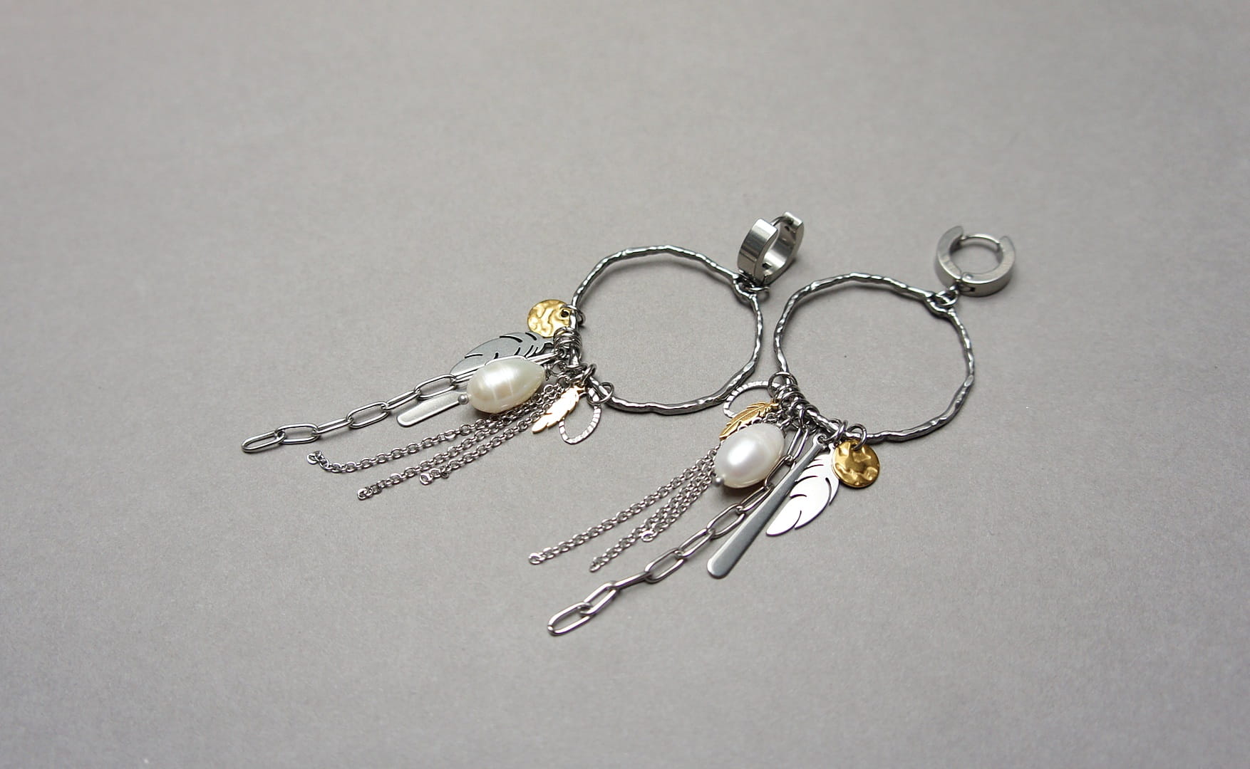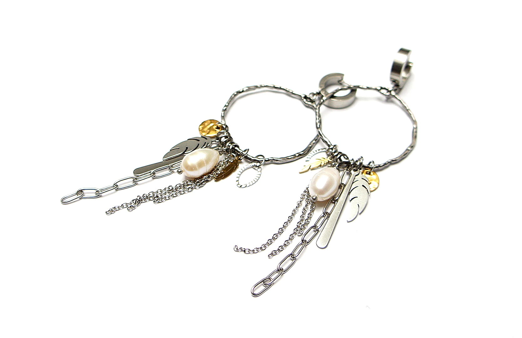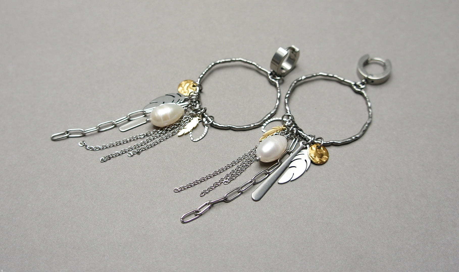 Duże kolczyki wykonane ze stali szlachetnej i stali szlachetnej pozłacanej w połączeniu z naturalnymi perłami słodkowodnymi [14mm] oraz zawieszkami . Długość kolczyków: ok. 11cm. Średnica kół 34mm.
