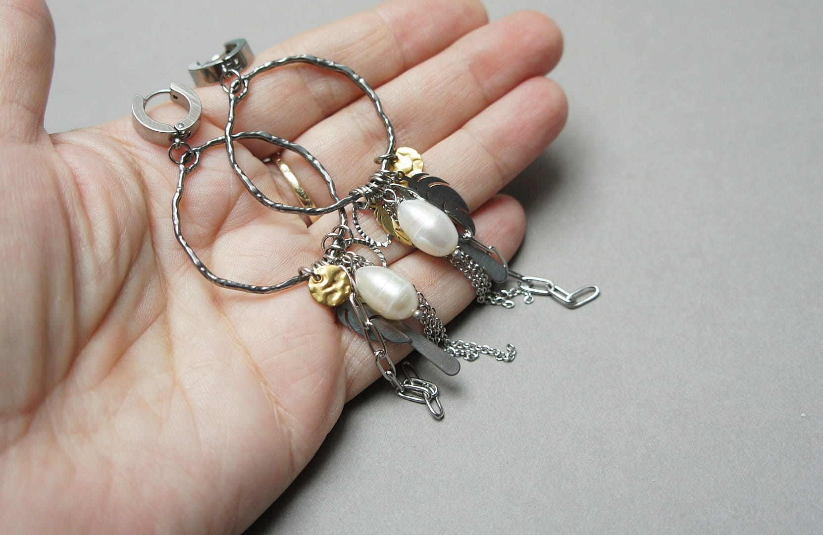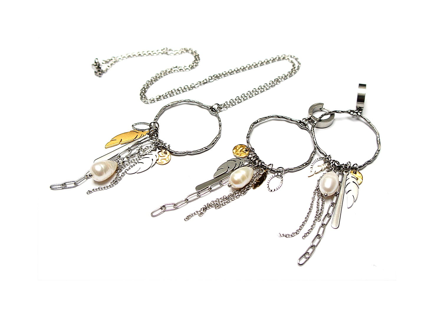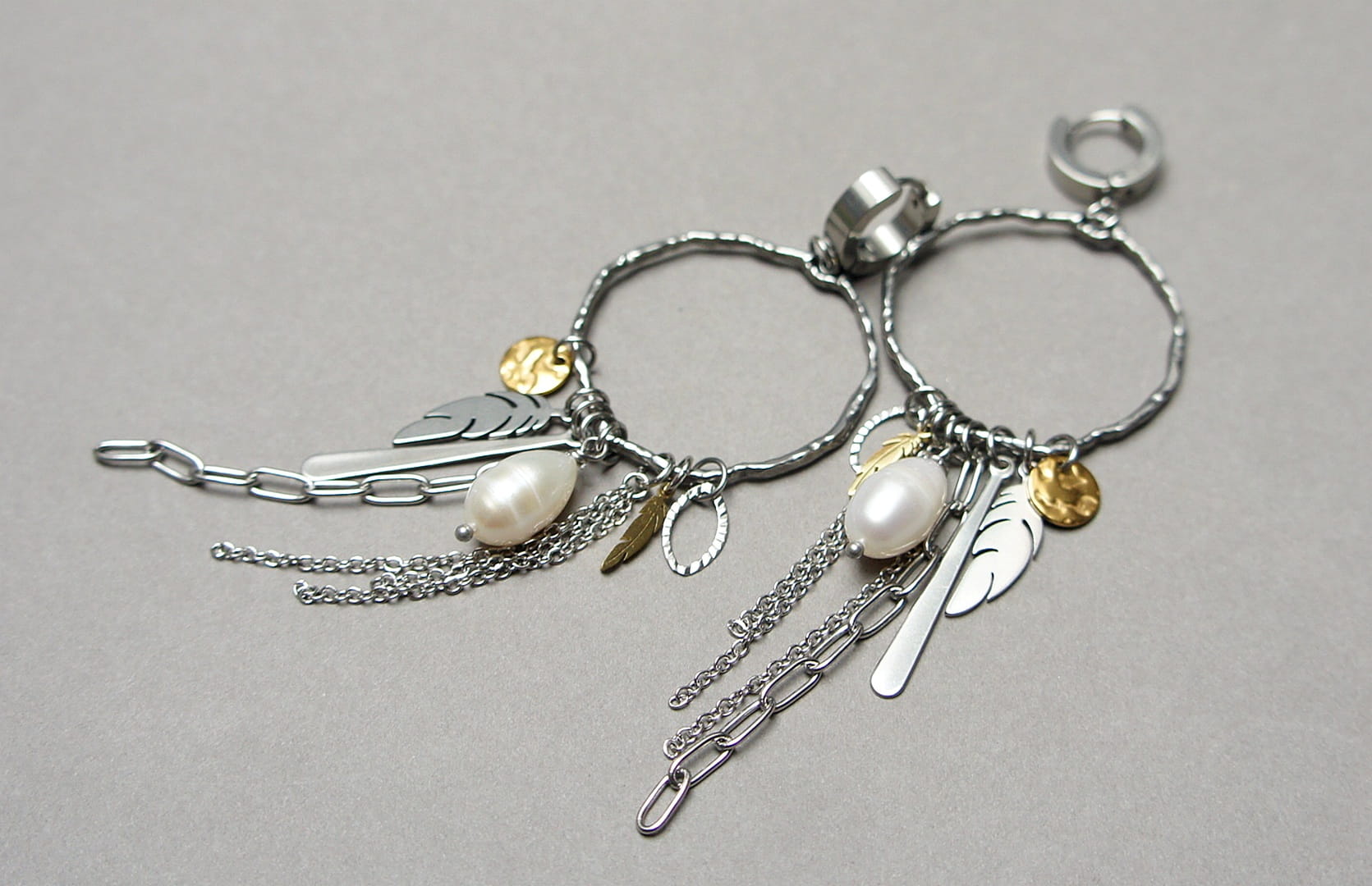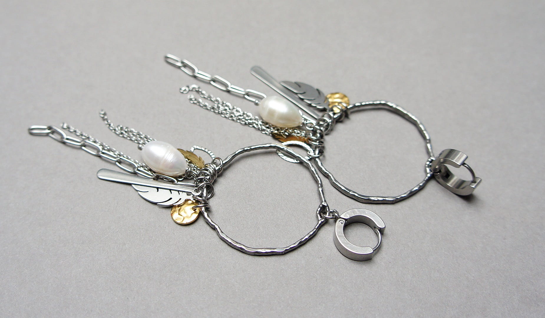 Duże kolczyki wykonane ze stali szlachetnej i stali szlachetnej pozłacanej w połączeniu z naturalnymi perłami słodkowodnymi [14mm] oraz zawieszkami . Długość kolczyków: ok. 11cm. Średnica kół 34mm.