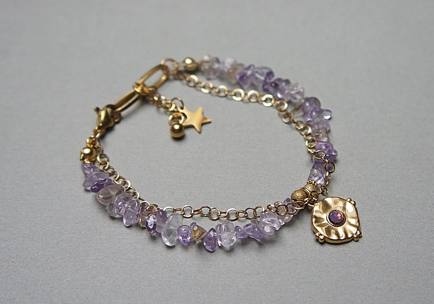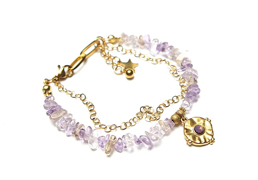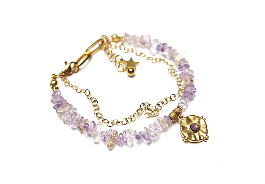 Delikatna bransoletka wykonana w całości ze stali szlachetnej pozłacanej oraz naturalnych, szlachetnych kamieni - pazurki ametrynu oraz zawieszki z kryształkiem Swarovski. Długość bransoletki - 18cm. Biżuteria ozdobnie zapakowana.