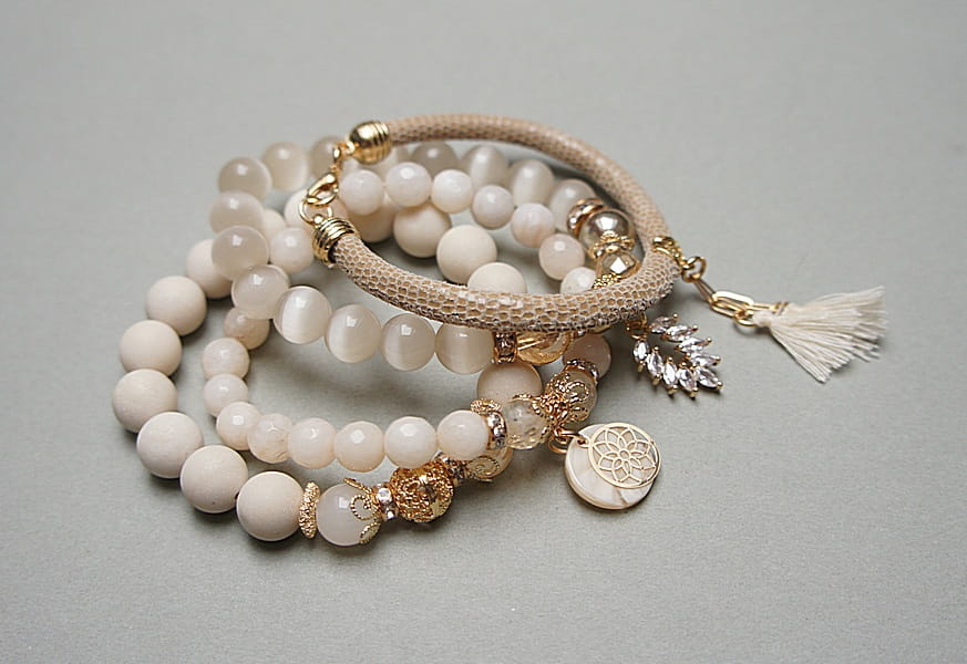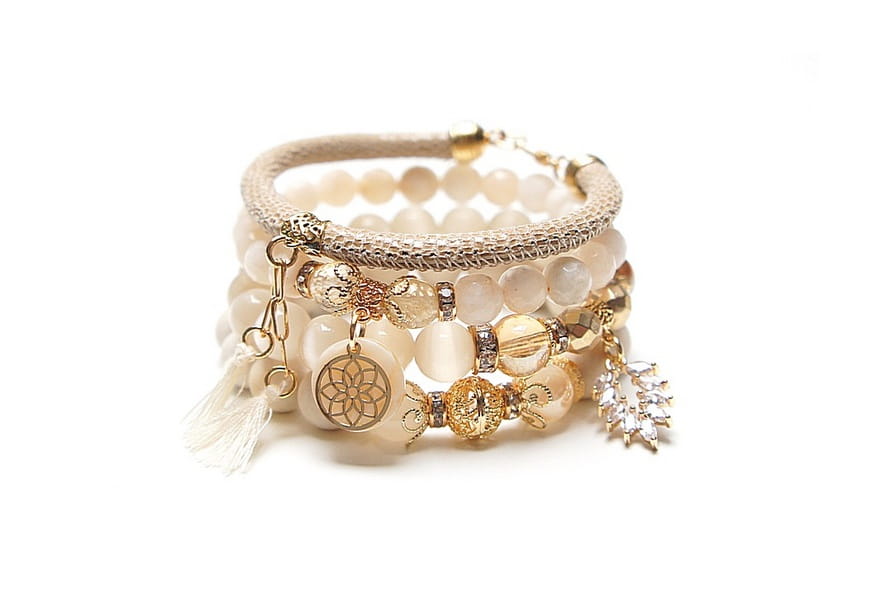 Komplet czterech bransoletek wykonanych z naturalnych kamieni: jadeity fasetowane [8mm], jaspis matowy [10mm], kocie oko [10mm], hematyt fasetowany, platerowany [8mm], kuleczek z opalizującego szkła [10mm], chwostów, rzemienia z naturalnej skórki, zawieszki wysadzanej cyrkoniami, zawieszki z żywicy oraz elementów metalowych w kolorze złota. Bransoletki pasują na nadgarstek 16 - 17cm. Biżuteria ozdobnie zapakowana