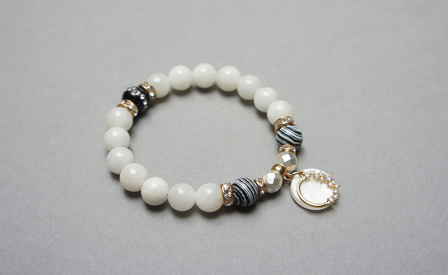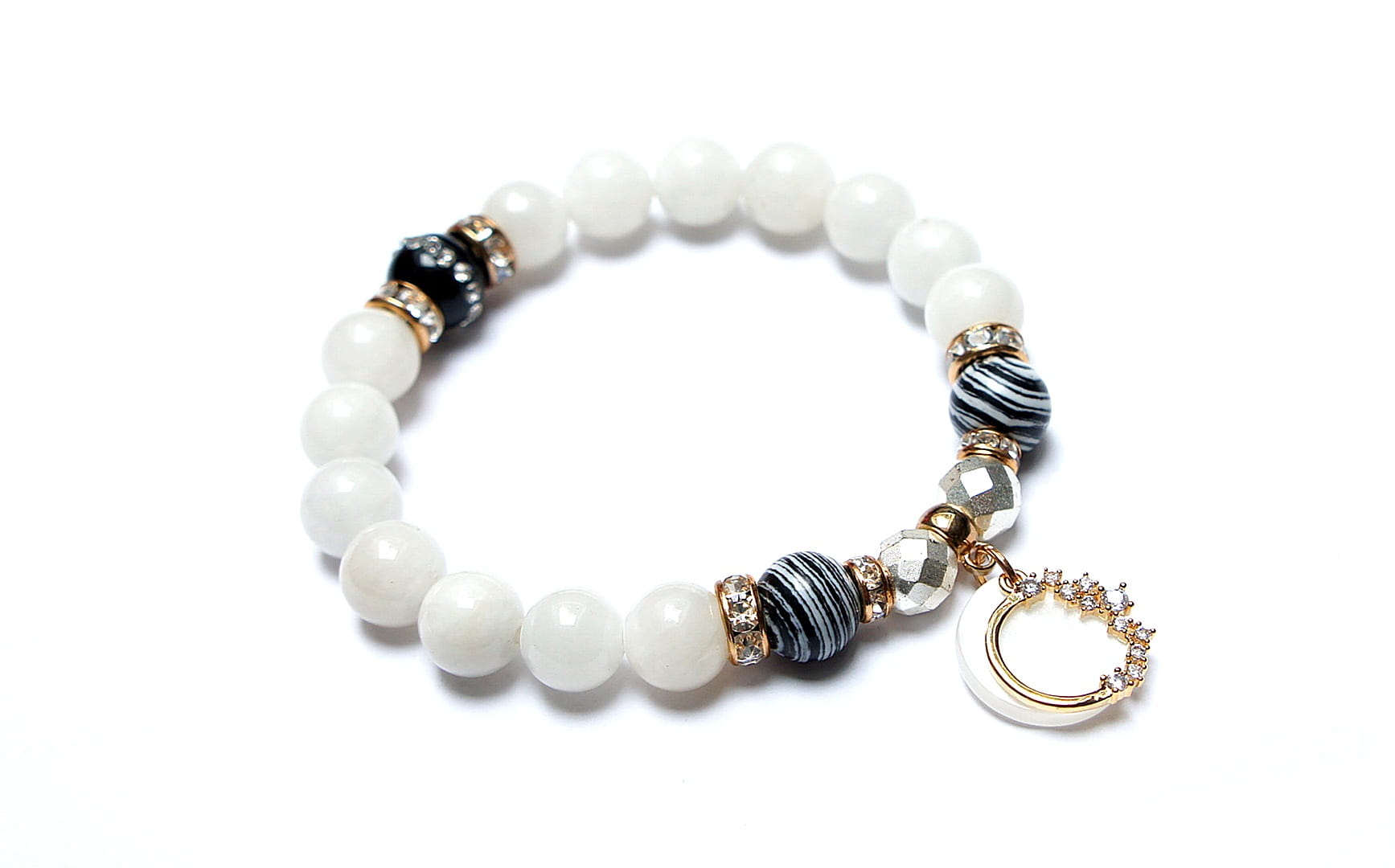Bransoletka wykonana z naturalnych kamieni - jadeit [10mm], onyks wysadzany cyrkoniami [10mm], turkus rekonstruowany [10mm], hematyt fasetowany, platerowany [8mm], zawieszki wysadzanej cyrkoniami, zawieszki z żywicy oraz elementów metalowych w kolorze złota. Bransoletka na gumce silikonowej. Pasuje na nadgarstek 16-17cm. Biżuteria ozdobnie zapakowana.
