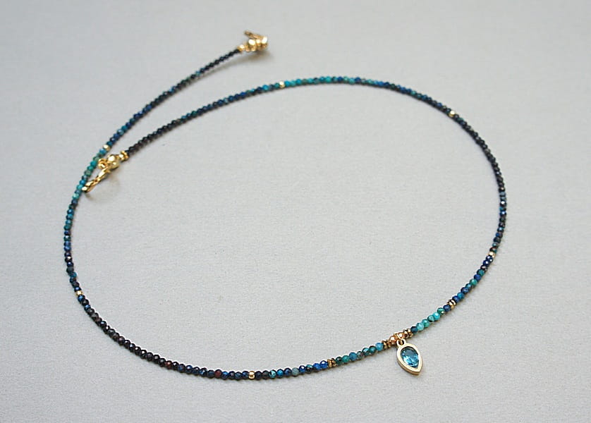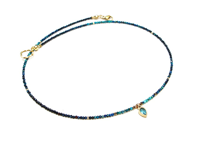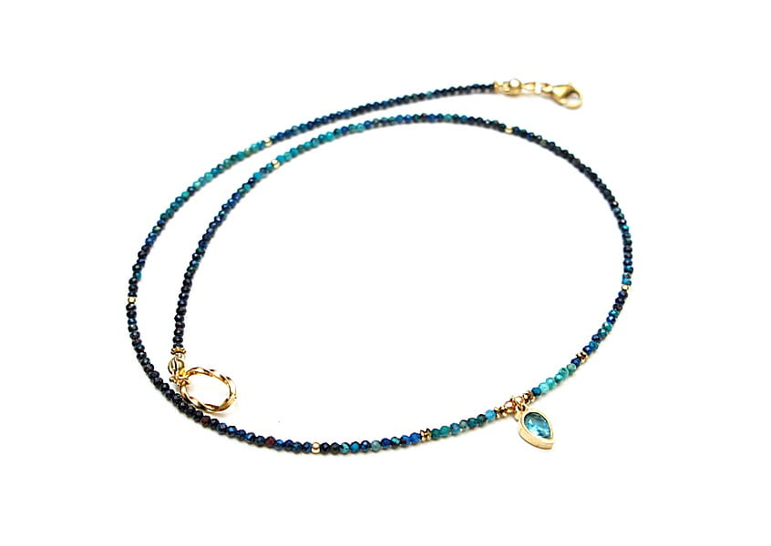 Krótki, delikatny naszyjnik wykonany w całości z pozłacanej stali szlachetnej oraz naturalnych kamieni - fasetowane kuleczki chryzokoli [2mm], przekładki z hematytu [1mm] oraz zawieszki z cyrkonią w okuciu. Naszyjnik o długości ok. 43cm.
