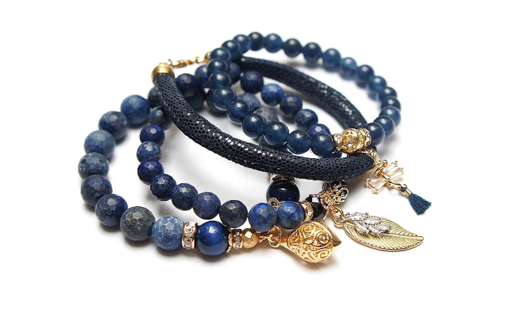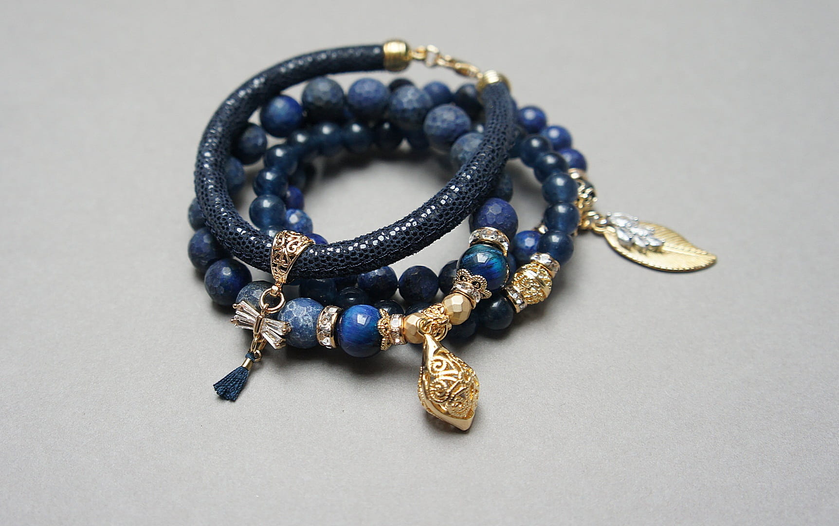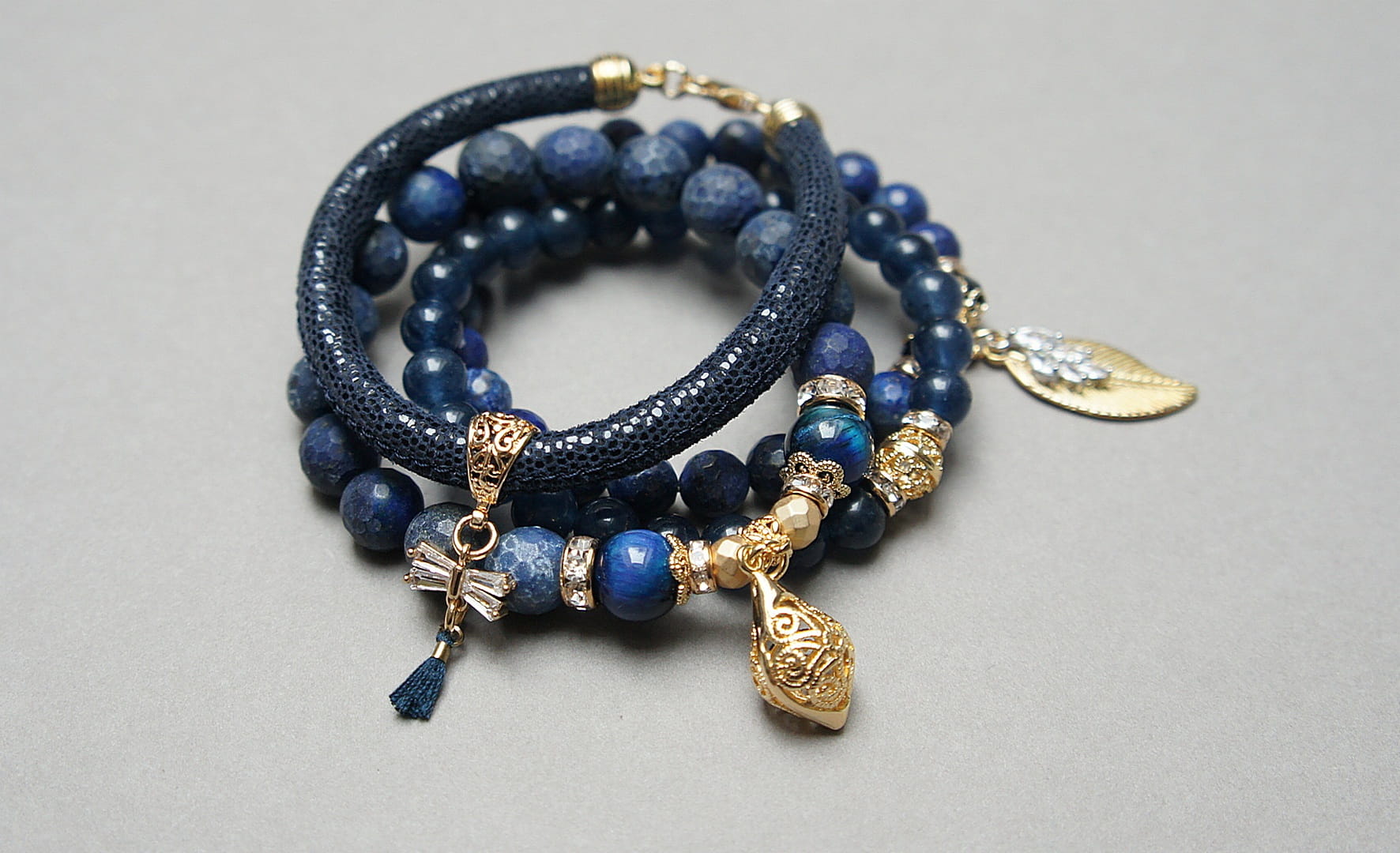 Komplet czterech bransoletek wykonanych z naturalnych kamieni - tygrysie oko [10mm], jaspis [10mm], jaspis fasetowany [8mm i 10mm], jadeit [8mm], kryształków fasetowanych [8mm], hematyt platerowany [6mm], rzemienia z naturalnej skóry, chwostu, zawieszki oraz łącznika wysadzanych cyrkoniami oraz elementów metalowych w kolorze złotym. Bransoletki pasują na nadgarstek 16 - 17cm. Biżuteria ozdobnie zapakowana