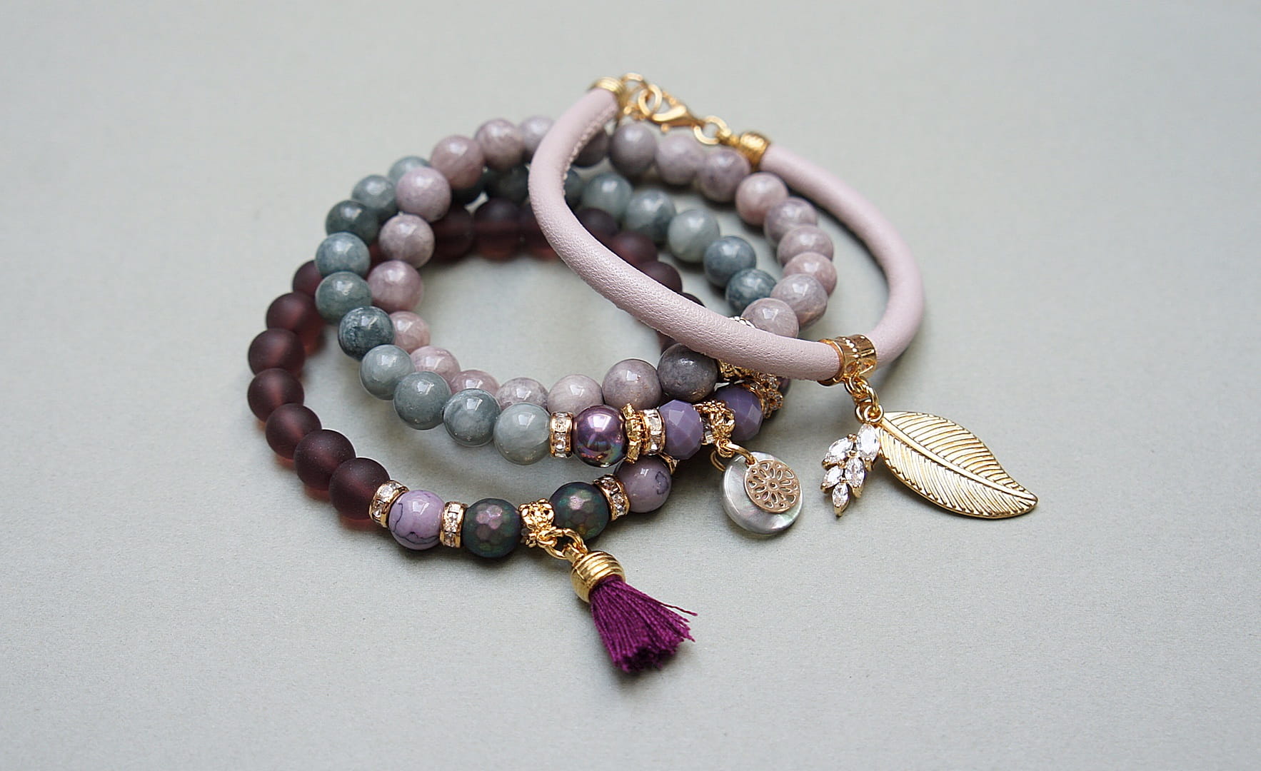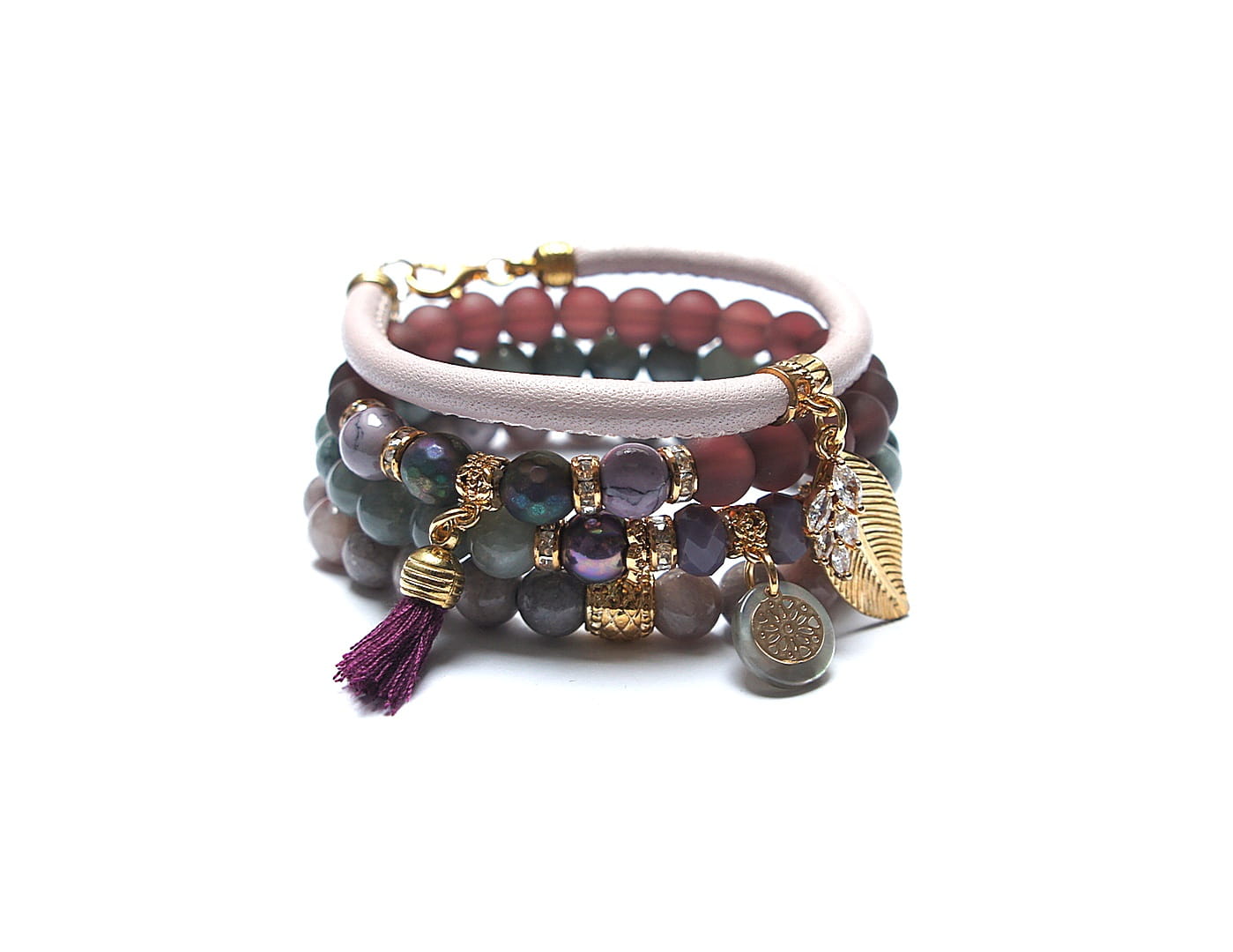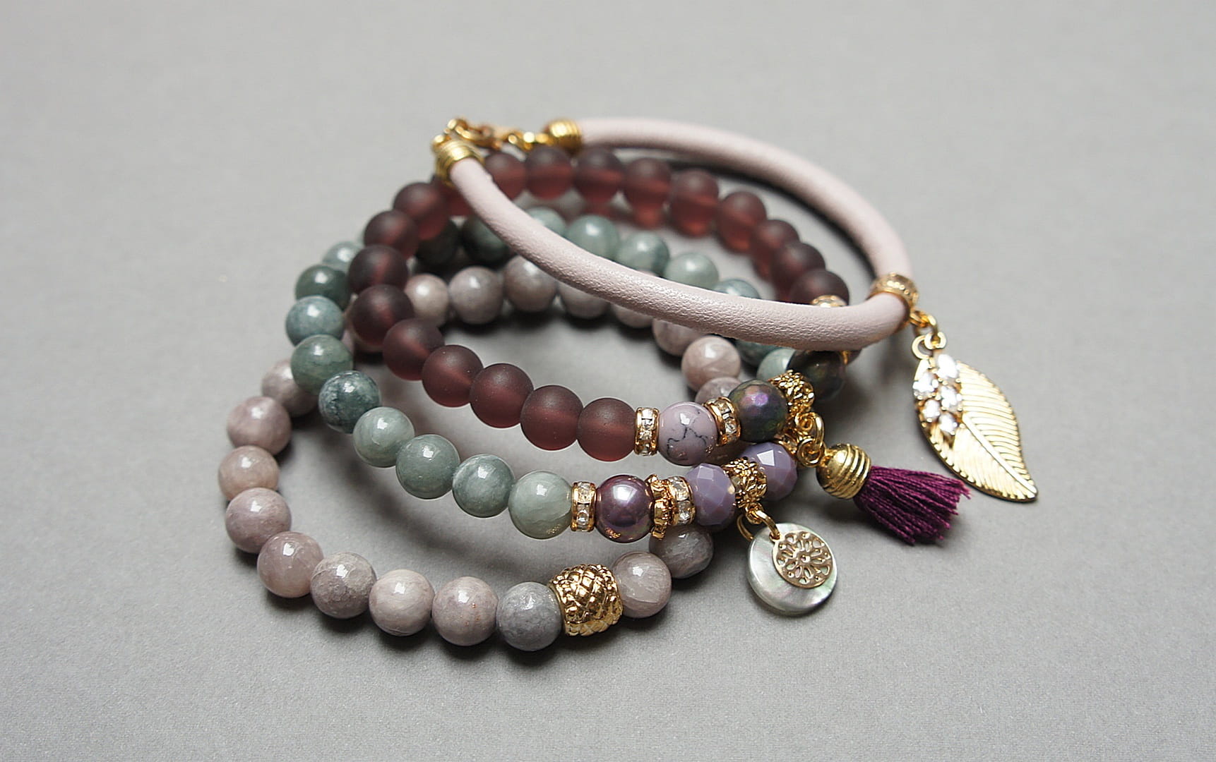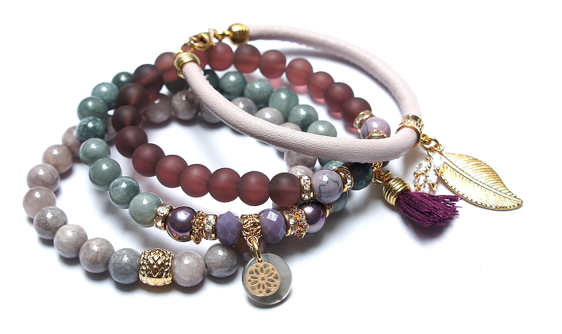 Komplet czterech bransoletek wykonanych z naturalnych kamieni - agat platerowany [8mm], jaspis [8mm], marmur [8mm], howlit [9mm], pereł majorka [8mm], matowego szkła [8mm], rzemienia z ekologicznej skóry, chwostu, zawieszki z żywicy, zawieszki wysadzanej cyrkoniami oraz elementów metalowych w kolorze złotym. Bransoletki pasują na nadgarstek 15,5-16,5cm.
