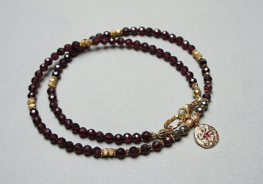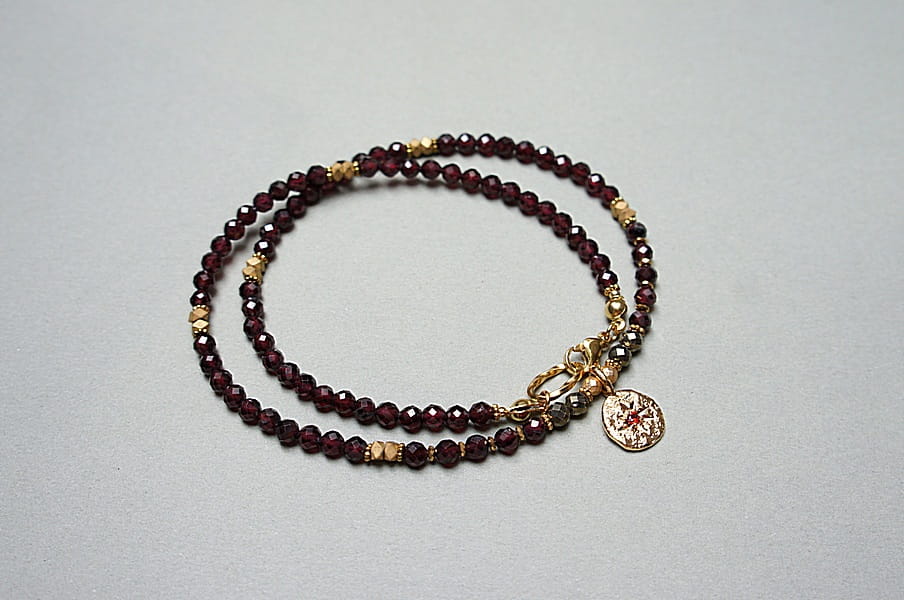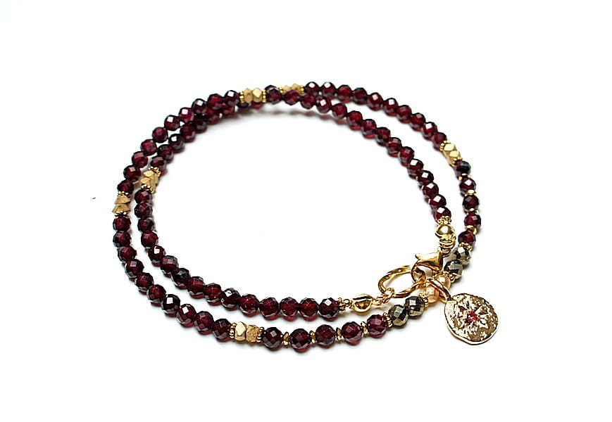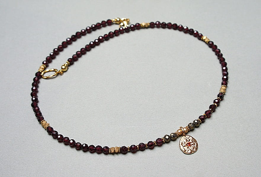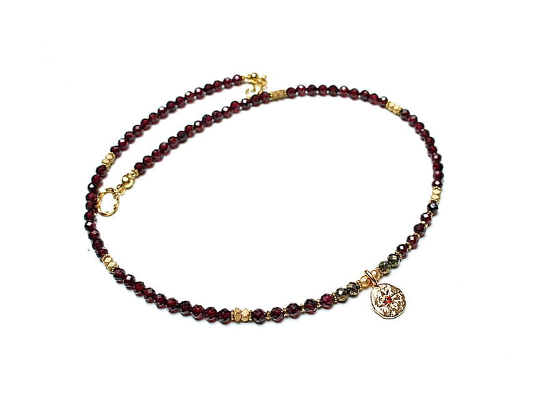 Krótki, delikatny naszyjnik wykonany w całości z pozłacanej stali szlachetnej oraz naturalnych, szlachetnych kamieni - fasetowane granaty [3,5mm], piryt fasetowany o surowym wyglądzie [3mm], przekładek z hematytu [3 x 2mm, 1mm oraz 3mm] oraz zawieszki z platerowanego mosiądzu z osadzoną cyrkonią. Naszyjnik o długości ok. 43cm.