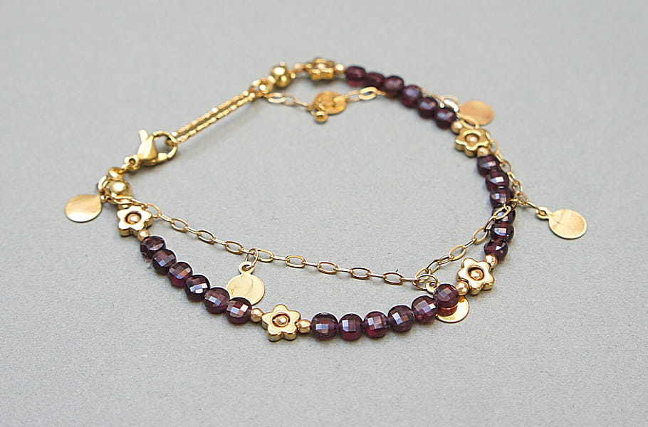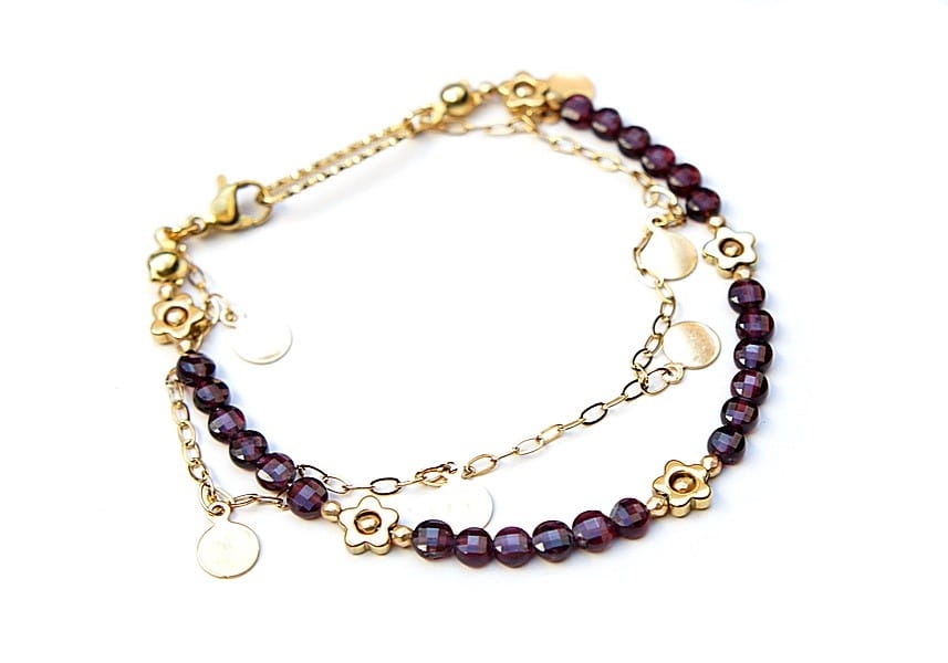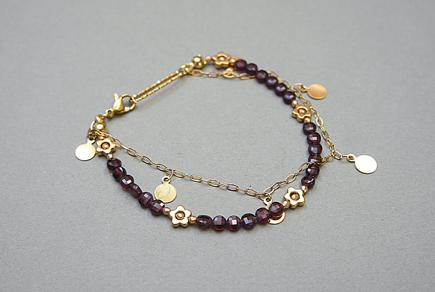 Delikatna bransoletka wykonana w całości ze stali szlachetnej pozłacanej oraz naturalnych, szlachetnych kamieni - fasetowanych monetek granatu [4mm], kwiatków z hematytu [6mm], przekładek z hematytu [2mm]. Całkowita długość bransoletki: ok. 18cm.
