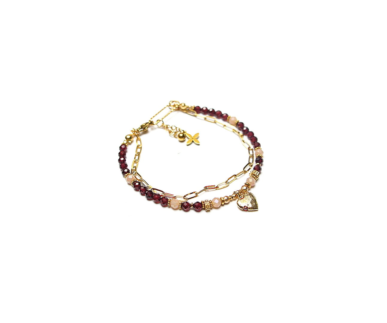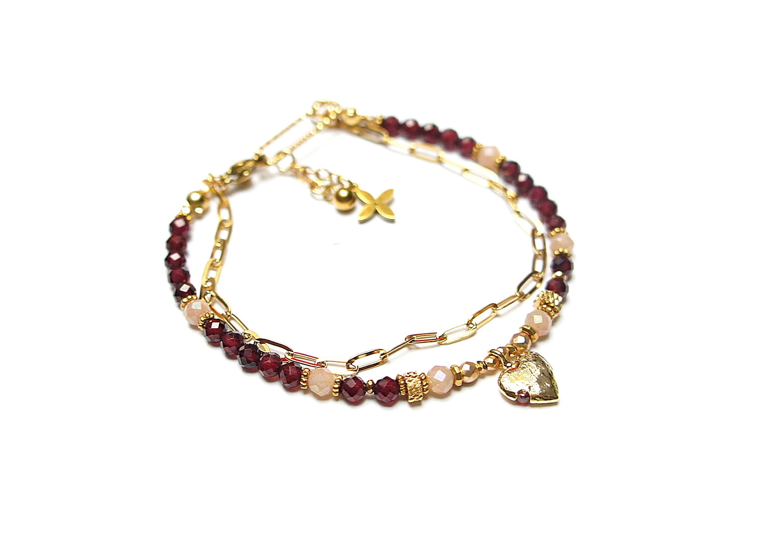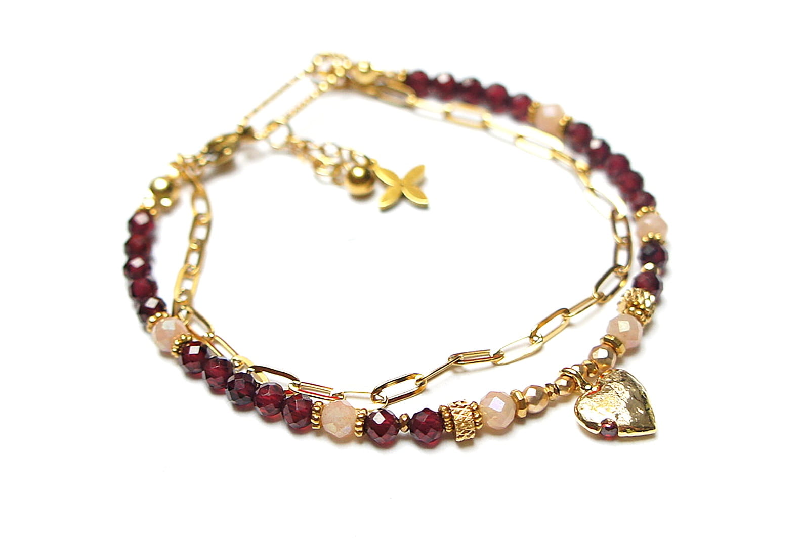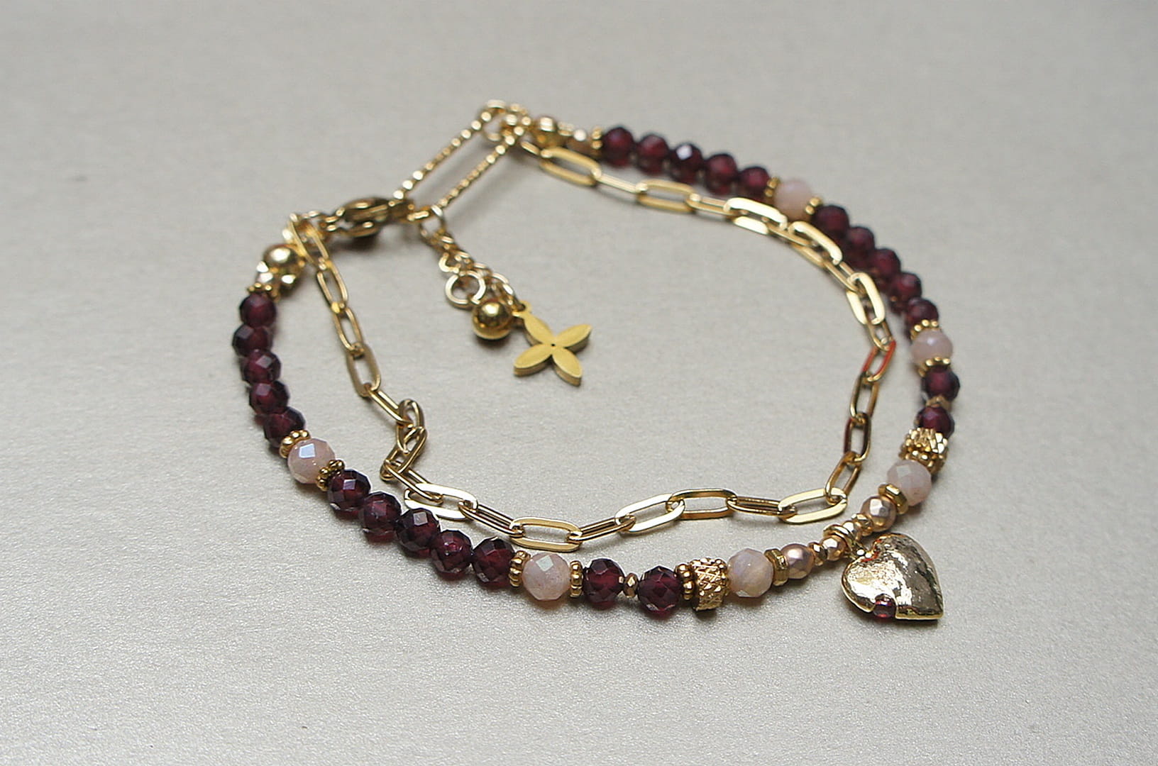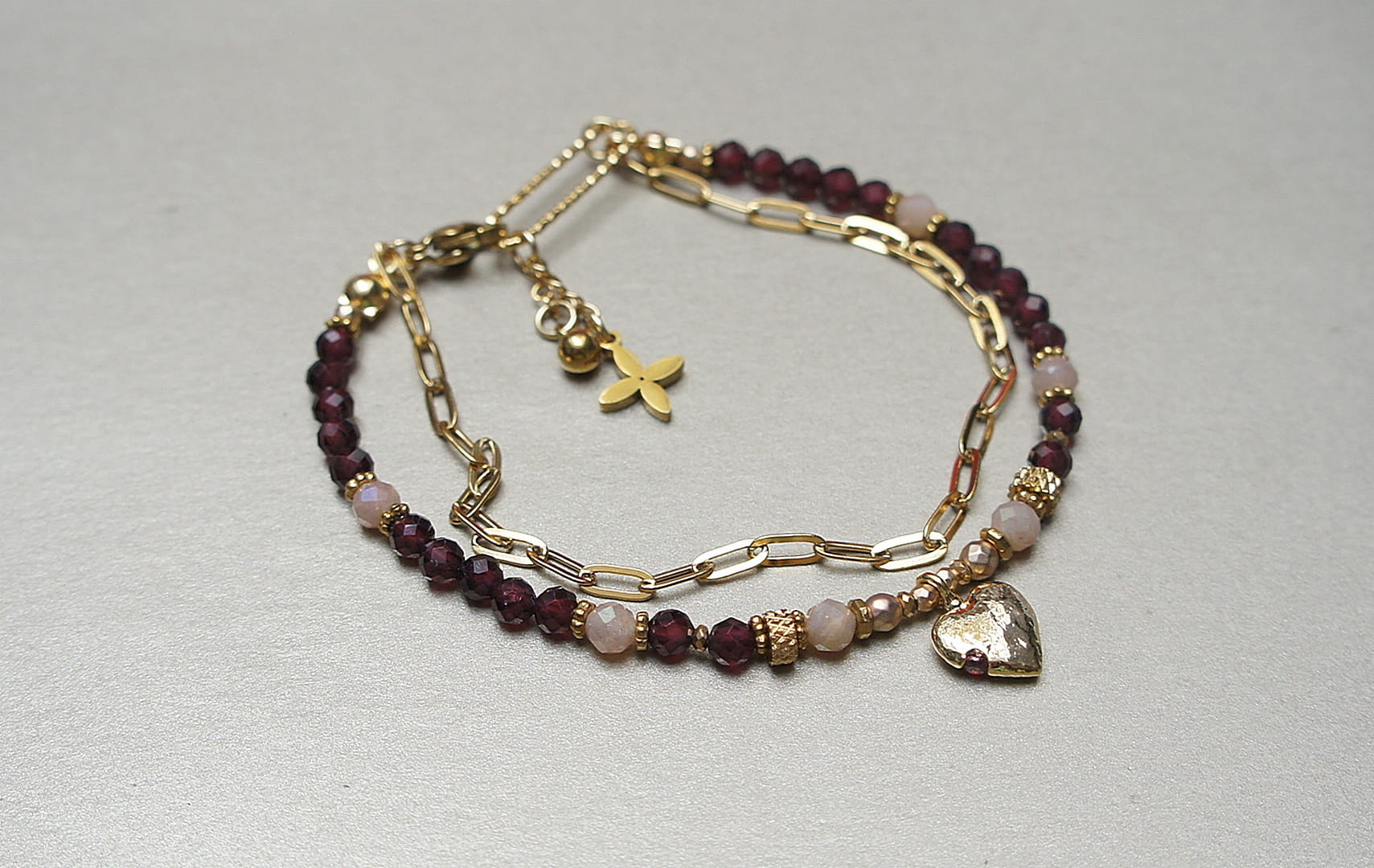 Delikatna bransoletka wykonana w całości ze stali szlachetnej pozłacanej oraz naturalnych, szlachetnych kamieni - granat fasetowany [4mm], kamień słoneczny fasetowany [4mm], hematyt fasetowany, platerowany [2mm i 3mm], przekładek z hematytu [1mm]. Całkowita długość bransoletki: ok. 19,5cm.