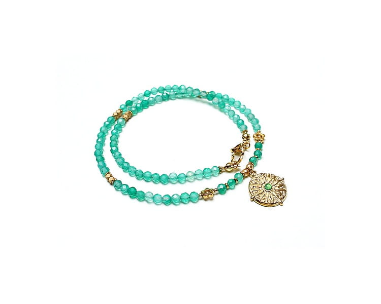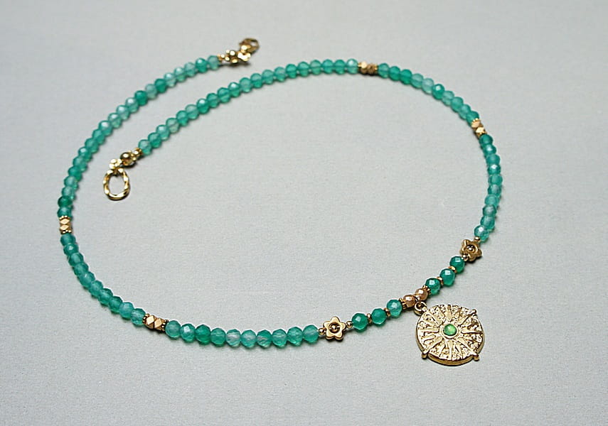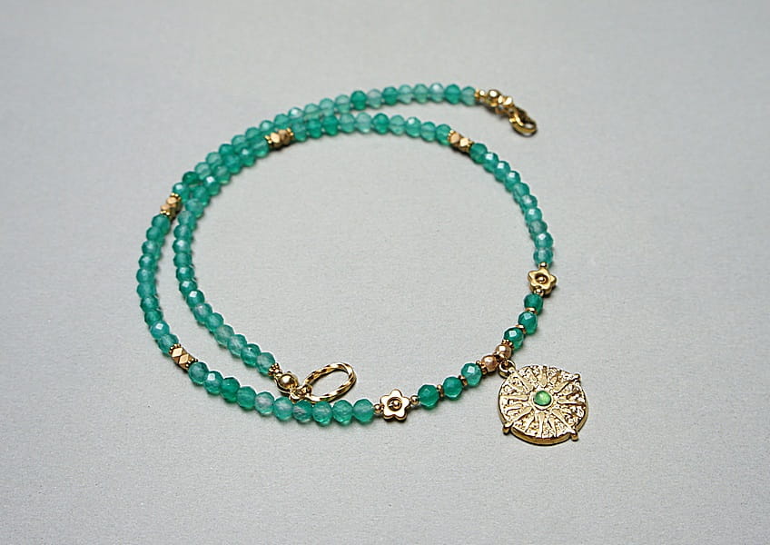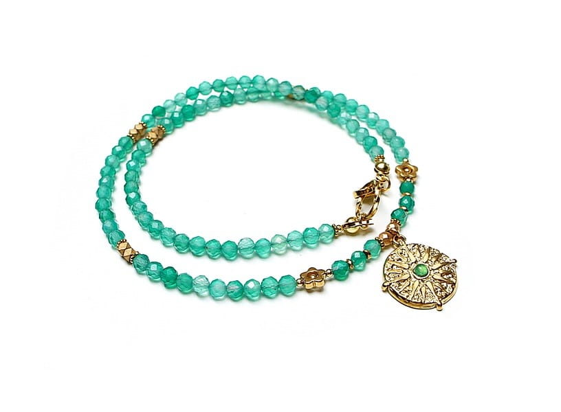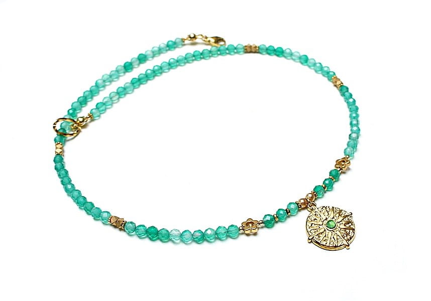 Krótki, delikatny naszyjnik wykonany w całości z pozłacanej stali szlachetnej oraz naturalnych kamieni - fasetowanych, zielonych onyksów [4mm], przekładek hematytu [1mm, 3mm, 3 x 2mm oraz 6mm - kwiatki] oraz zawieszki z naturalnym kamieniem. Naszyjnik o długości ok. 42cm. Biżuteria ozdobnie zapakowana.