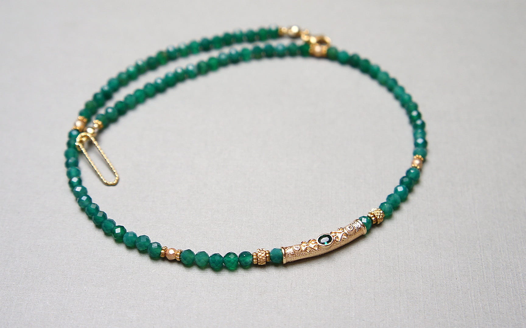 Krótki, delikatny naszyjnik wykonany z pozłacanej stali szlachetnej oraz naturalnych kamieni - zielonego onyksu fasetowanego [4mm], hematytu fasetowanego, platerowanego [3mm] oraz ozdobnej tuby wykonanej z mosiądzu platerowanego z osadzoną cyrkonią. Naszyjnik o długości ok. 42cm.