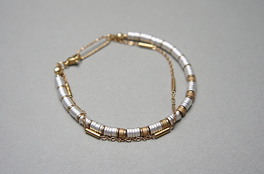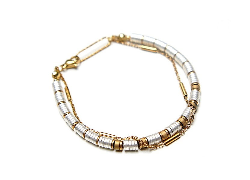 Bransoletka wykonana ze stali szlachetnej oraz naturalnych kamieni - talarków hematytu platerowanego [4 x 2mm], talarków matowego hematytu [4 x 2mm]. Całkowita długość bransoletki: 19,3cm. Biżuteria ozdobnie zapakowana.
