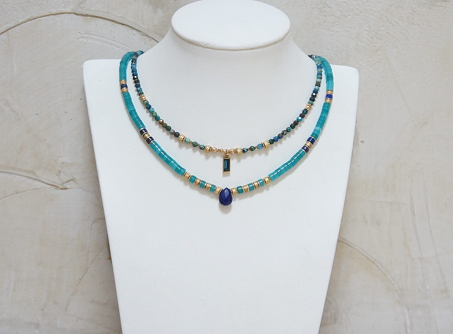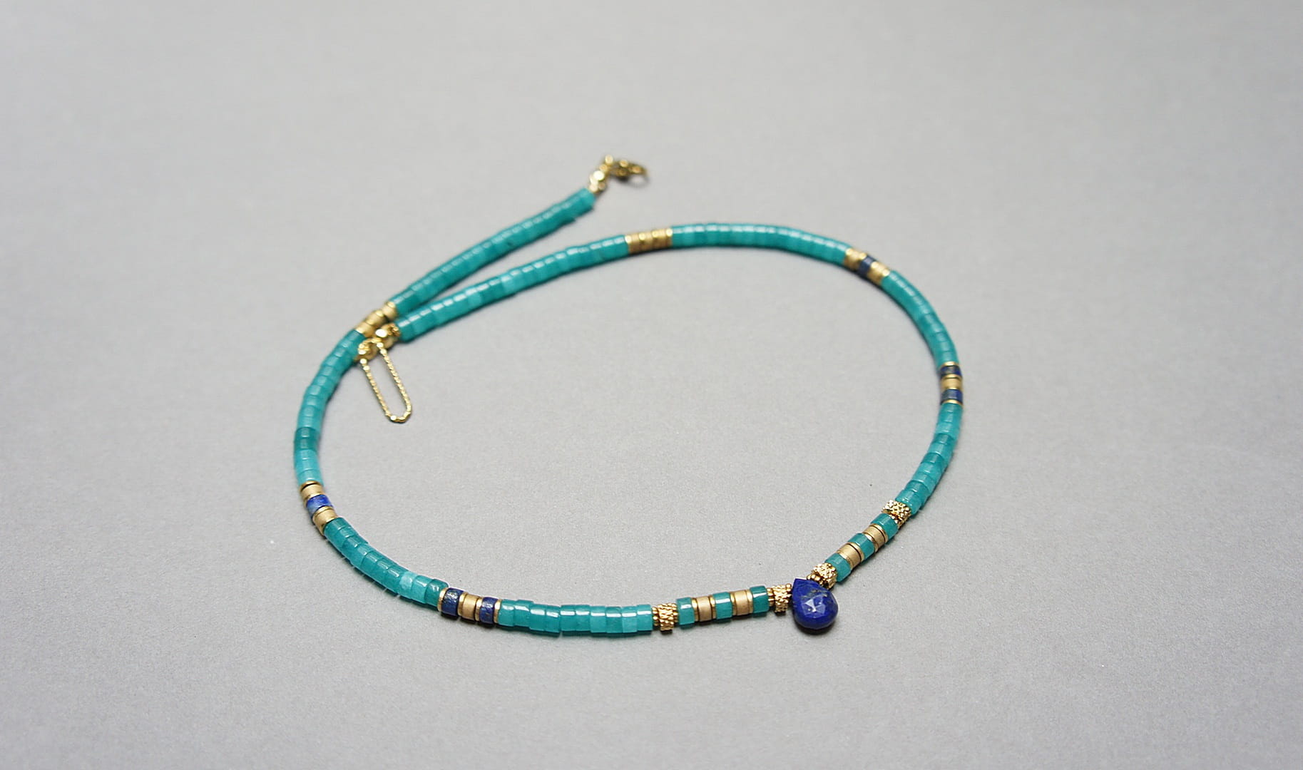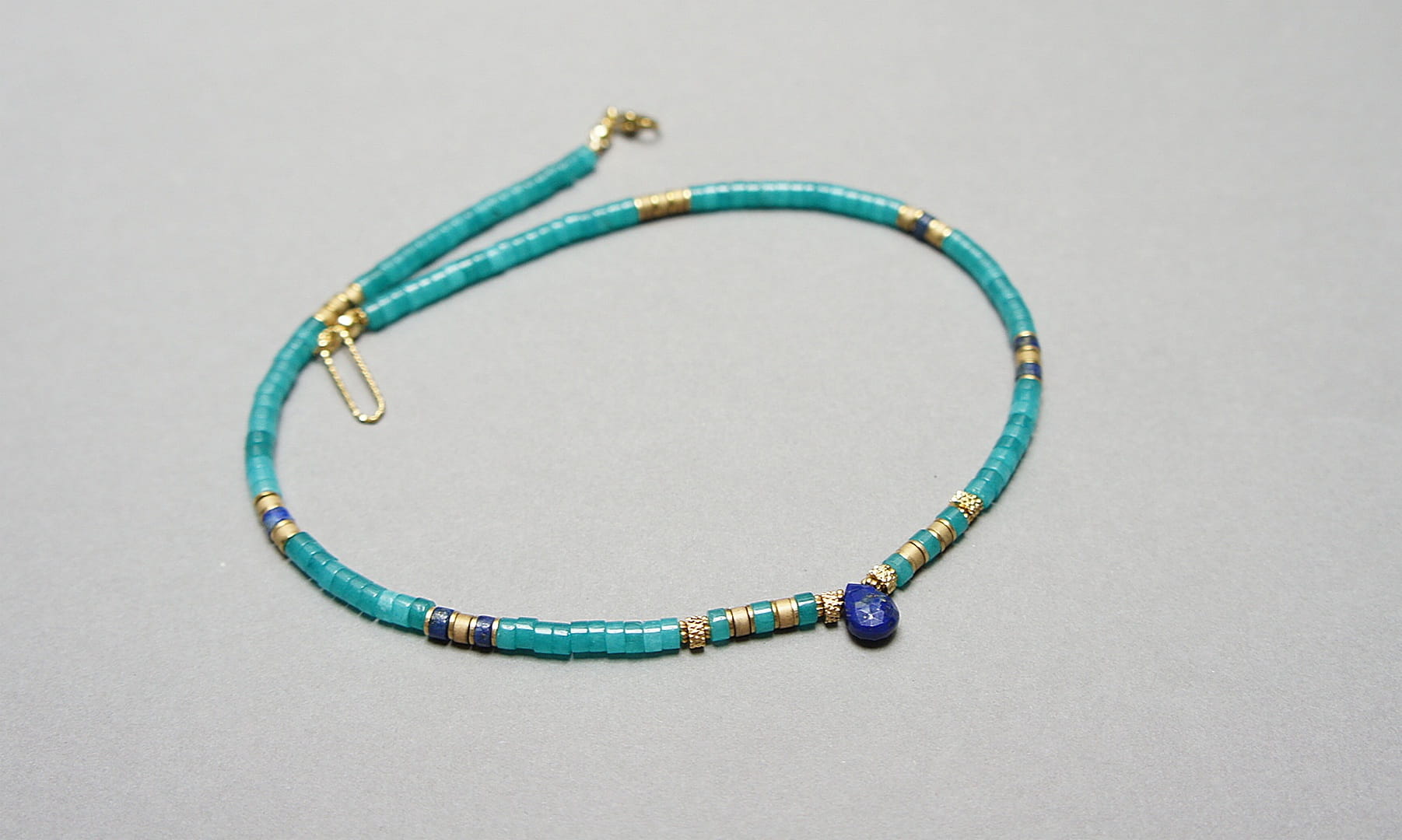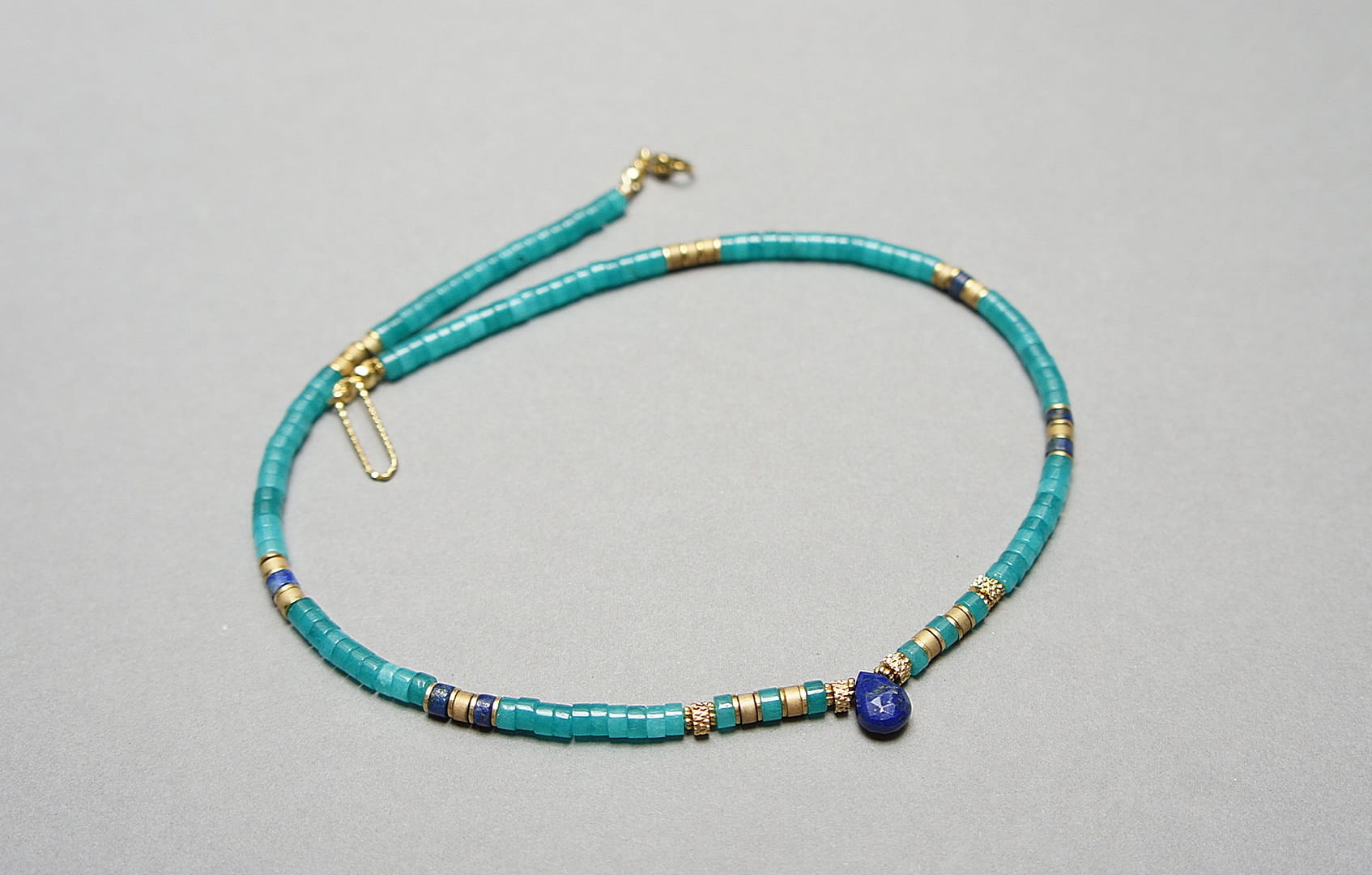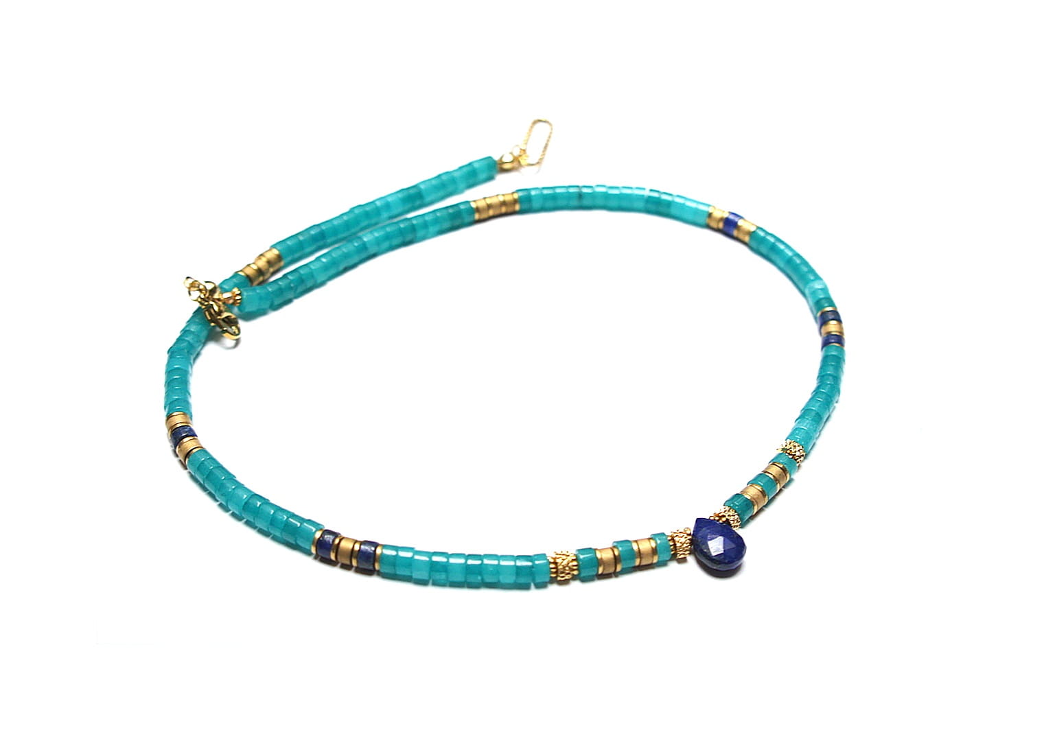 Krótki naszyjnik wykonany w całości z pozłacanej stali szlachetnej oraz kamieni - talarki jadeitu w turkusowym kolorze [4 x 2mm], talarki lapis lazuli [4 x 2mm], talarki matowego hematytu [3 x 2mm] oraz zawieszki w kształcie kropli z lapis lazuli. Naszyjnik o długości ok. 43,5cm.