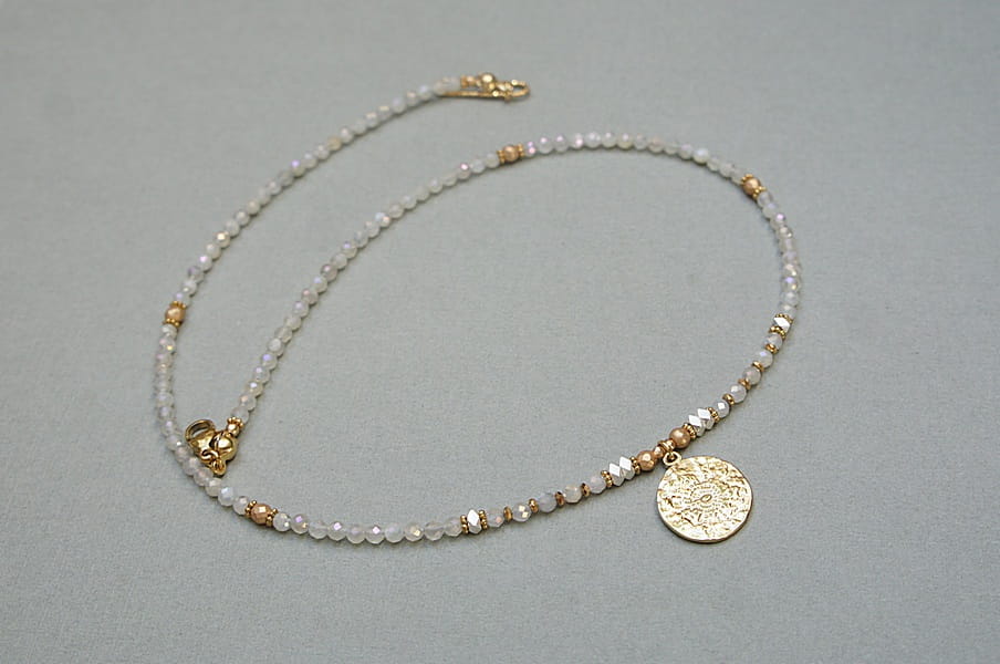 Krótki, delikatny naszyjnik wykonany w całości z pozłacanej stali szlachetnej oraz wyselekcjonowanych, naturalnych, szlachetnych kamieni - fasetowanego kamienia księżycowego galwanizowanego (piękna poświata rainbow na kamieniach) o średnicy 2,5mm, przekładek z hematytu [3 x 2mm i 3mm]. Naszyjnik o długości ok. 44,9cm. Biżuteria ozdobnie zapakowana.