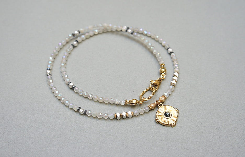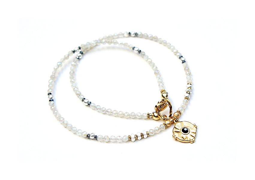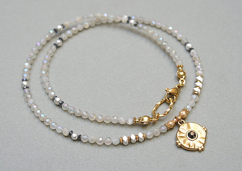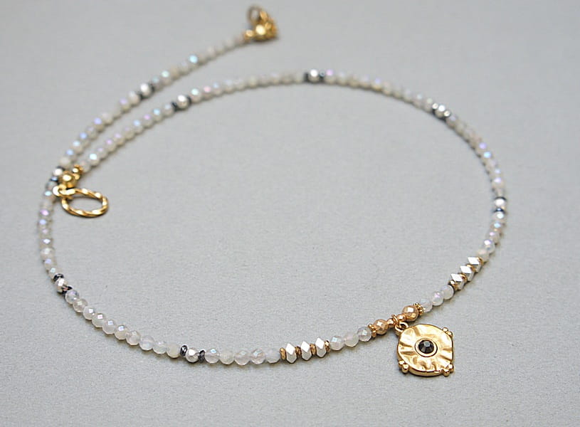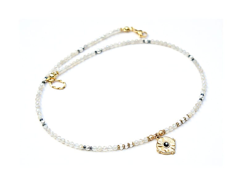 Krótki, delikatny naszyjnik wykonany w całości z pozłacanej stali szlachetnej oraz wyselekcjonowanych, naturalnych, szlachetnych kamieni - fasetowanego kamienia księżycowego galwanizowanego (piękna poświata rainbow na kamieniach) o średnicy 2,5mm, hematytu fasetowanego, platerowanego [3mm i 2mm], przekładek z hematytu [3 x 2mm i 1mm] oraz zawieszki z kryształkiem Swarovski. Naszyjnik o długości ok. 41cm. Biżuteria ozdobnie zapakowana.