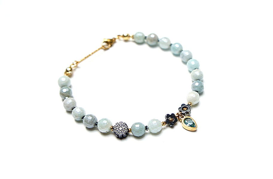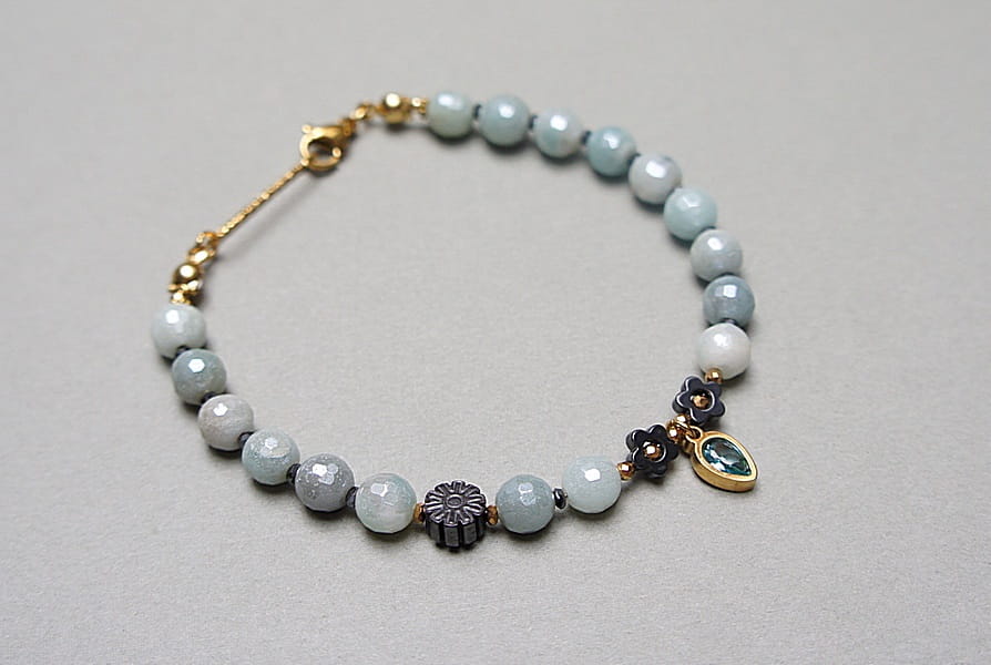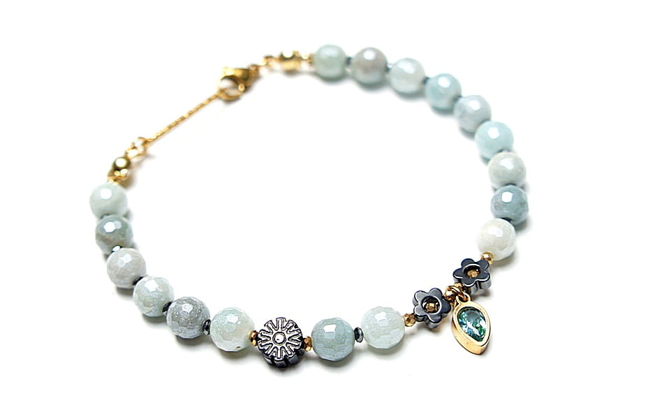 Delikatna bransoletka wykonana w całości ze stali szlachetnej pozłacanej, szlachetnych kamieni - unikatowy kamień księżycowy fasetowany, platerowany z perłową poświatą [6mm], hematyt fasetowany - kwiatki [6mm], przekładek z hematytu [1mm] oraz zawieszki z cyrkonią w okuciu. Całkowita długość bransoletki 20cm. Biżuteria ozdobnie zapakowana.