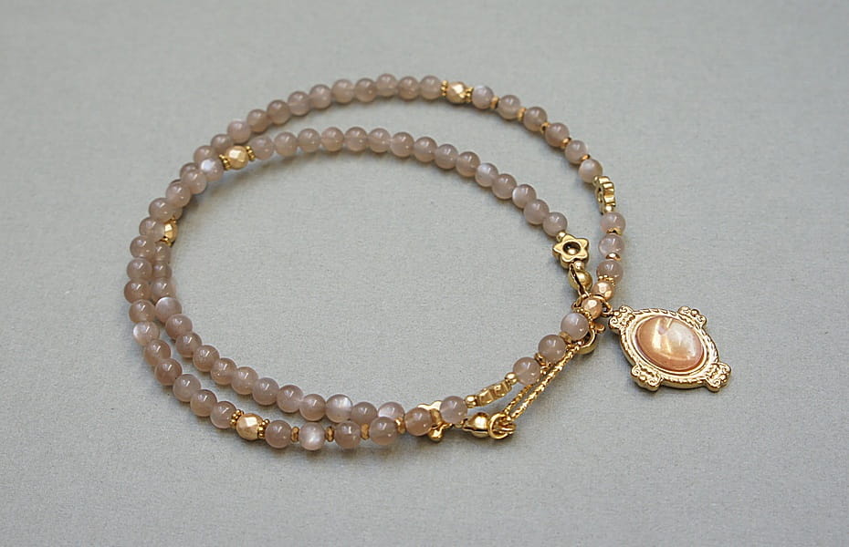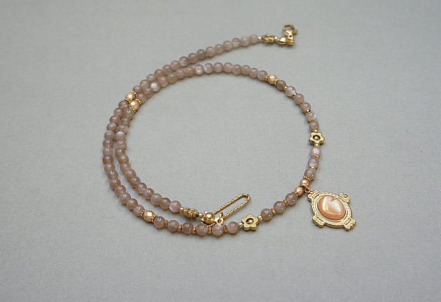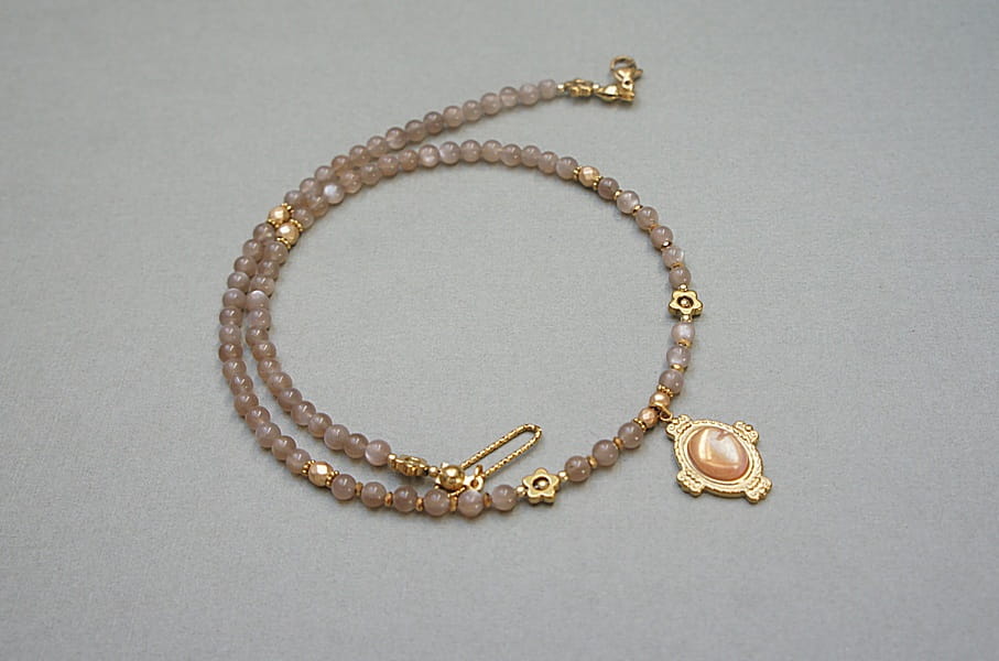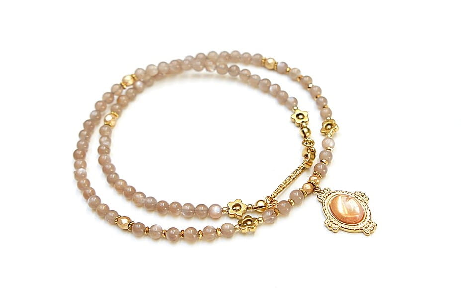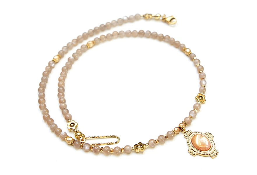 Krótki, delikatny naszyjnik wykonany w całości z pozłacanej stali szlachetnej oraz naturalnych, szlachetnych kamieni - kamienia słonecznego [4mm], przekładek z hematytu [1mm, 3mm, 4mm i 6mm] oraz zawieszki z kamieniem słonecznym. Naszyjnik o długości ok. 43cm. Biżuteria ozdobnie zapakowana.