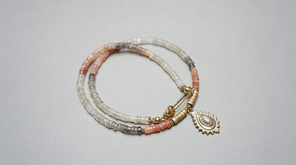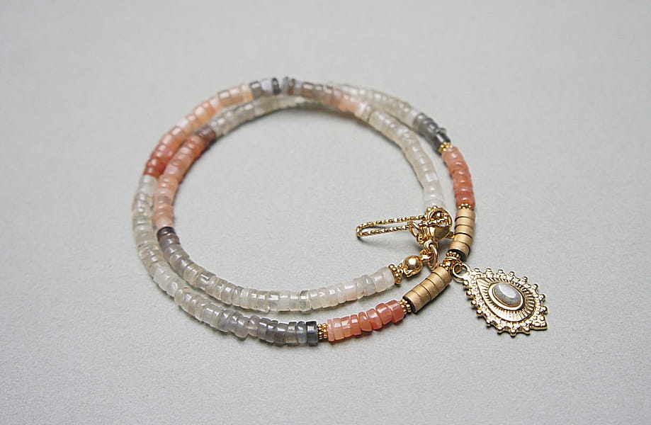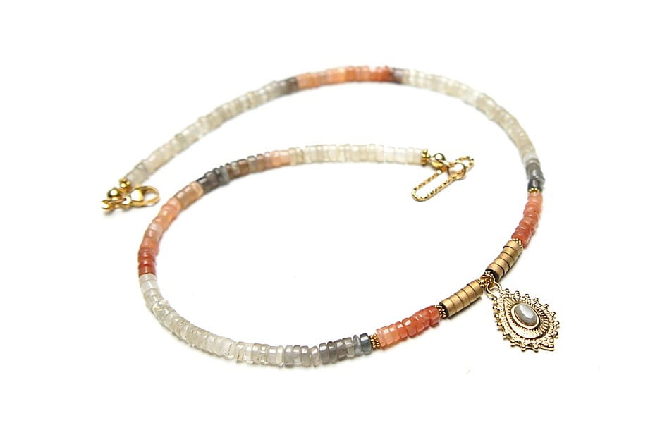 Krótki, delikatny naszyjnik wykonany w całości z pozłacanej stali szlachetnej oraz naturalnych, szlachetnych kamieni - talarki kamienia słonecznego w trzech kolorach [4 x 1-3mm], przekładek z hematytu [4mm] oraz zawieszki z labradorytem. Naszyjnik o długości ok. 41cm. Biżuteria ozdobnie zapakowana.