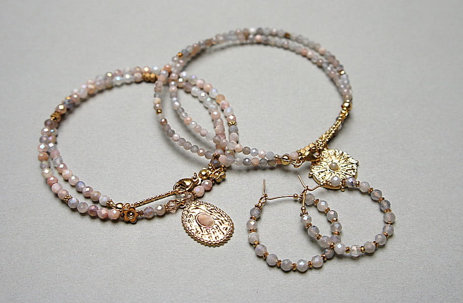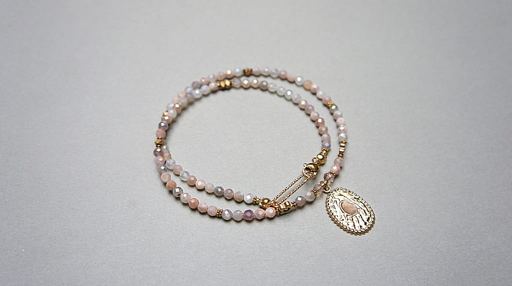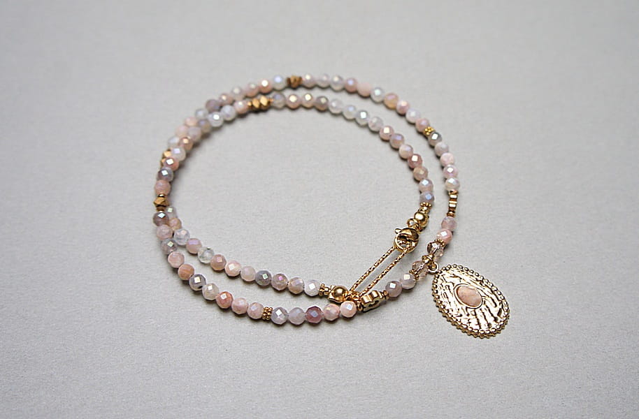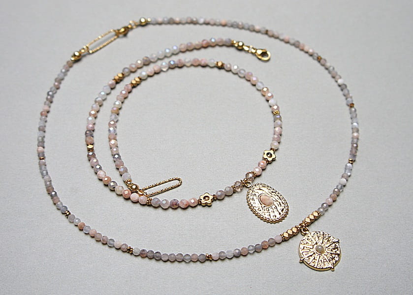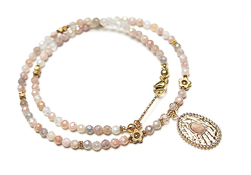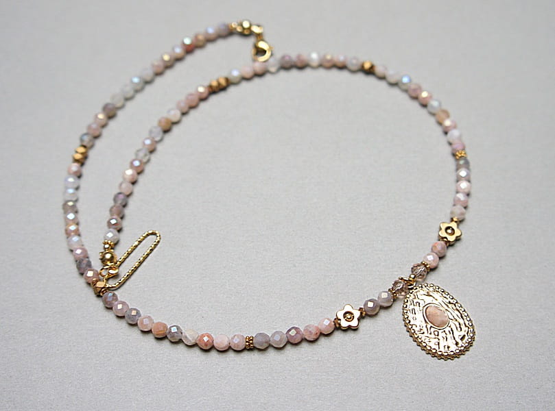 Krótki, delikatny naszyjnik wykonany w całości z pozłacanej stali szlachetnej oraz naturalnych, szlachetnych kamieni - fasetowanego kamienia słonecznego dodatkowo platerowanego dzięki czemu na kamieniach uzyskana została tęczowa poświata [4mm], przekładek z hematytu [1mm, 3 x 2mm oraz 6mm - kwiatki], fasetowanych kryształków [4mm] oraz zawieszki z naturalnym kamieniem. Naszyjnik o długości ok. 43cm. Biżuteria ozdobnie zapakowana.
