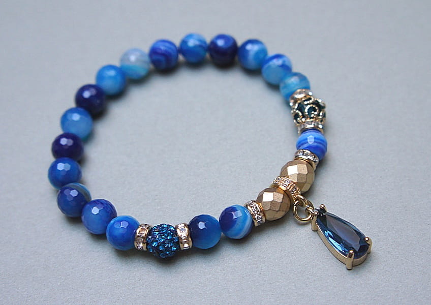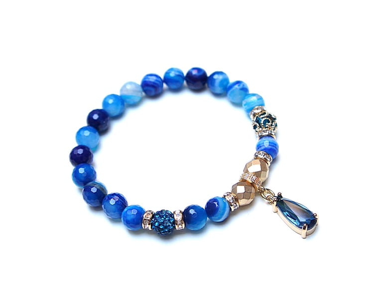 Bransoletka wykonana z kamieni naturalnych - agat botswana fasetowany [8mm], tygrysie oko fasetowane [8mm], hematyt fasetowany, platerowany [8mm], zawieszki z cyrkonią w okuciu, przekładki shamballa wysadzanej kryształkami [8mm] oraz elementów metalowych w kolorze złota. Bransoletka na gumce silikonowej. Pasuje na nadgarstek 16-17cm.