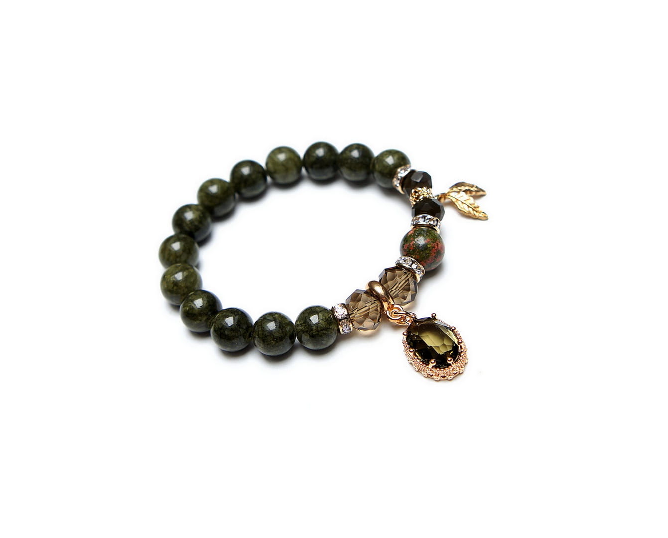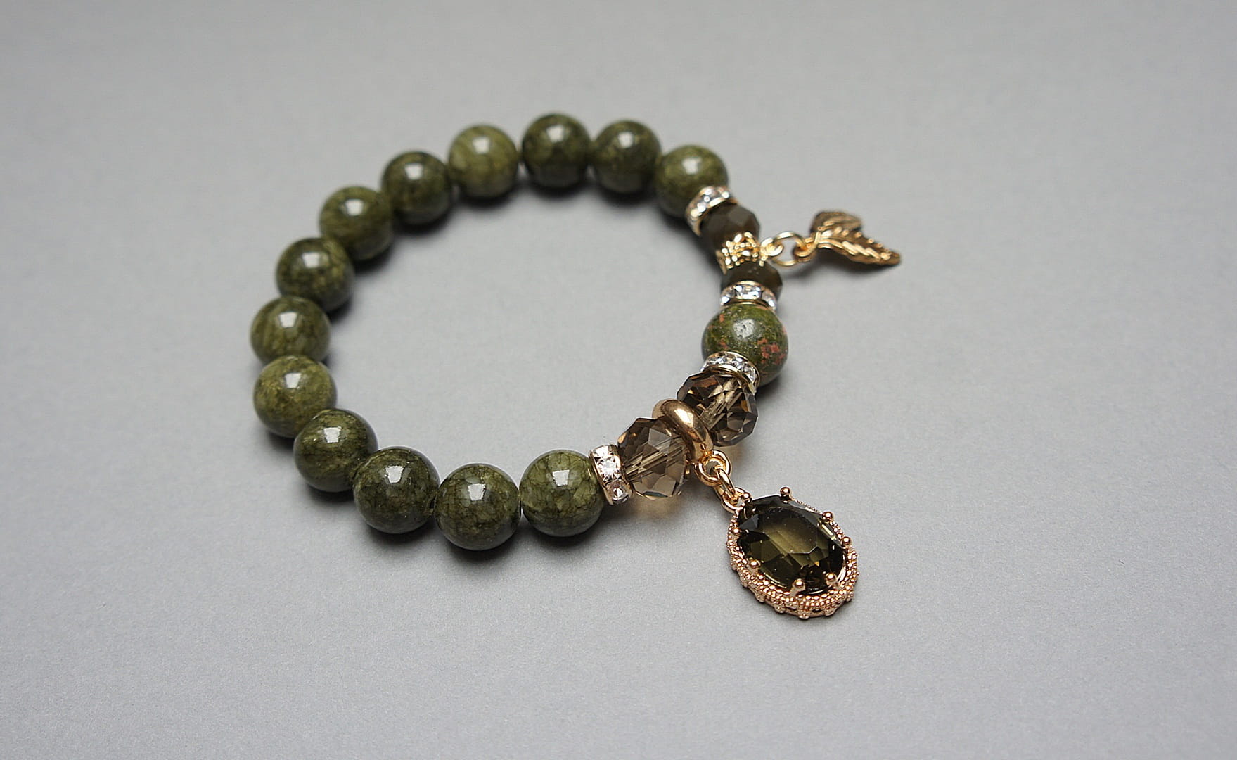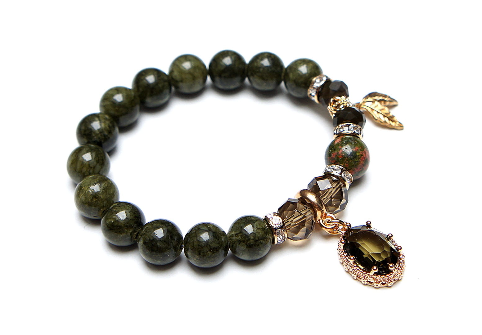 Bransoletka wykonana z kamieni naturalnych - marmur [10mm], unakit [10mm], zawieszki z kryształem w okuciu, kryształków fasetowanych [10mm] oraz elementów metalowych w kolorze złota. Bransoletka na gumce silikonowej. Pasuje na nadgarstek 15-16cm.