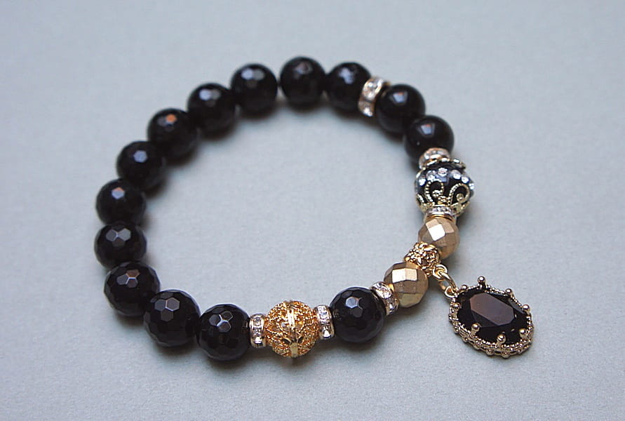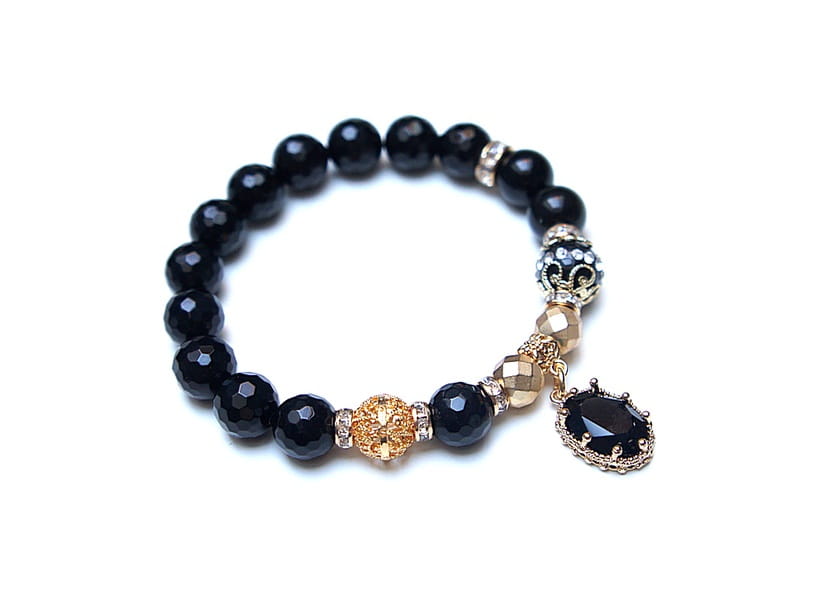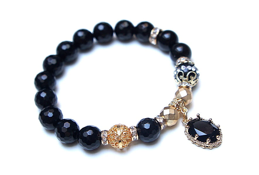 Bransoletka wykonana z kamieni naturalnych - onyks fasetowany [10mm], onyks wysadzany cyrkoniami [10mm], hematytów platerowanych, fasetowanych [8mm], zawieszki z cyrkonią w okuciu oraz elementów metalowych w kolorze złota. Bransoletka na gumce silikonowej. Pasuje na nadgarstek 16-17cm.