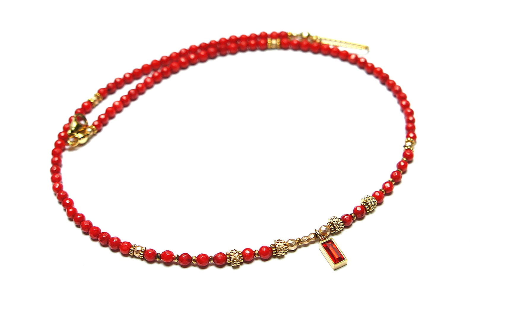Krótki, delikatny naszyjnik wykonany w całości z pozłacanej stali szlachetnej oraz naturalnych, szlachetnych kamieni - fasetowanych, kuleczek korala [3mm], hematytu fasetowanego, platerowanego [2mm i 3mm], przekładek z hematytu [1mm] oraz zawieszki z cyrkonią w okuciu. Naszyjnik o długości ok. 42,3cm.