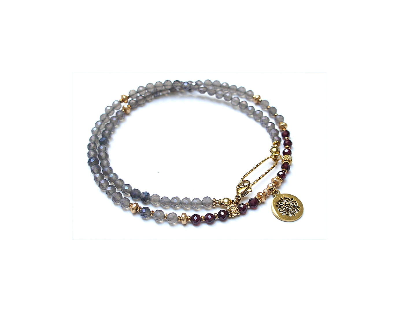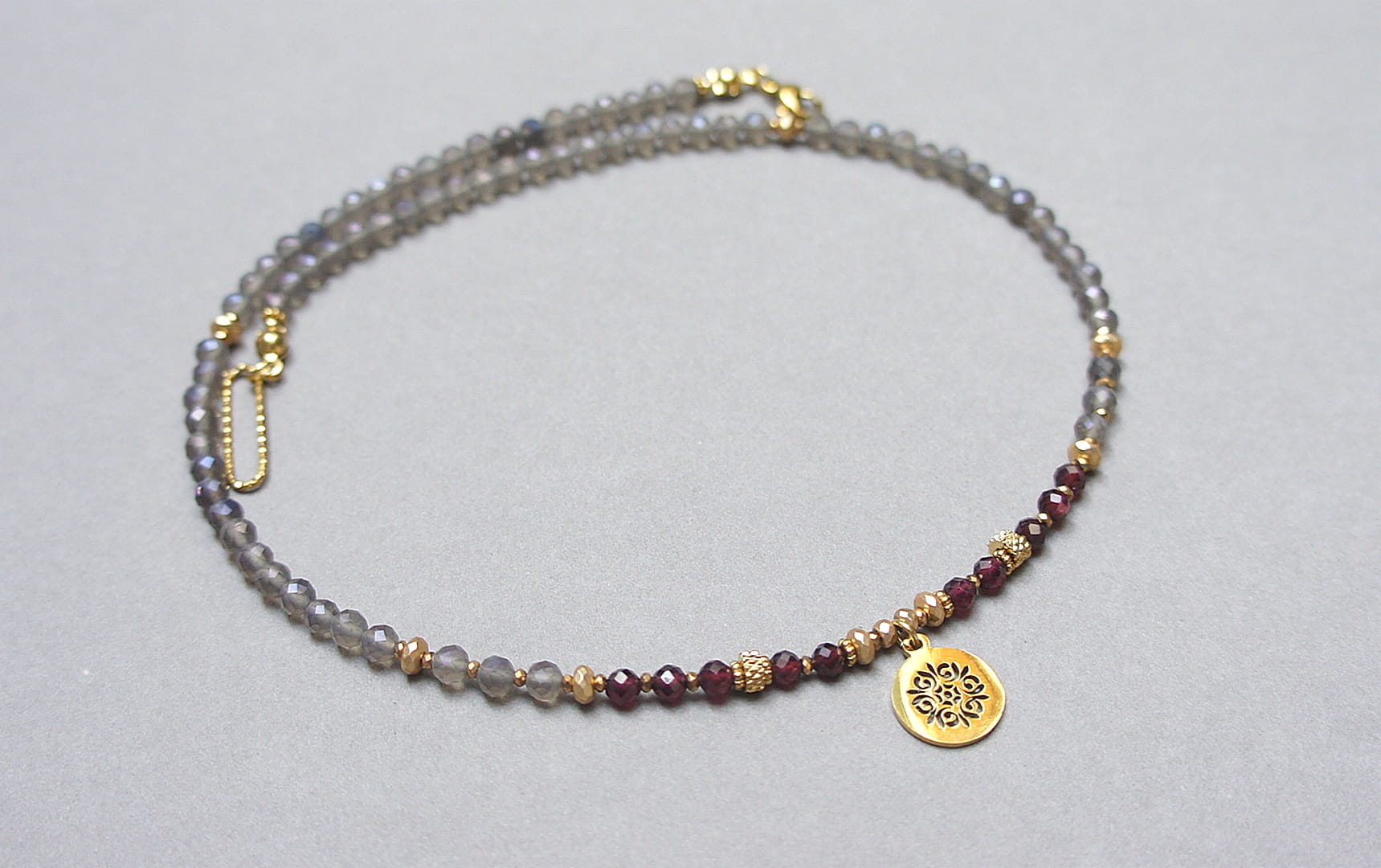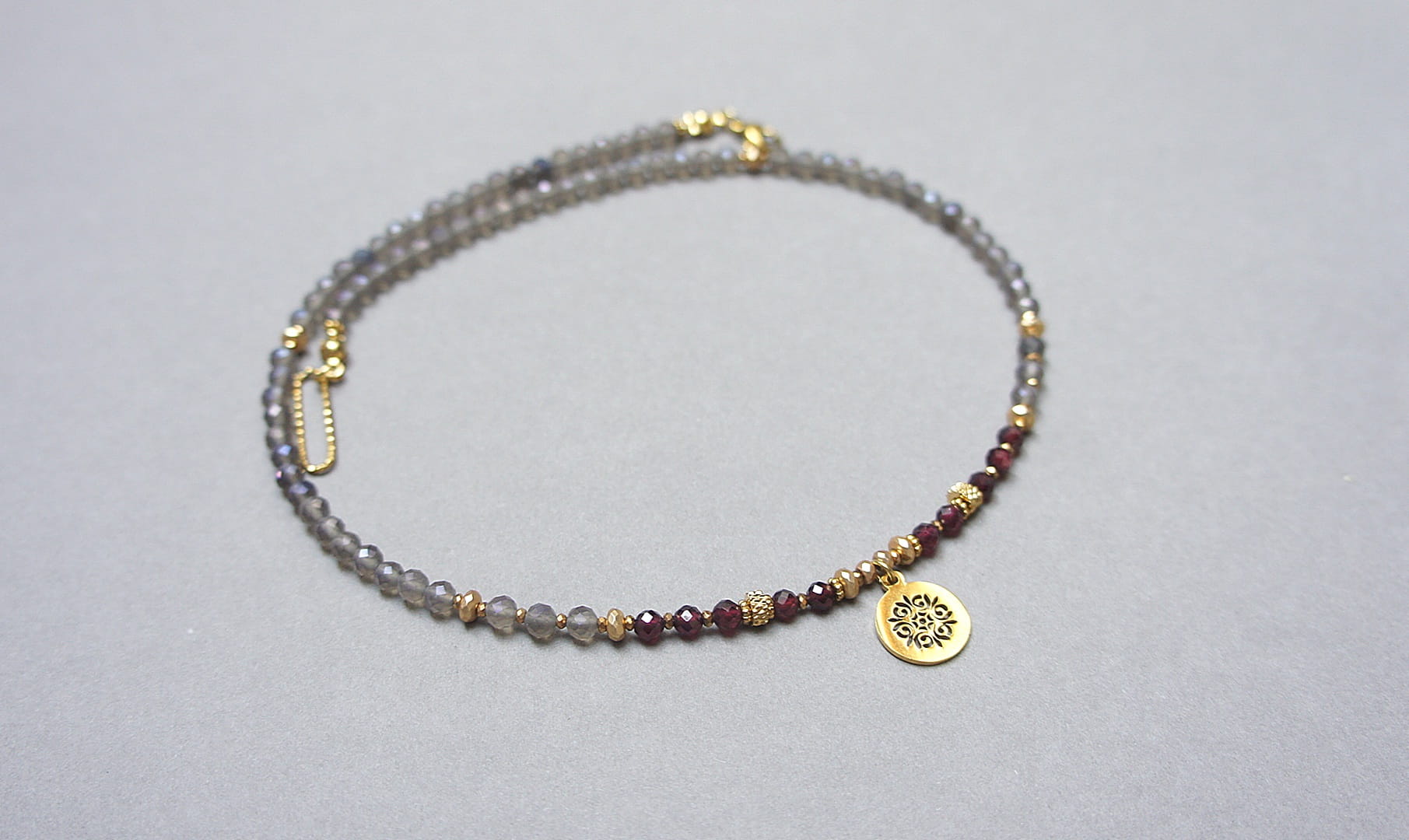 Krótki, delikatny naszyjnik wykonany w całości z pozłacanej stali szlachetnej oraz naturalnych, szlachetnych kamieni - fasetowanych, kuleczek kwarcu dymnego [3mm], fasetowanych kuleczek granatu [3,5mm], hematytu fasetowanego, platerowanego [3x2mm i 2x1mm], przekładek z hematytu [1mm]. Naszyjnik o długości ok. 43cm.