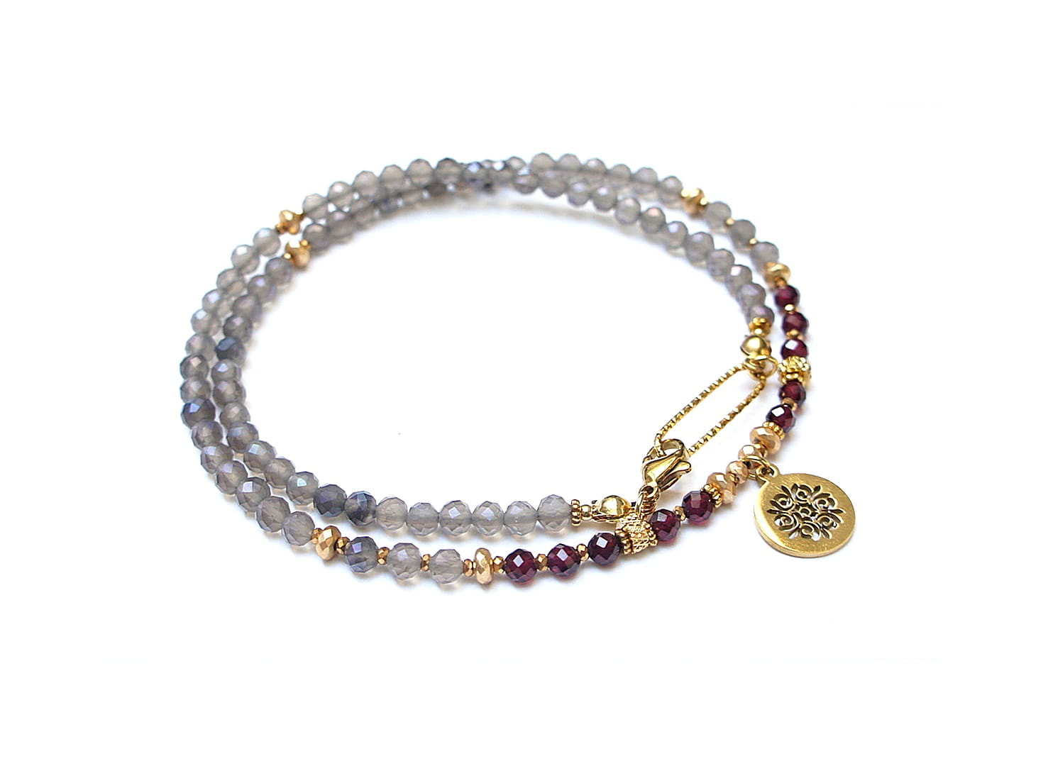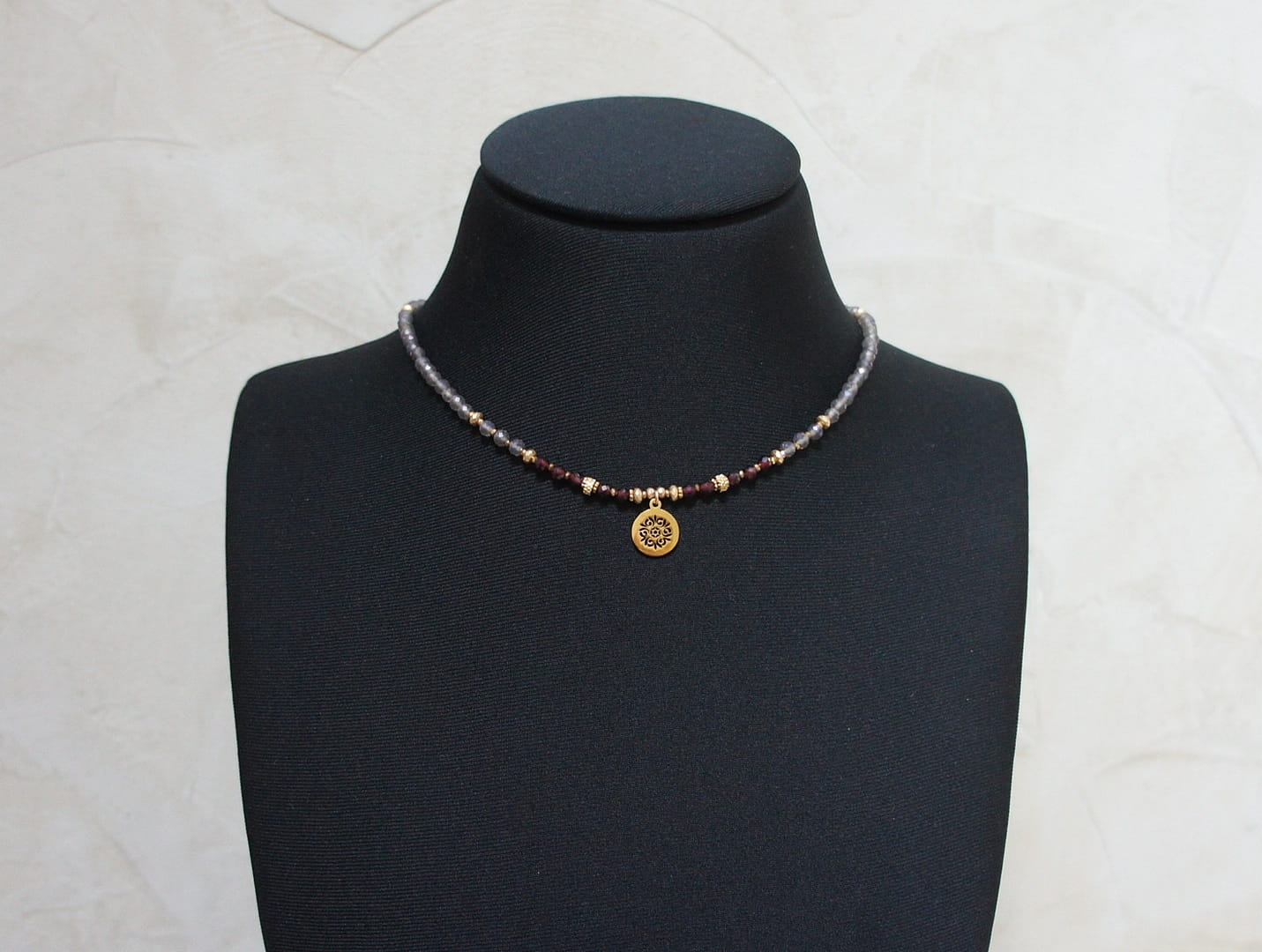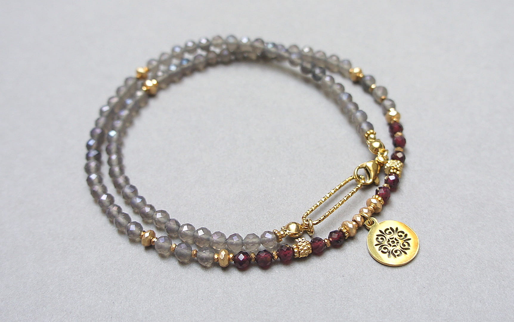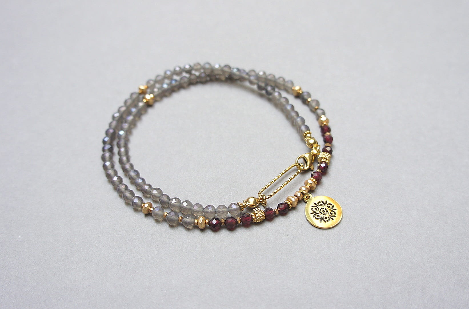 Krótki, delikatny naszyjnik wykonany w całości z pozłacanej stali szlachetnej oraz naturalnych, szlachetnych kamieni - fasetowanych, kuleczek kwarcu dymnego [3mm], fasetowanych kuleczek granatu [3,5mm], hematytu fasetowanego, platerowanego [3x2mm i 2x1mm], przekładek z hematytu [1mm]. Naszyjnik o długości ok. 43cm.