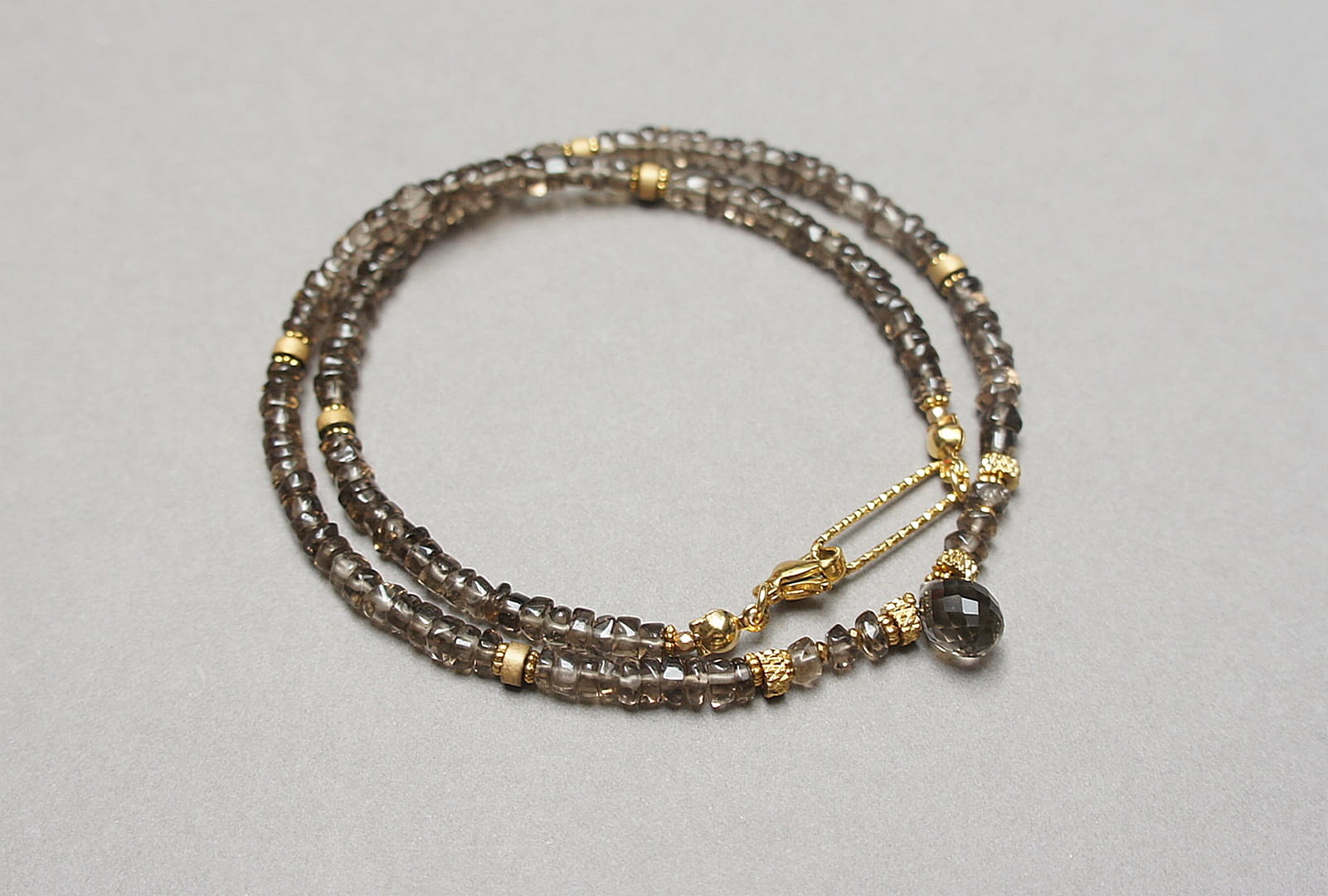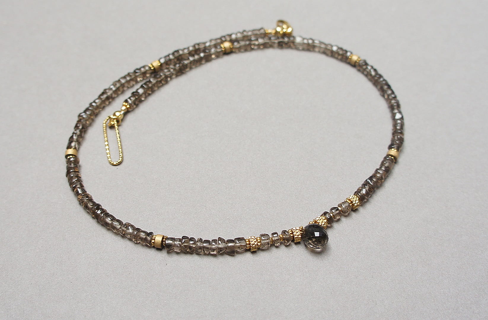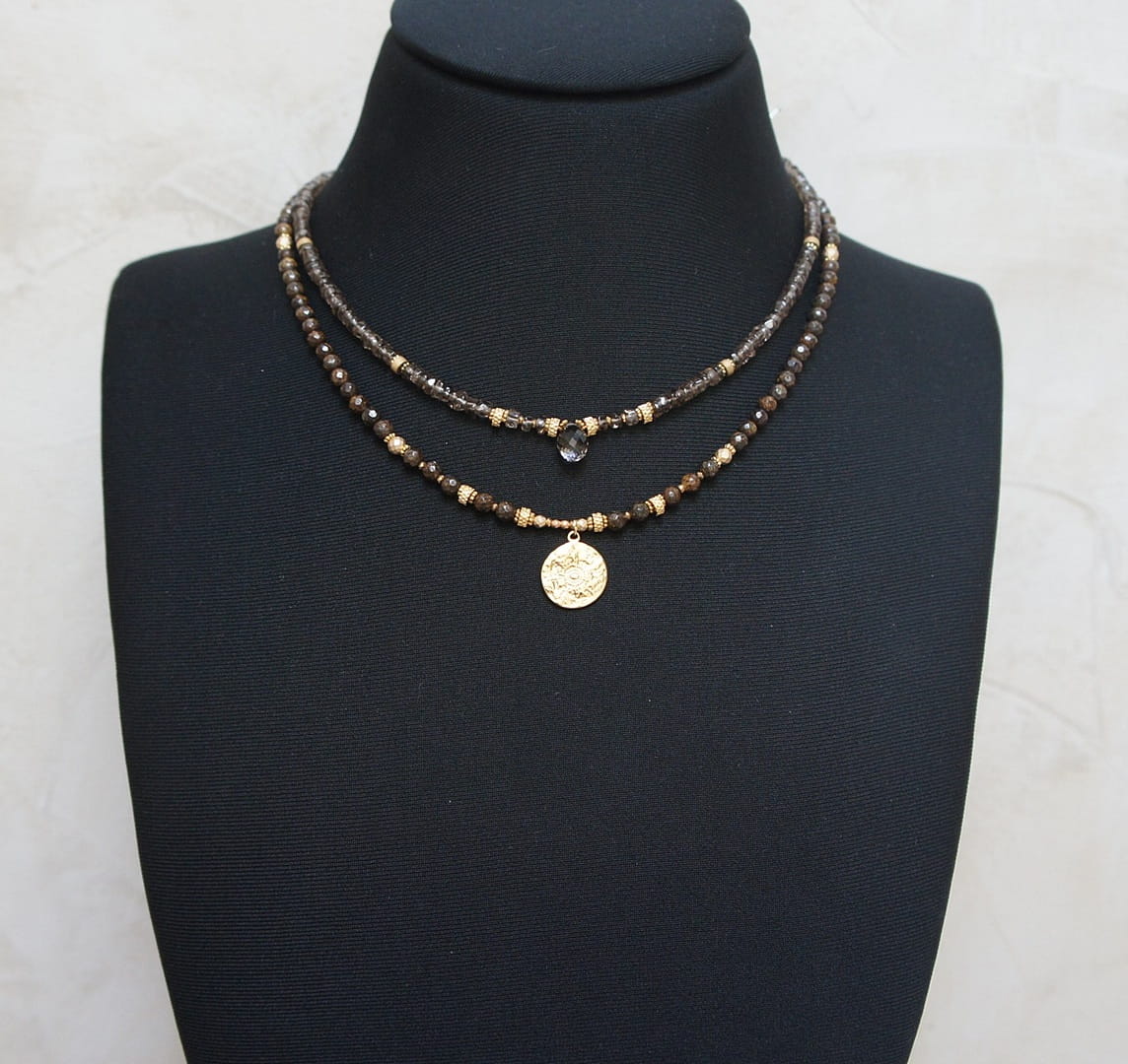 Krótki naszyjnik wykonany w całości z pozłacanej stali szlachetnej oraz naturalnych, szlachetnych kamieni - talarki nieregularnego kwarcu dymnego [4,5 x 2-3mm], talarków matowego hematytu [4 x 2mm], przekładek z hematytu [1mm] oraz zawieszki w kształcie brioletki z kwarcu dymnego. Naszyjnik o długości ok. 42cm.
