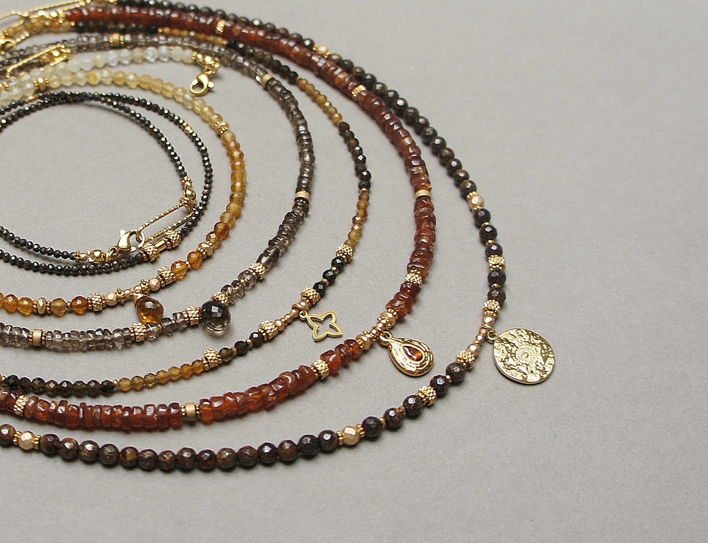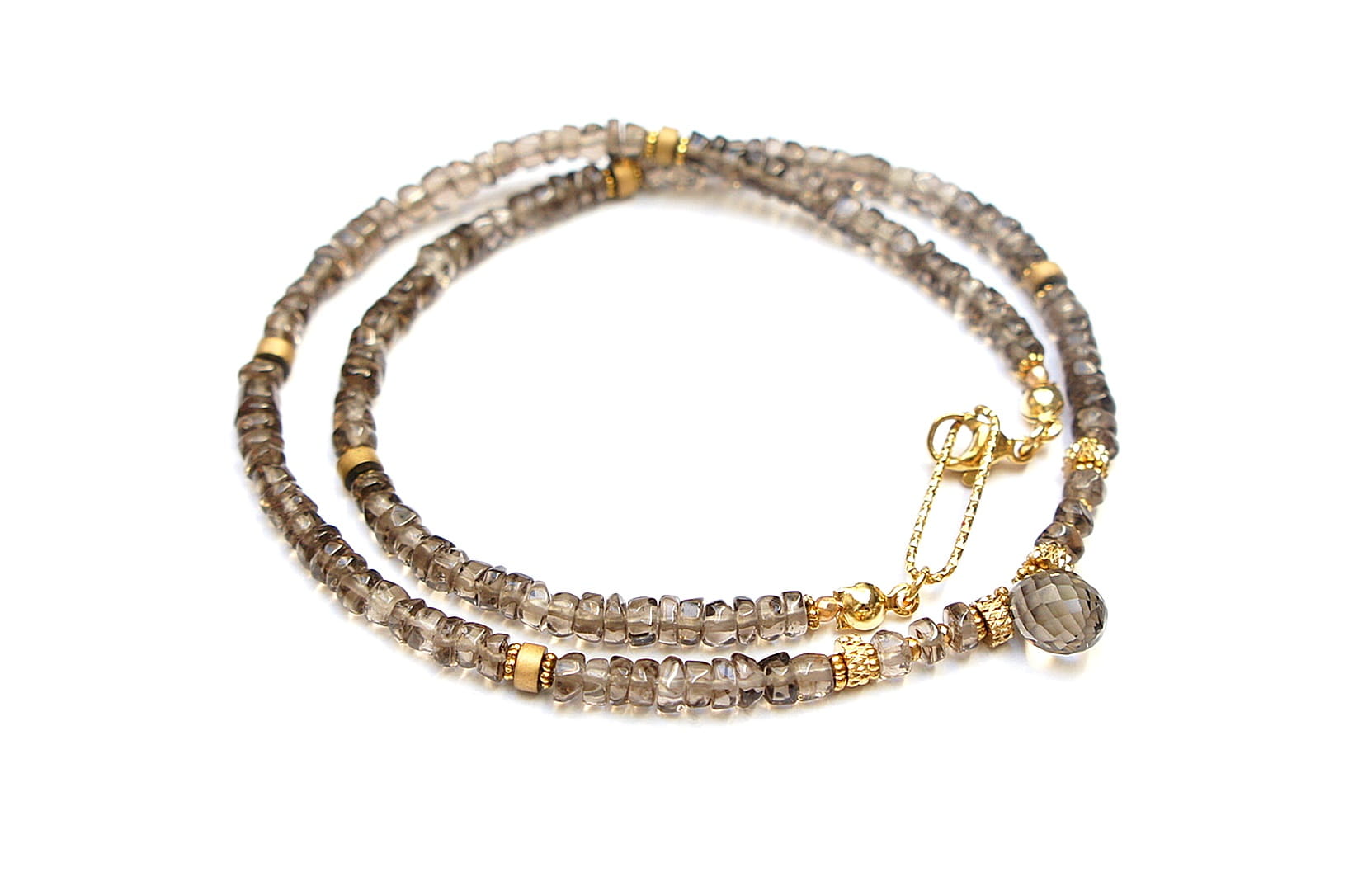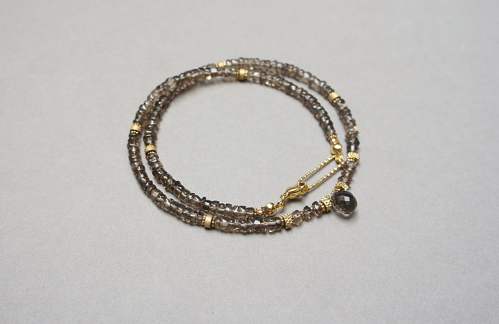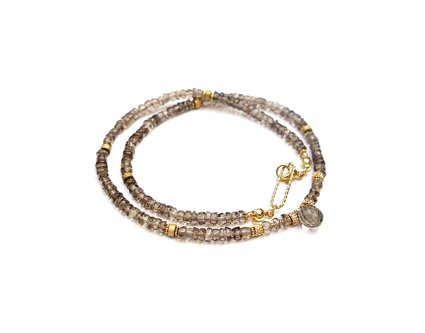 Krótki naszyjnik wykonany w całości z pozłacanej stali szlachetnej oraz naturalnych, szlachetnych kamieni - talarki nieregularnego kwarcu dymnego [4,5 x 2-3mm], talarków matowego hematytu [4 x 2mm], przekładek z hematytu [1mm] oraz zawieszki w kształcie brioletki z kwarcu dymnego. Naszyjnik o długości ok. 42cm.