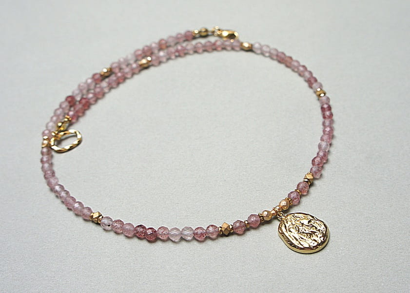 Krótki naszyjnik wykonany w całości z pozłacanej stali szlachetnej oraz kamieni naturalnych - fasetowany kwarc strawberry [4mm], przekładek z hematytu [3 x 2mm oraz 1mm], fasetowany, platerowany hematyt [3mm i 2mm]] Naszyjnik o długości ok. 43cm.