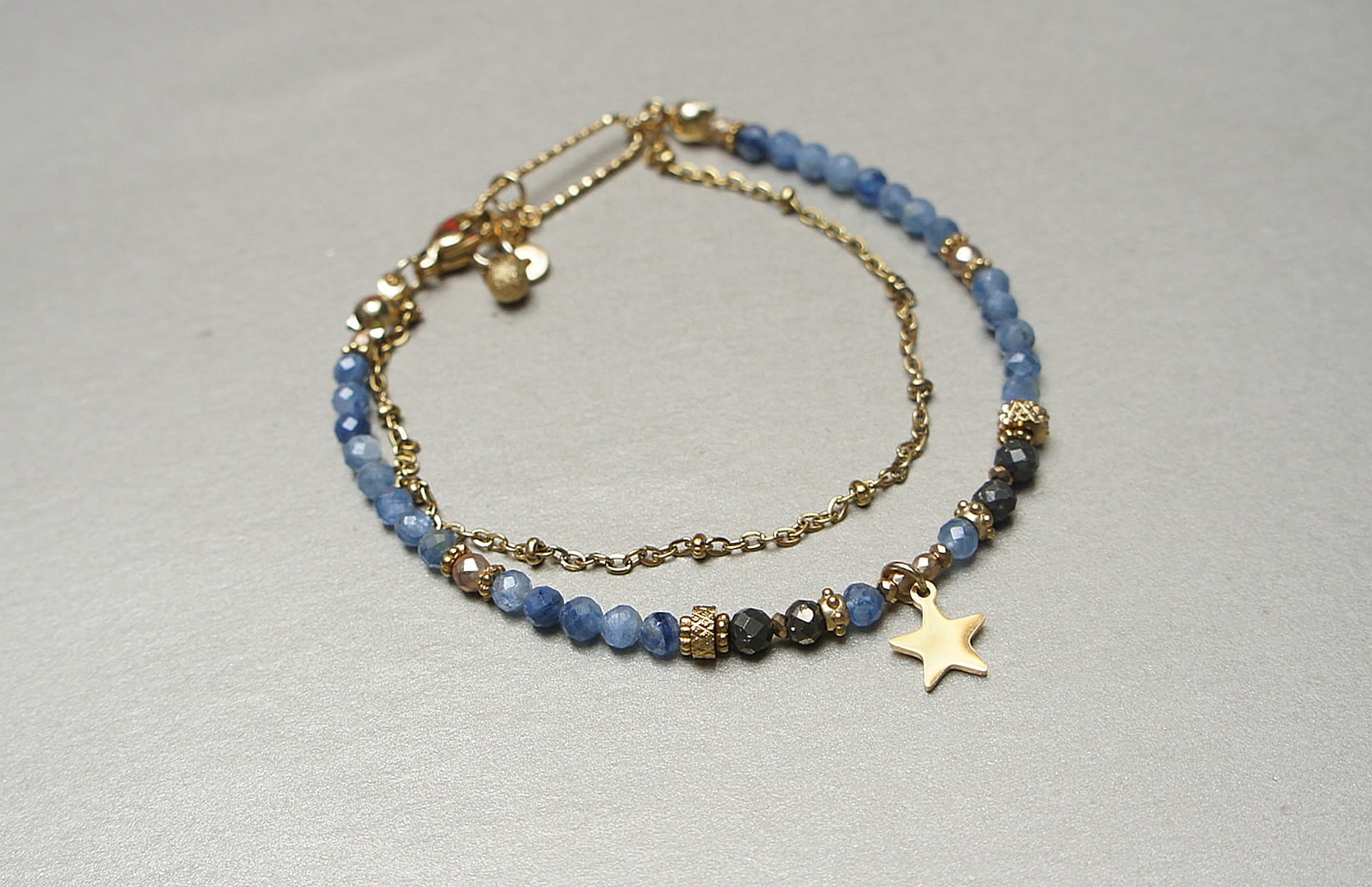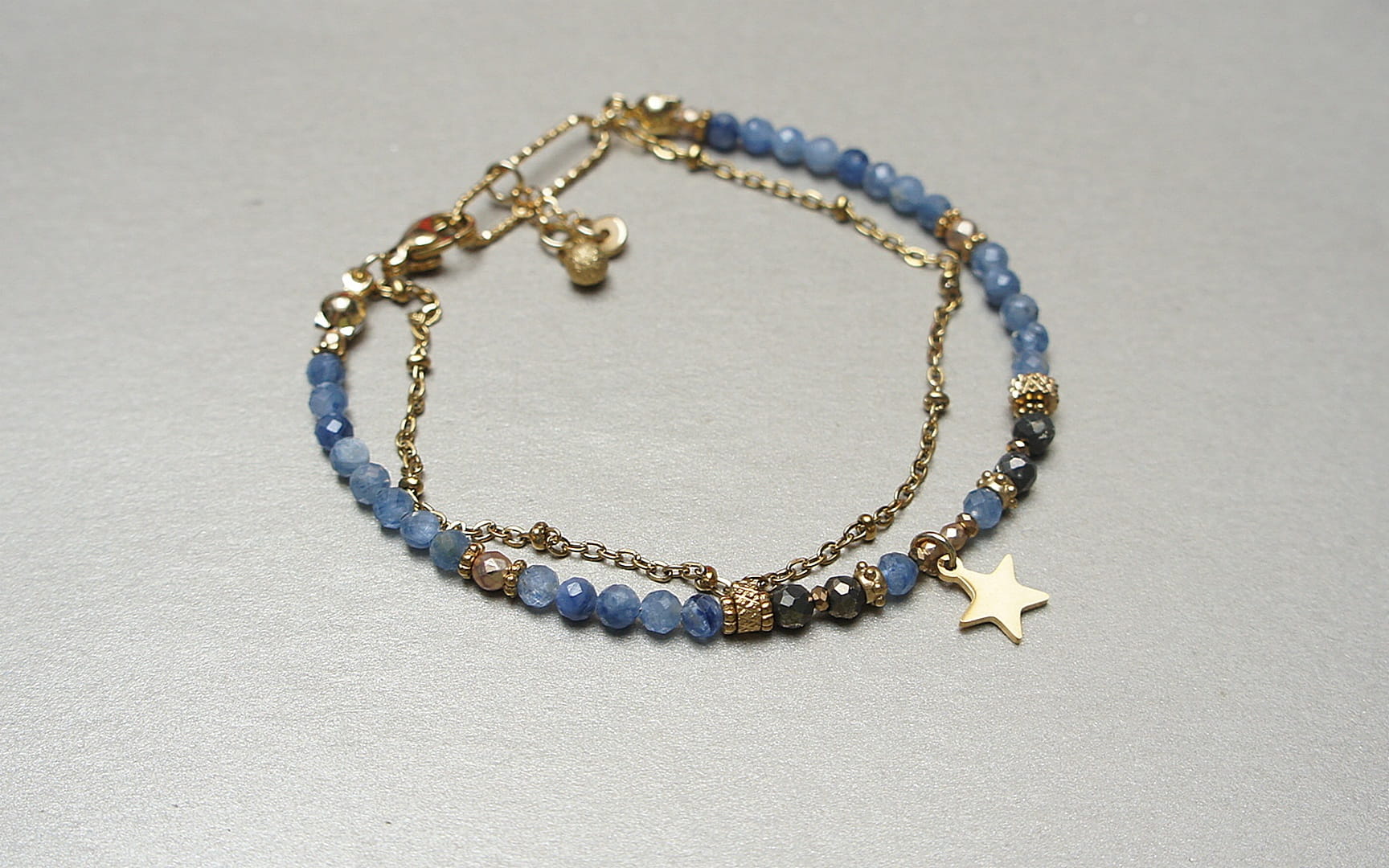 Delikatna bransoletka wykonana w całości ze stali szlachetnej pozłacanej, szlachetnych kamieni - kyanit fasetowany [3mm], piryt fasetowany [3mm], hematyt fasetowany, platerowany [3mm],przekładek z hematytu [1mm]. Całkowita długość bransoletki ok. 18,5cm. Biżuteria ozdobnie zapakowana.