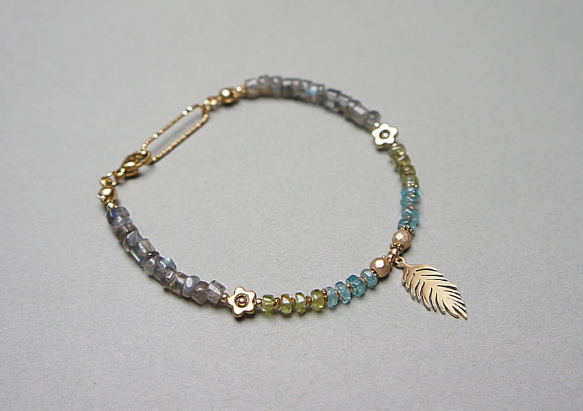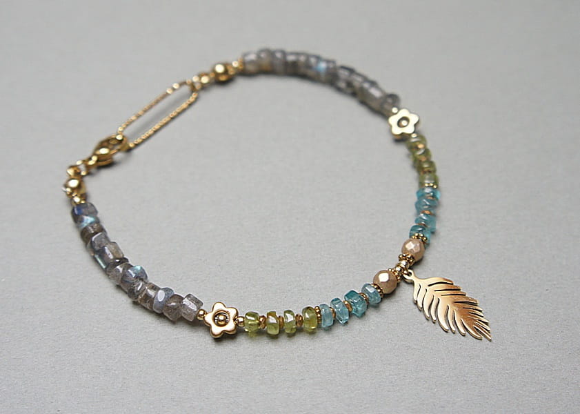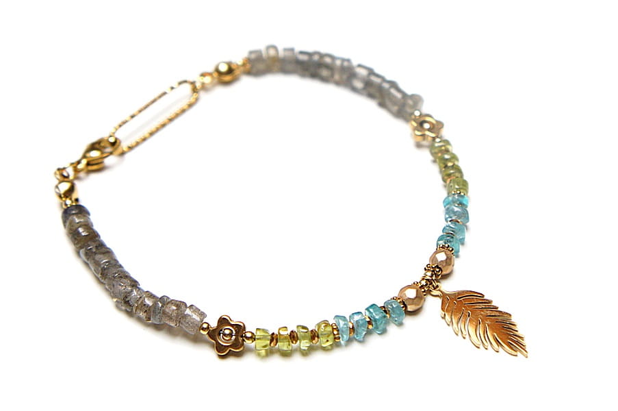 Delikatna bransoletka wykonana w całości ze stali szlachetnej pozłacanej oraz naturalnych, szlachetnych kamieni - nieregularnych talarków [2-3mm x 5mm], talarków apatytu [2mm x 4mm], peridotu [2mm x 4mm], kwiatków z hematytu [6mm], przekładek z hematytu [1mm i 4mm]. Całkowita długość bransoletki 19,5cm.