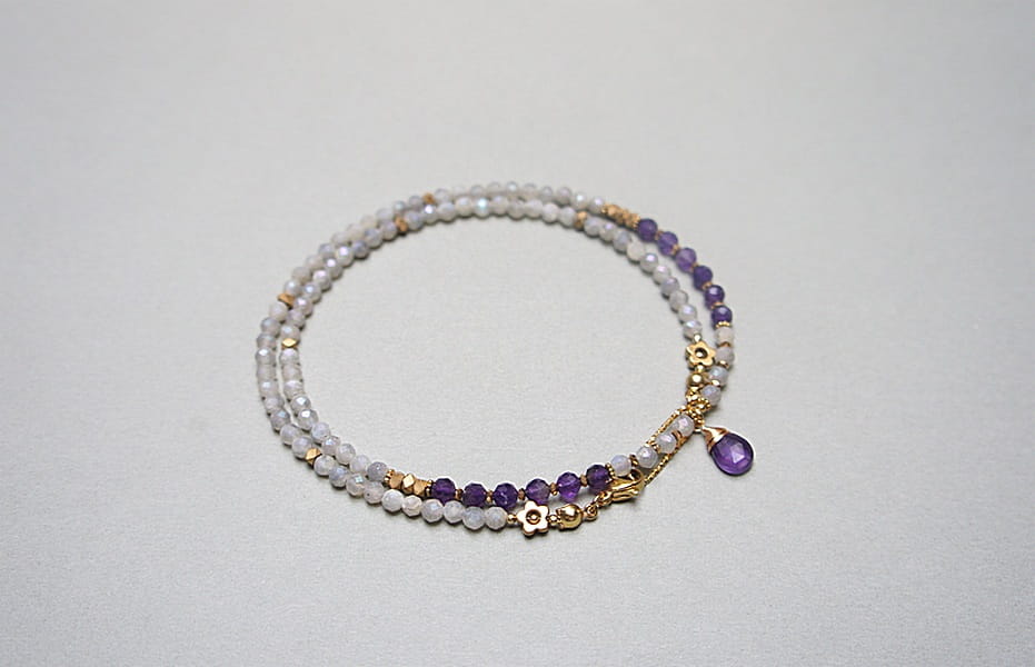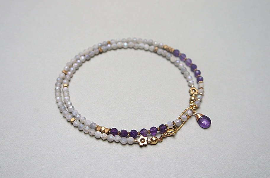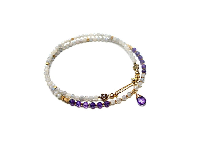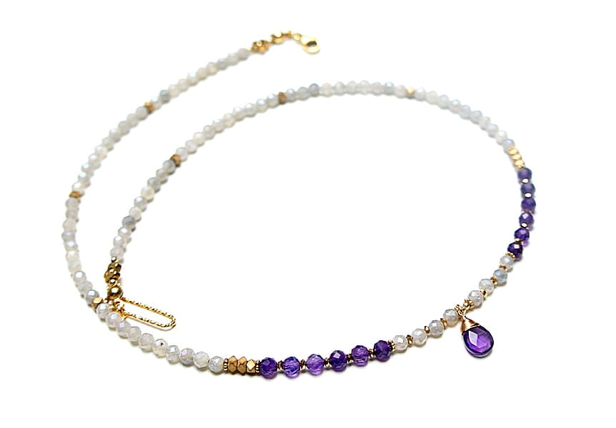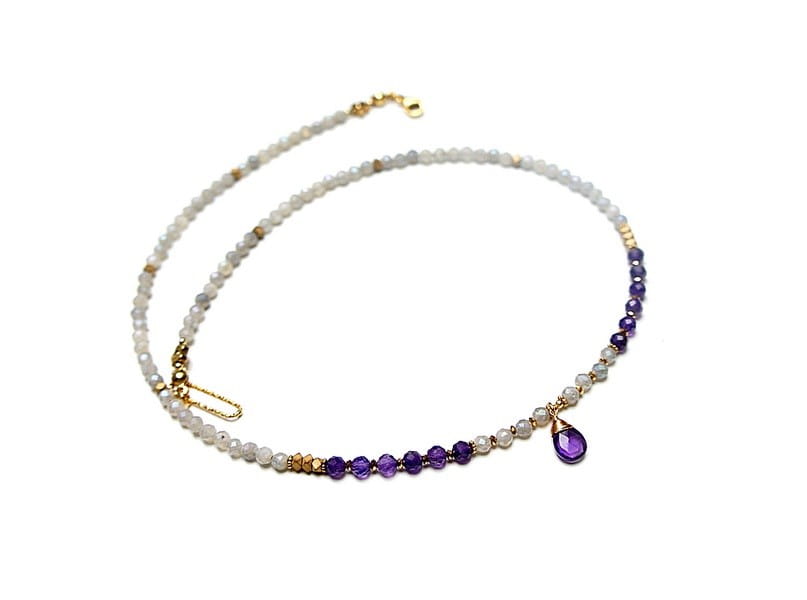 Krótki, delikatny naszyjnik wykonany w całości z pozłacanej stali szlachetnej oraz naturalnych, szlachetnych kamieni - labradorytów fasetowanych, galwanizowanych z poświatą mystic [3,5mm], fasetowanych ametystów [4mm], przekładek z hematytu [1mm i 3 x 2mm] oraz zawieszki z ametystu [brioleta 11mm]. Naszyjnik o długości ok. 49,5cm. Biżuteria ozdobnie zapakowana.