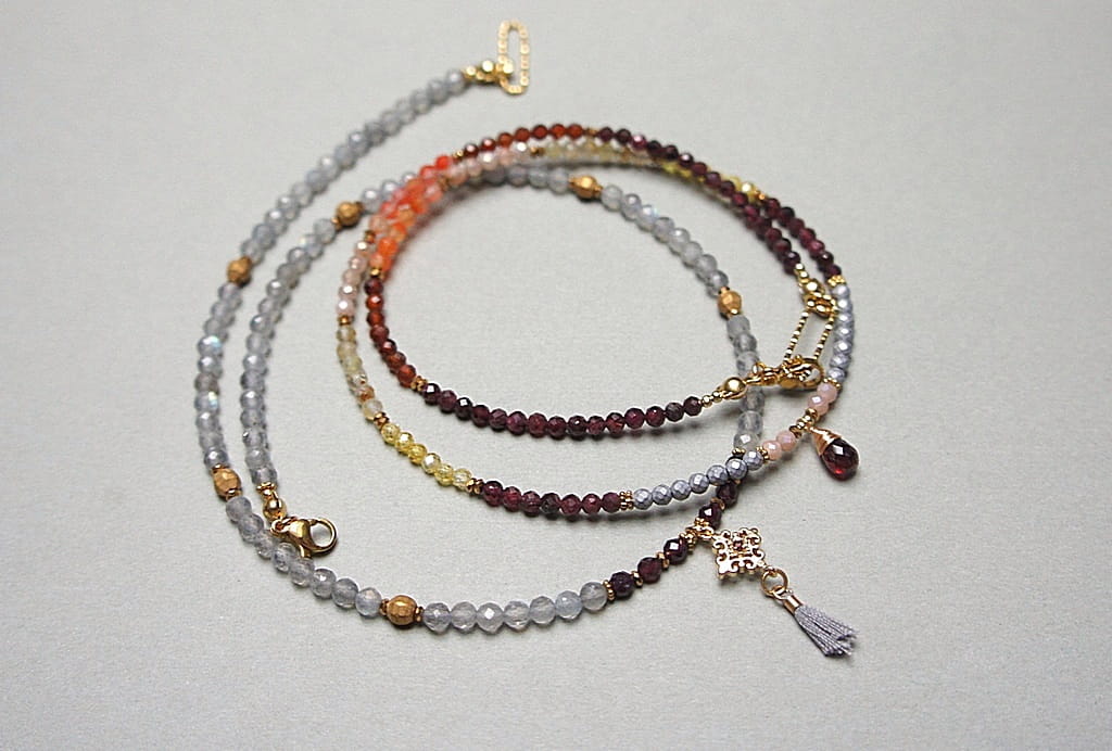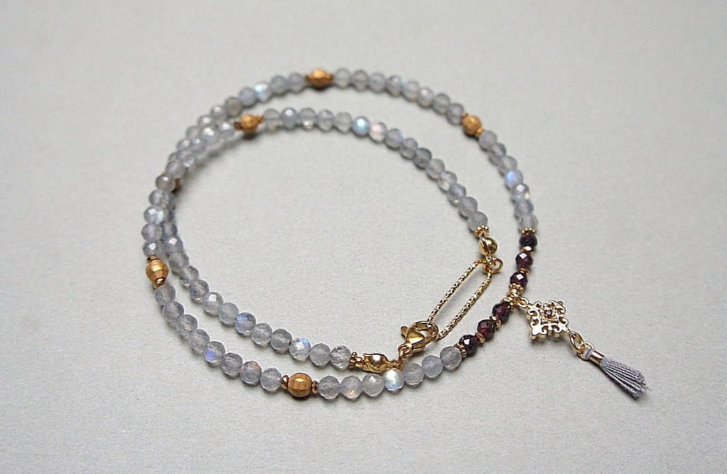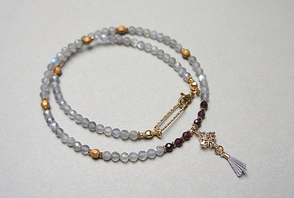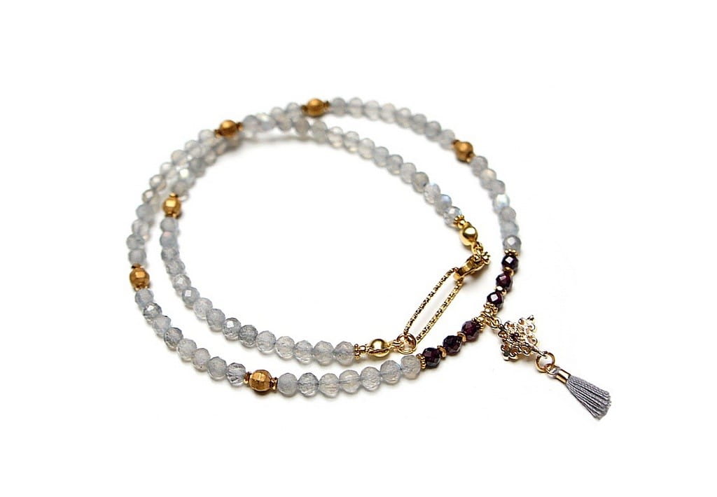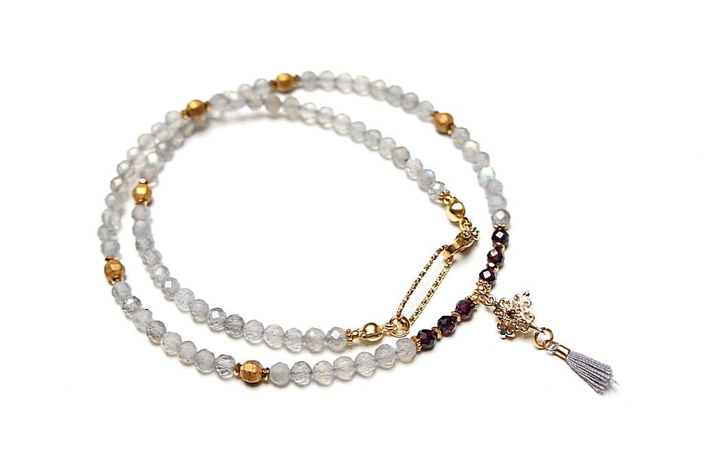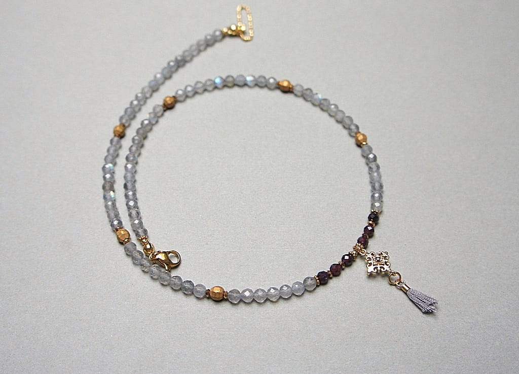 Krótki, delikatny naszyjnik wykonany w całości z pozłacanej stali szlachetnej oraz naturalnych, szlachetnych kamieni - labradorytów fasetowanych [4mm], fasetowanych granatów [3mm], przekładek z hematytu [1mm i 5mm] oraz zawieszki z mosiądzu platerowanego z cyrkonią i chwostem. Naszyjnik o długości ok. 43cm. Biżuteria ozdobnie zapakowana.