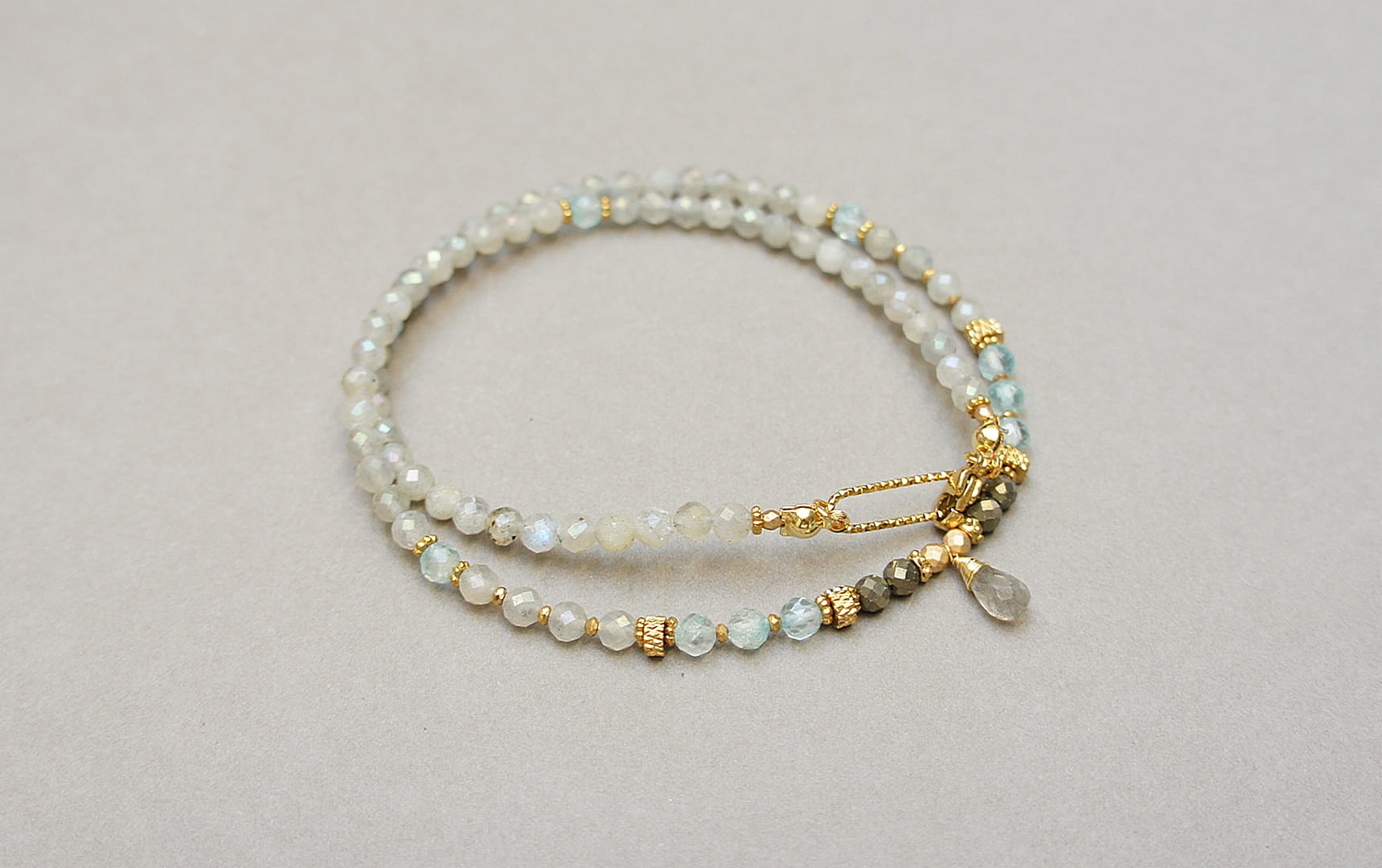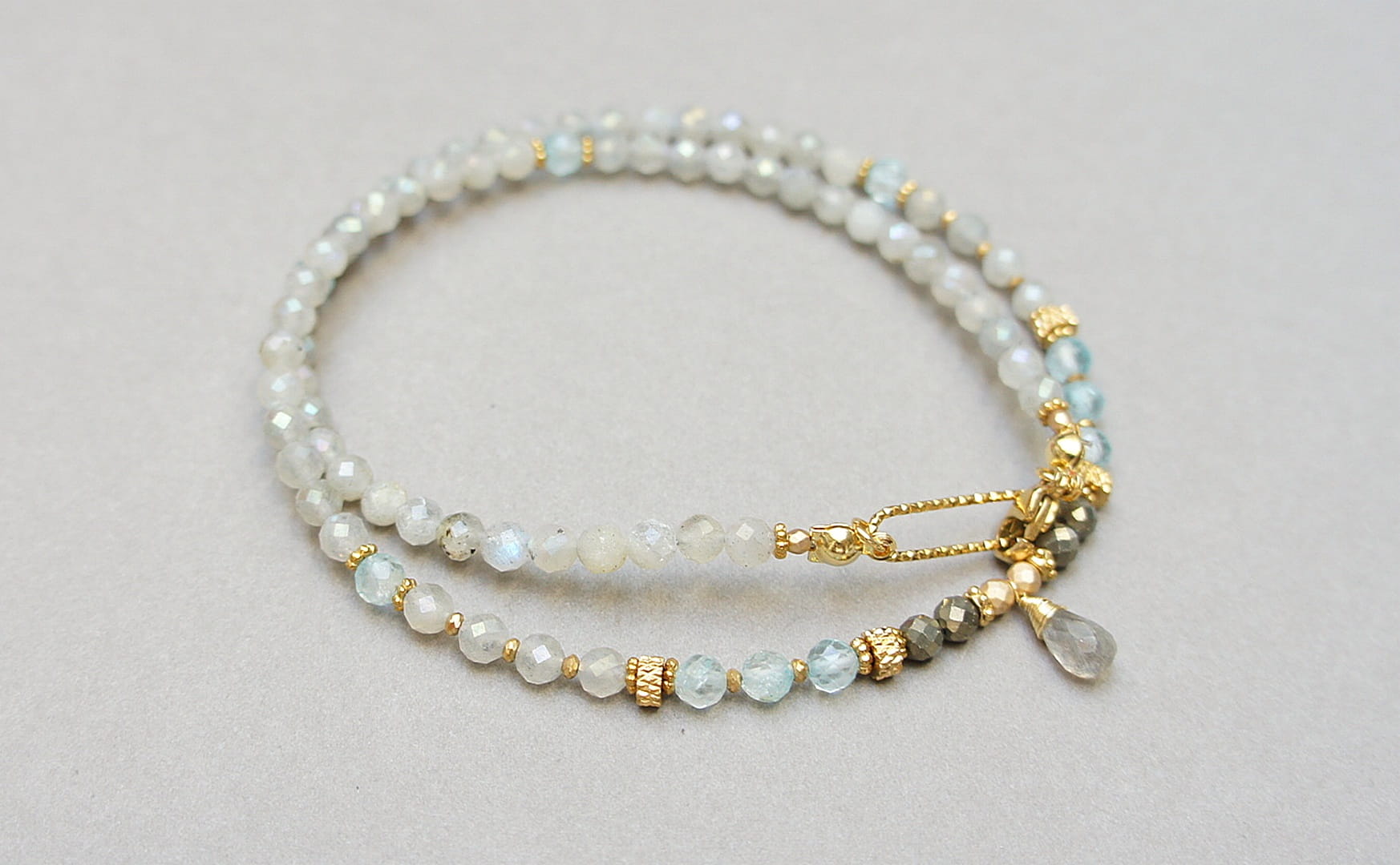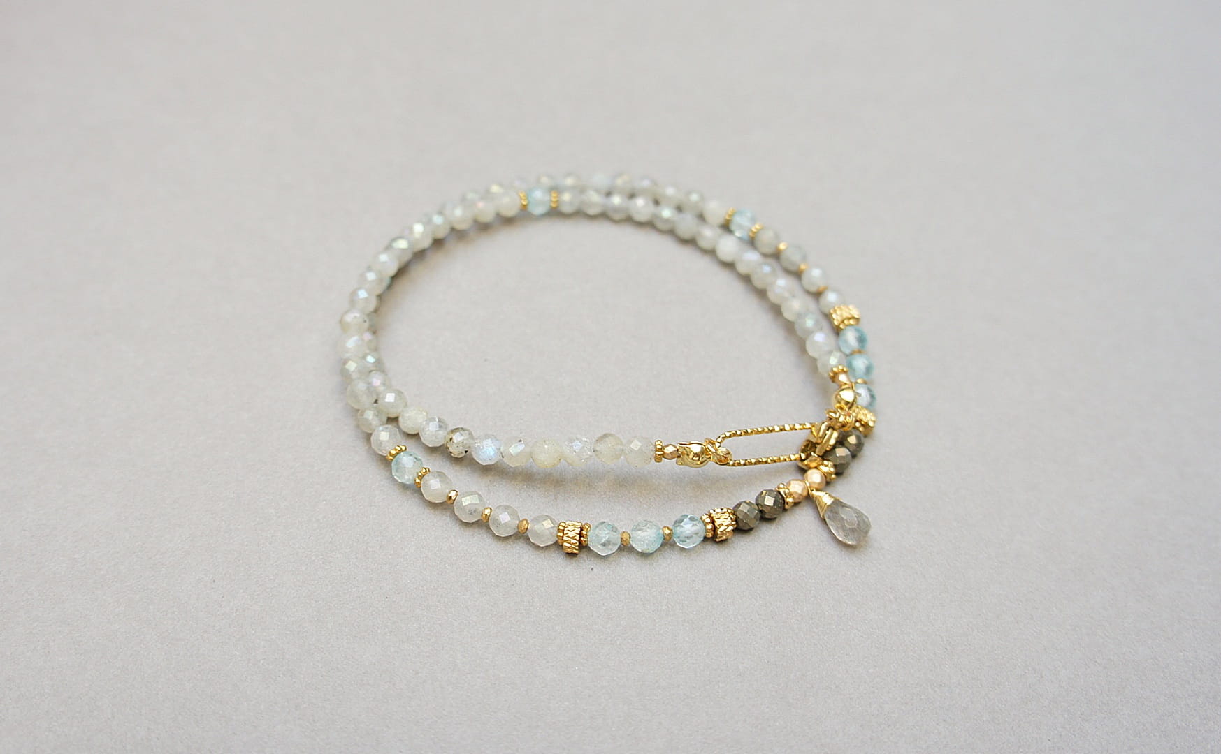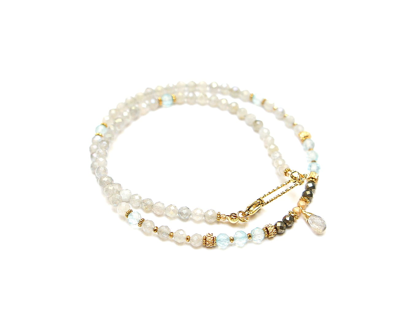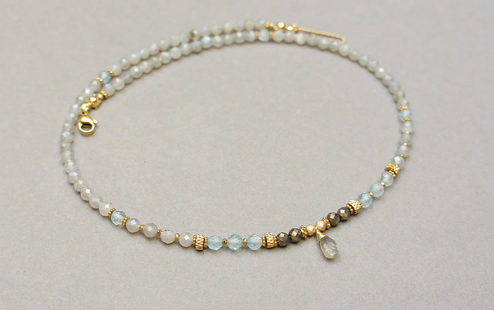 Krótki, delikatny naszyjnik wykonany w całości z pozłacanej stali szlachetnej oraz naturalnych, szlachetnych kamieni - labradorytów fasetowanych [4mm], topazów fasetowanych [4mm], pirytu fasetowanego [3,5mm], hematytu fasetowanego, platerowanego [3mm i 2mm], przekładek z hematytu [1mm] oraz brioletki labradorytu. Naszyjnik o długości ok. 44,5cm. Biżuteria ozdobnie zapakowana.