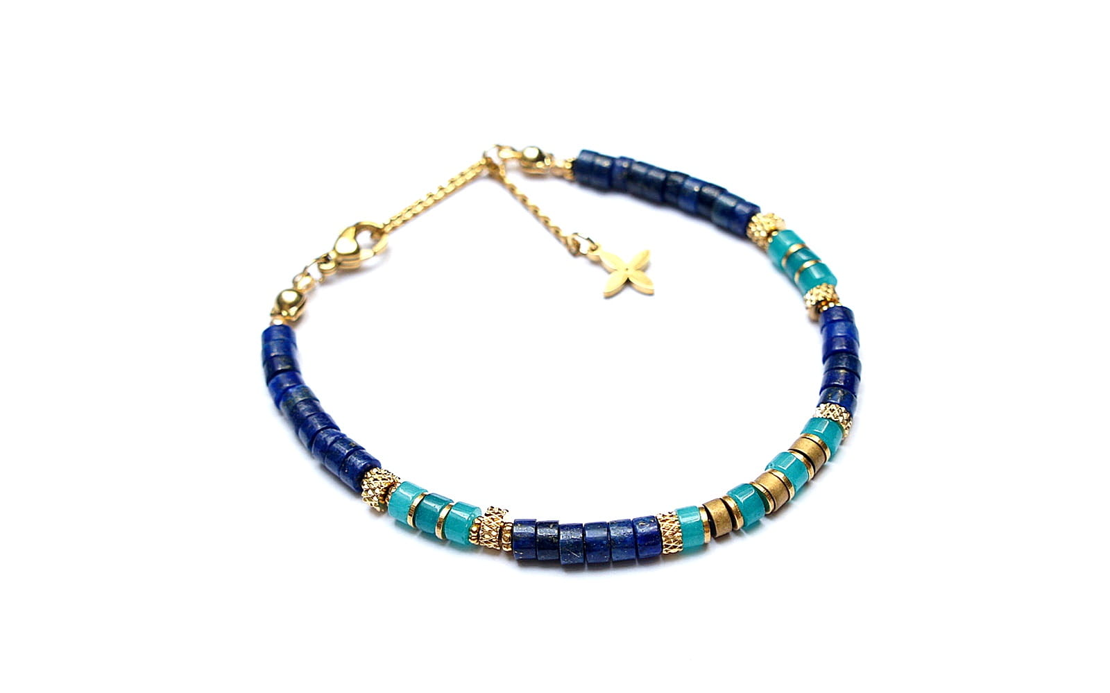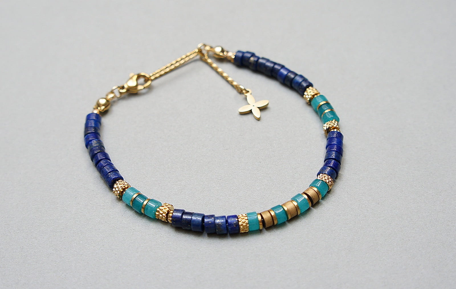 Bransoletka wykonana ze stali szlachetnej oraz naturalnych kamieni - talarków nieregularnego lapis lazuli [4 x 2mm], talarków jadeitu w kolorze turkusowym [4 x 2mm], talarków matowego hematytu [4 x 2mm]. Całkowita długość bransoletki: ok. 19,5cm. Biżuteria ozdobnie zapakowana.