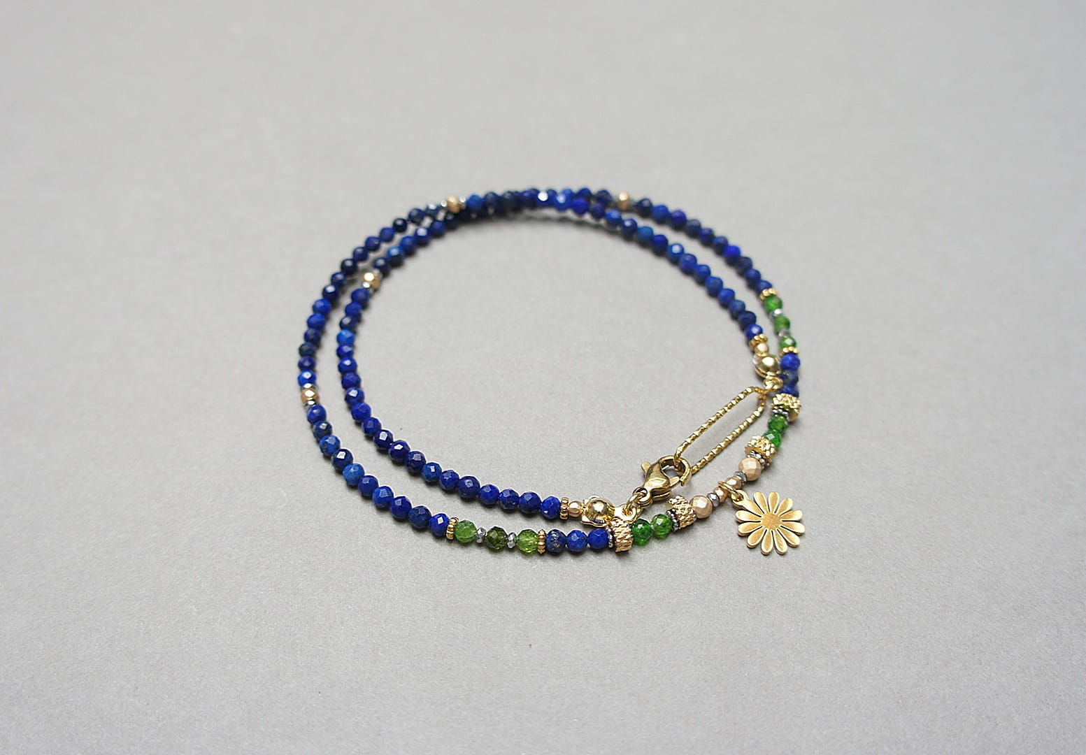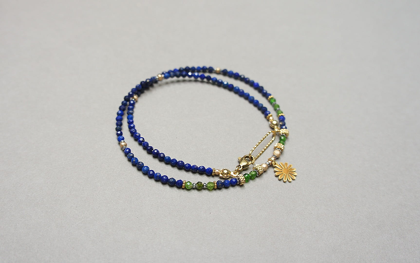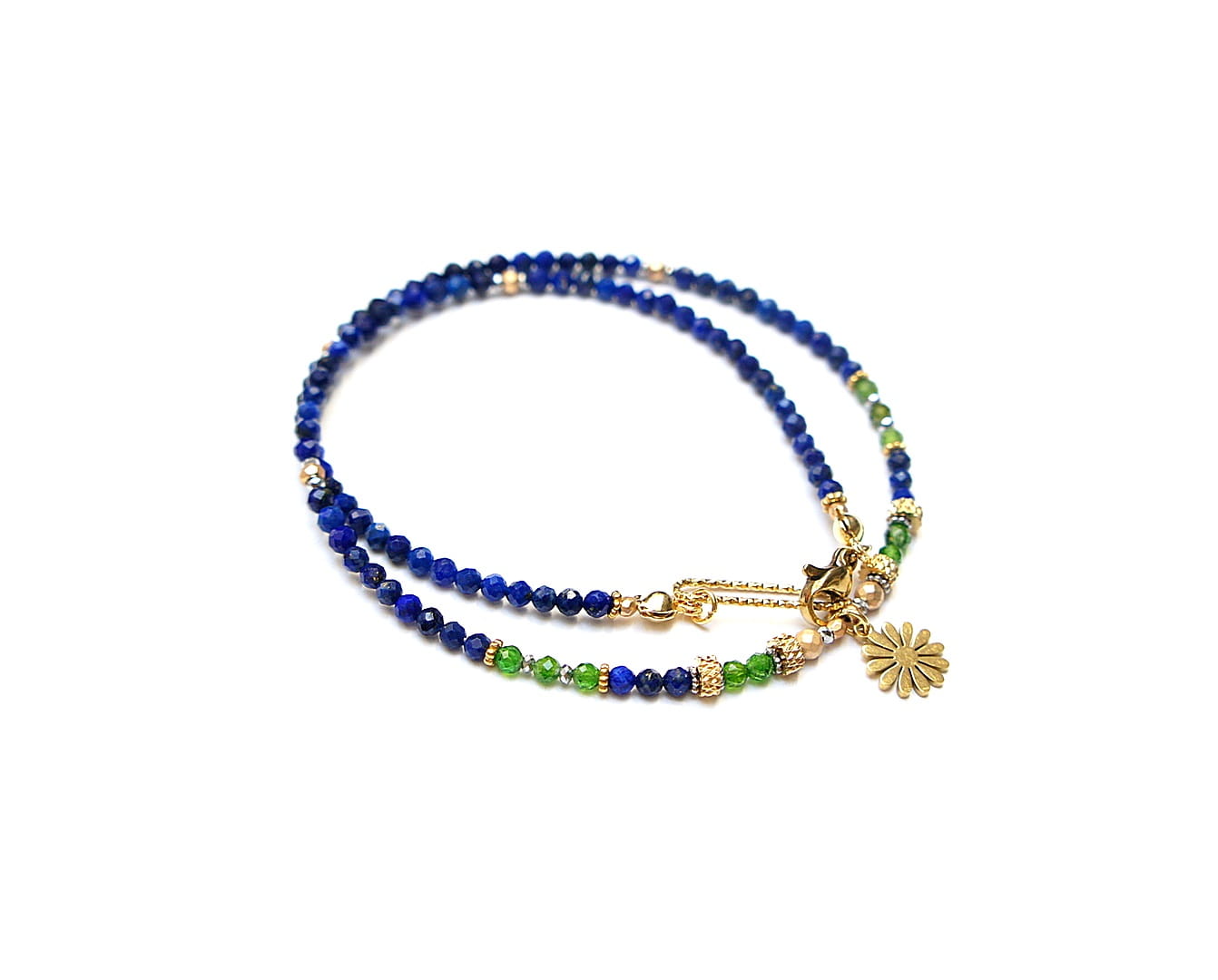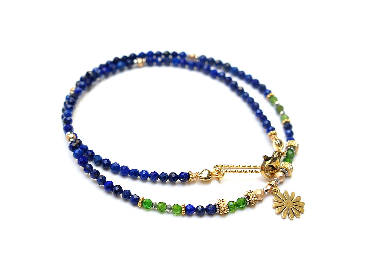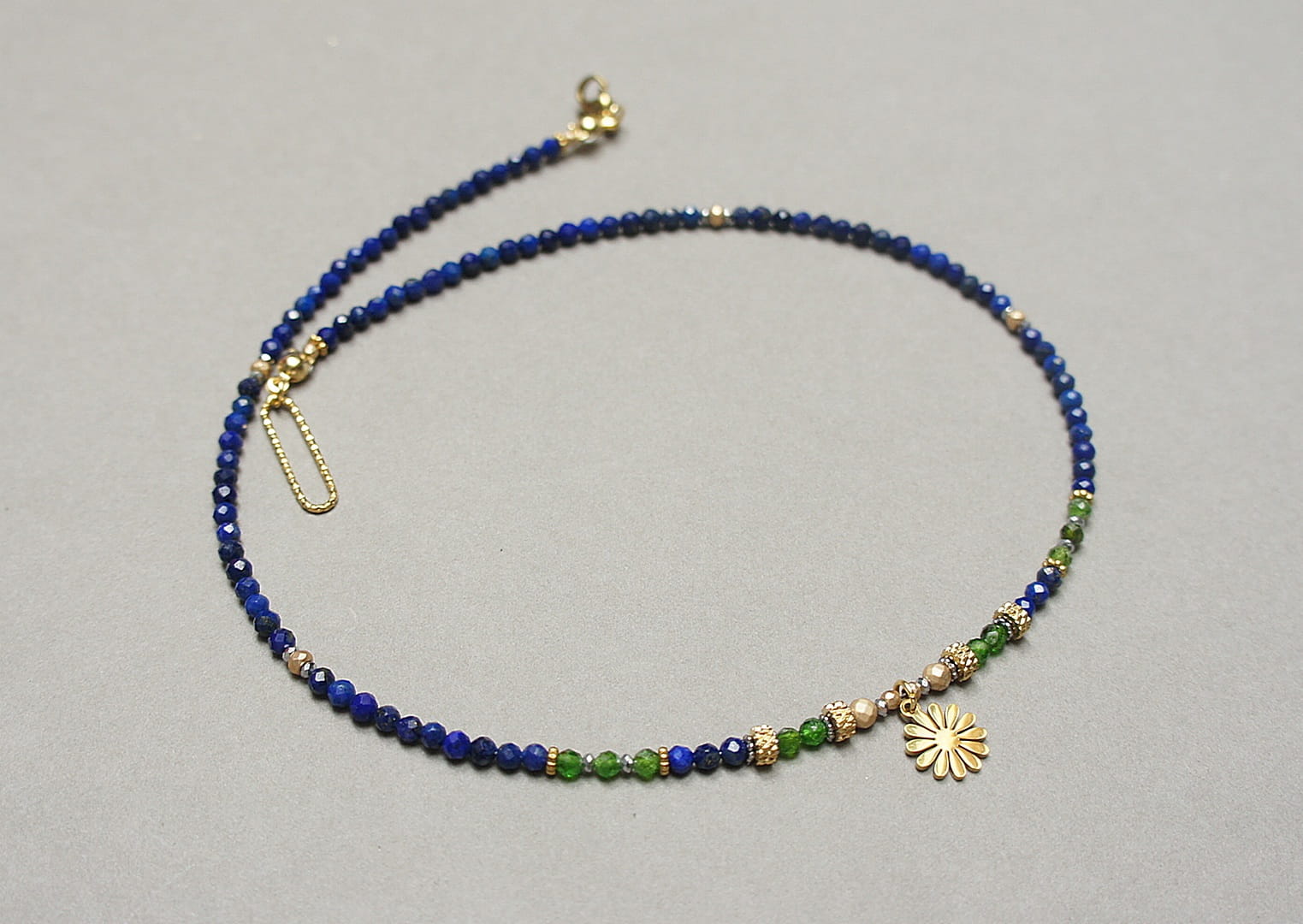 Krótki, delikatny naszyjnik wykonany w całości ze stali szlachetnej, stali szlachetnej pozłacanej oraz naturalnych kamieni - fasetowany lapis lazuli [3mm], fasetowany diopsyd [3mm], fasetowany, platerowany hematyt o matowej powłoce [ 3mm], przekładek z hematytu [3 x 2mm oraz 1mm]. Naszyjnik o długości ok. 42cm.