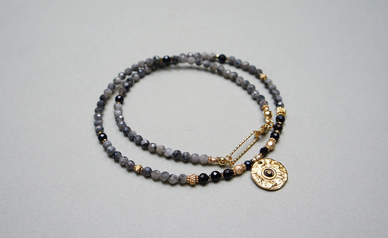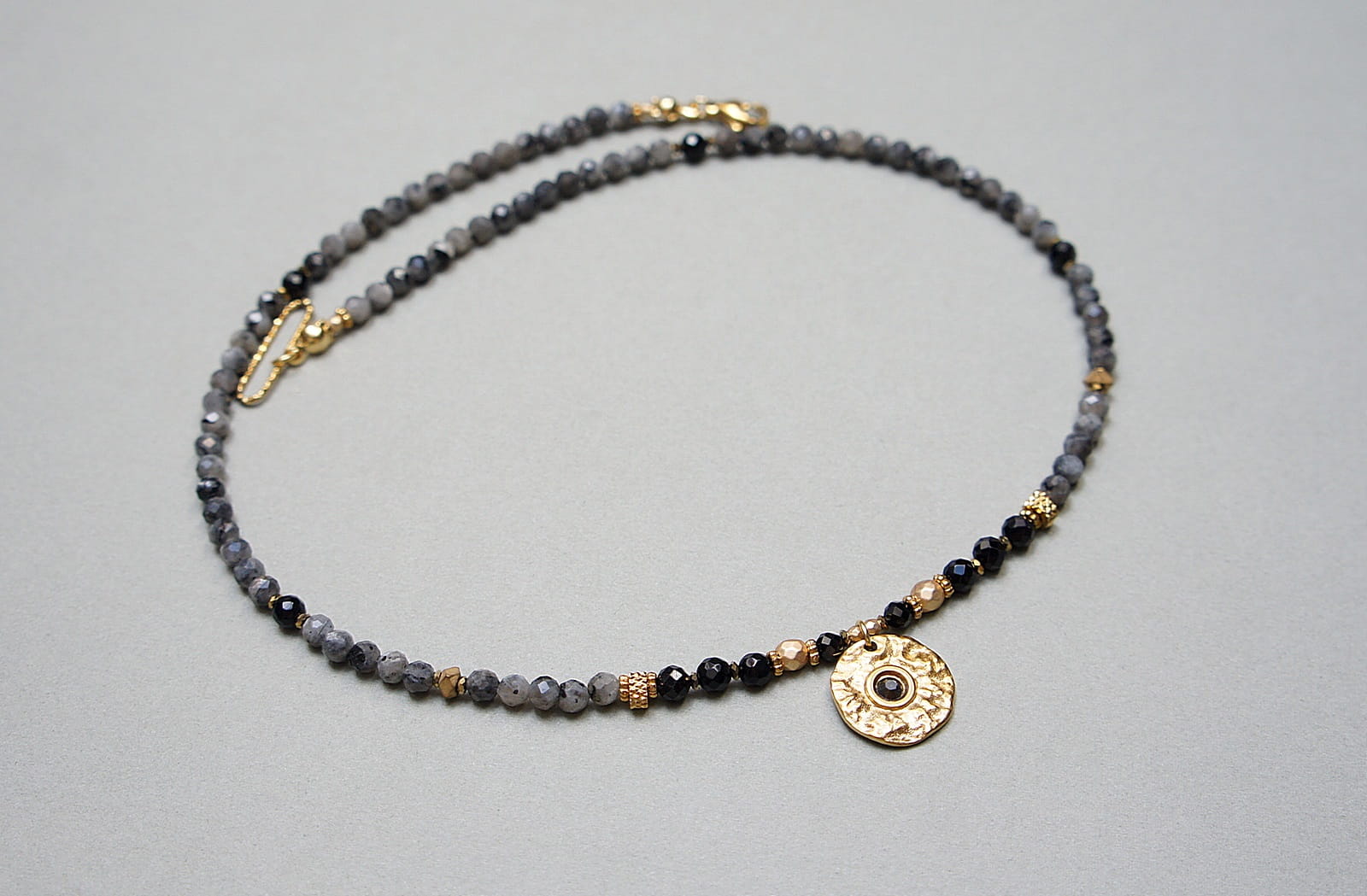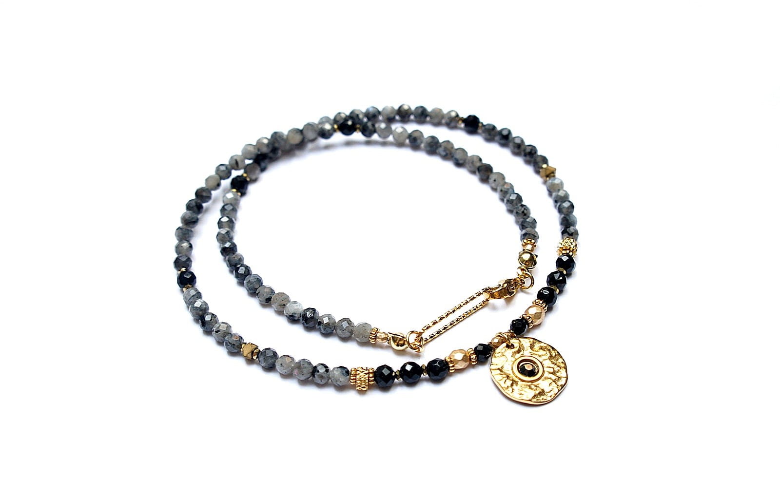 Krótki, delikatny naszyjnik wykonany w całości ze stali szlachetnej pozłacanej oraz naturalnych kamieni - fasetowany larvikit [3mm], onyks fasetowany [3,5mm], hematyt fasetowany, platerowany [4mm], przekładek z hematytu [3 x 2mm oraz 1mm] oraz zawieszki z kryształkiem Swarovski. Naszyjnik o długości ok. 44,5cm. Biżuteria ozdobnie zapakowana.