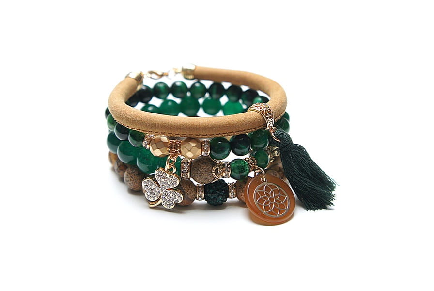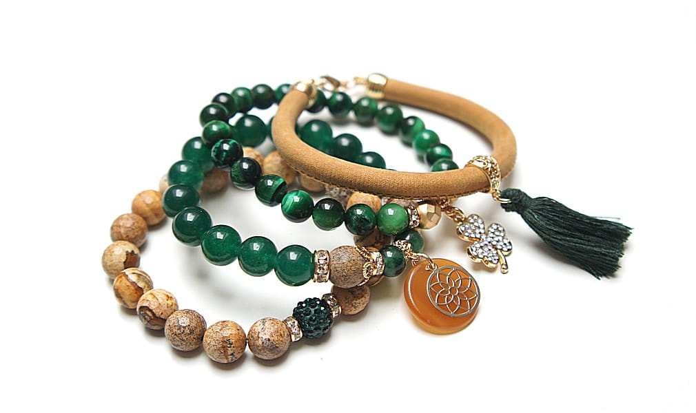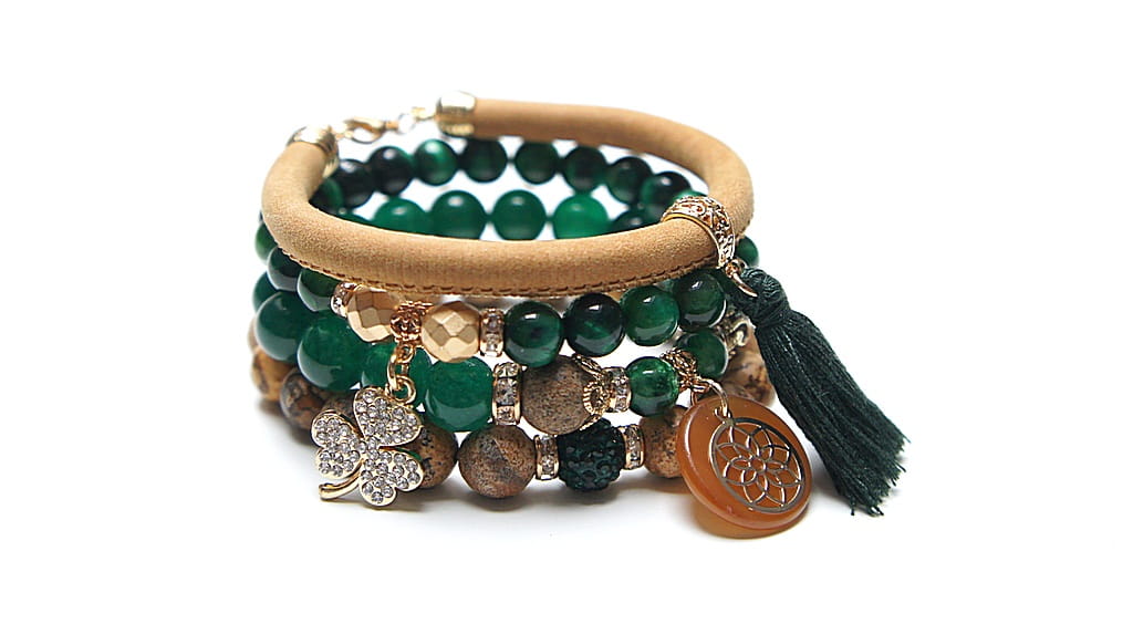 Komplet czterech bransoletek wykonanych z naturalnych kamieni: marmur [8mm], jadeity [10mm], jaspis krajobrazowy [ 10mm], tygrysie oko [8mm], hematyt fasetowany, platerowany [8mm], rzemienia z naturalnej, zamszowej skórki, zawieszki wysadzanej cyrkoniami, zawieszki z żywicy, przekładki shamballa wysadzanej kryształkami [10mm], chwostu oraz elementów metalowych w kolorze złota. Bransoletki pasują na nadgarstek 16 - 17cm. Biżuteria ozdobnie zapakowana
