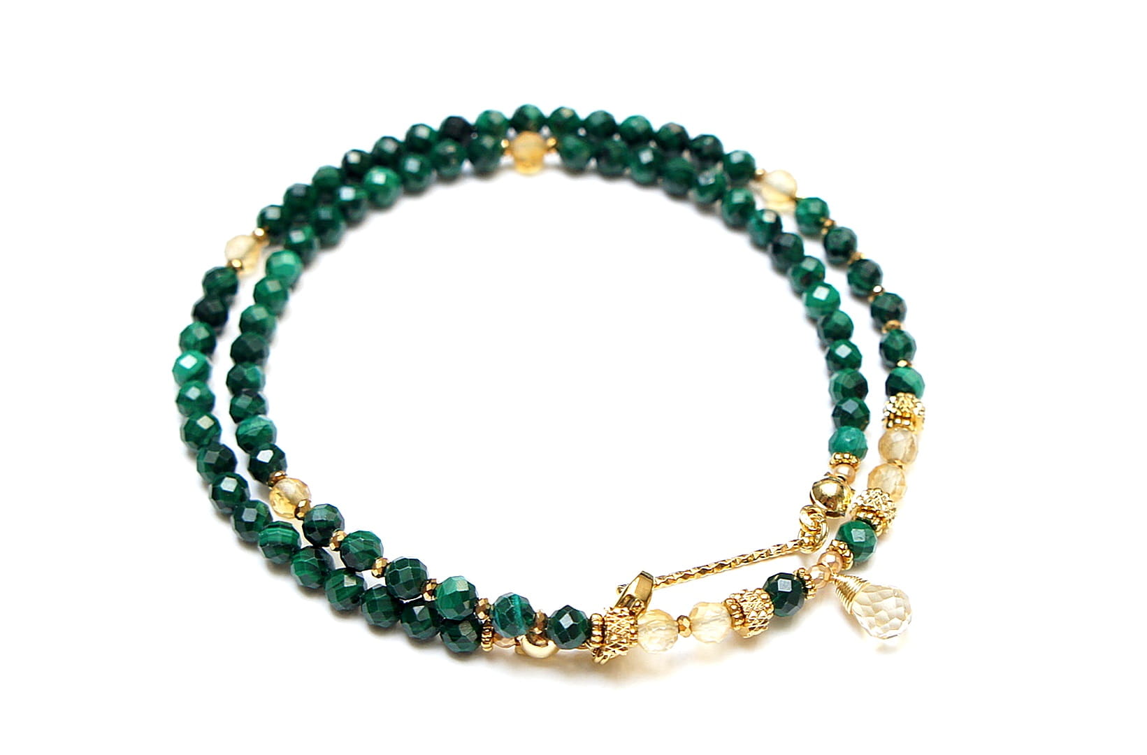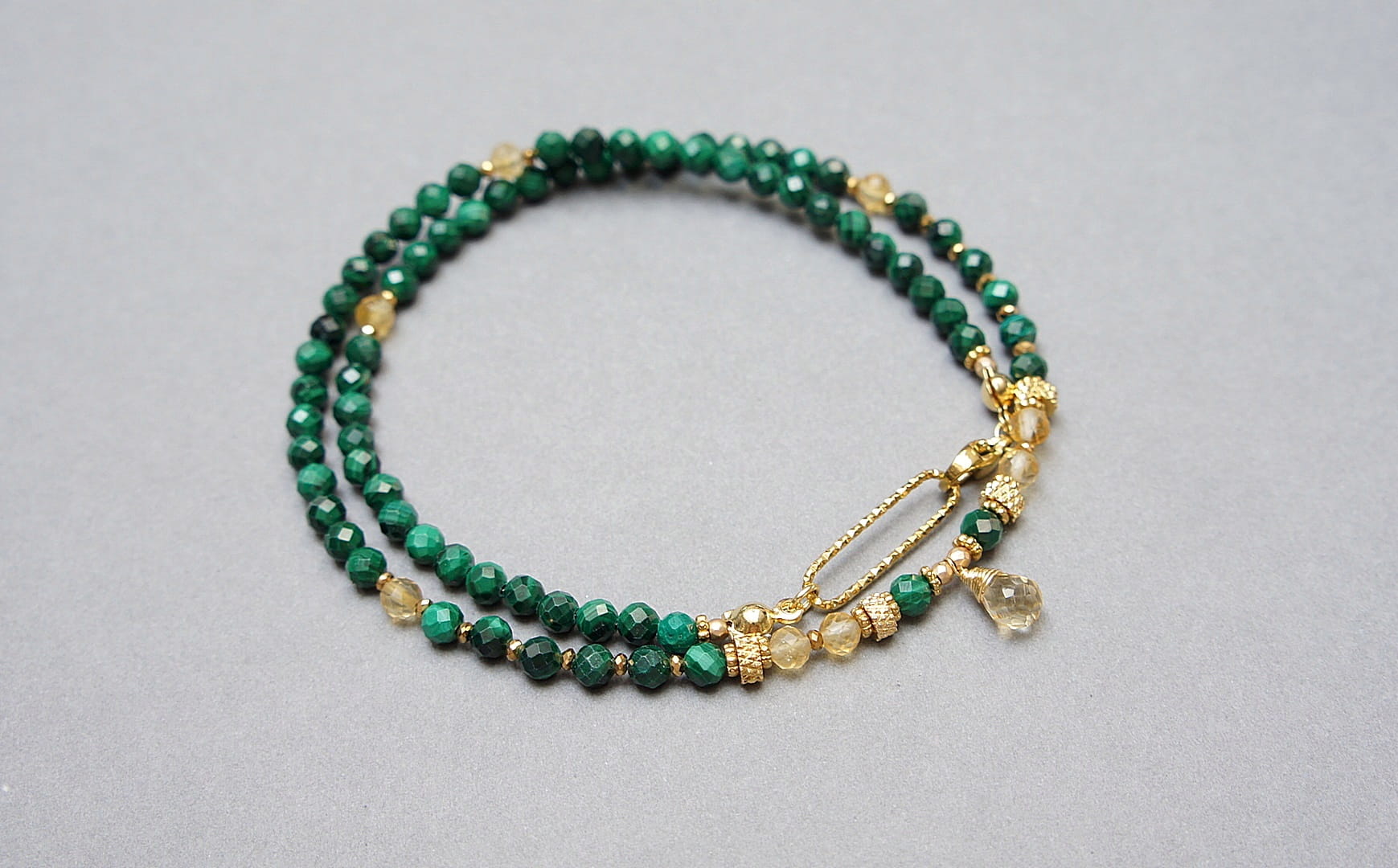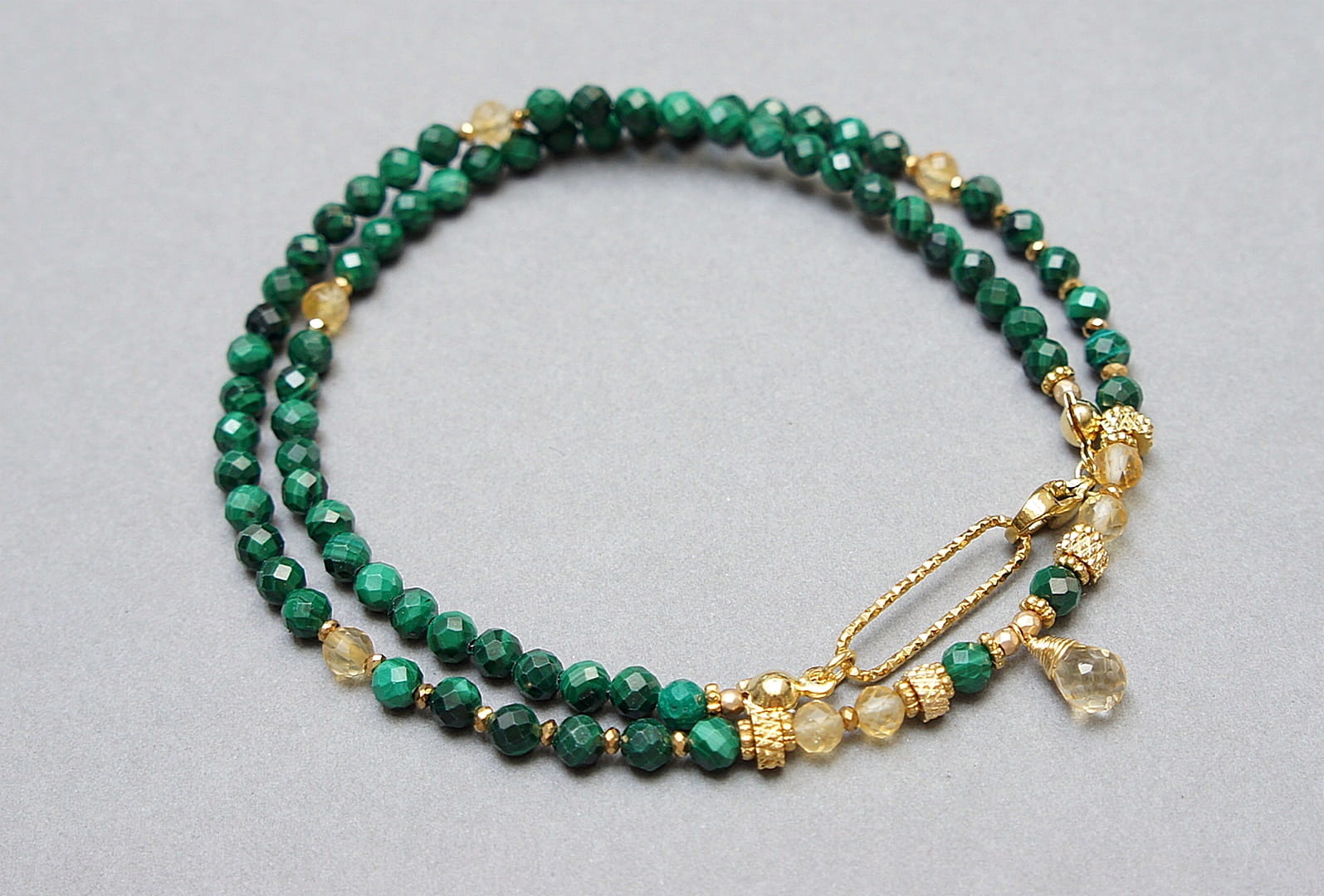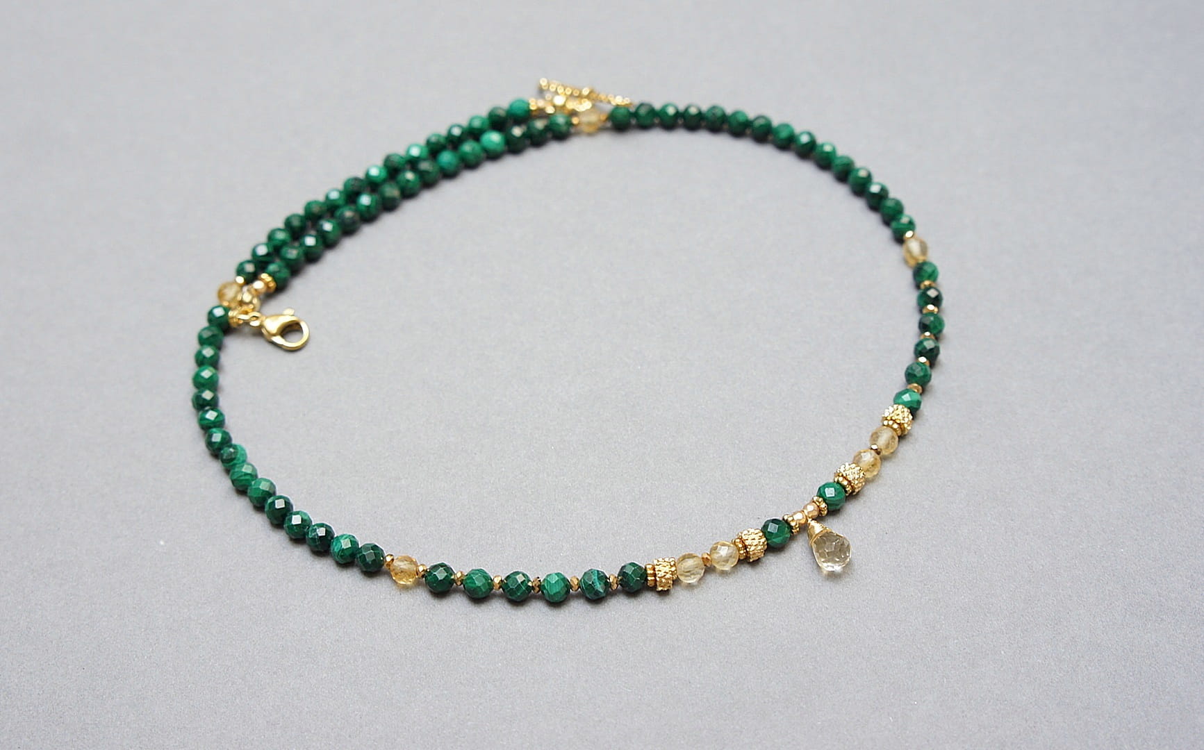 Krótki, delikatny naszyjnik wykonany w całości z pozłacanej stali szlachetnej oraz naturalnych, szlachetnych kamieni - malachity fasetowane [4mm], cytryn fasetowany [4mm],hematytu fasetowanego, platerowanego [2mm], przekładek z hematytu [1mm] oraz zawieszki z brioletką naturalnego, fasetowanego cytrynu. Naszyjnik o długości 42cm. Biżuteria ozdobnie zapakowana.