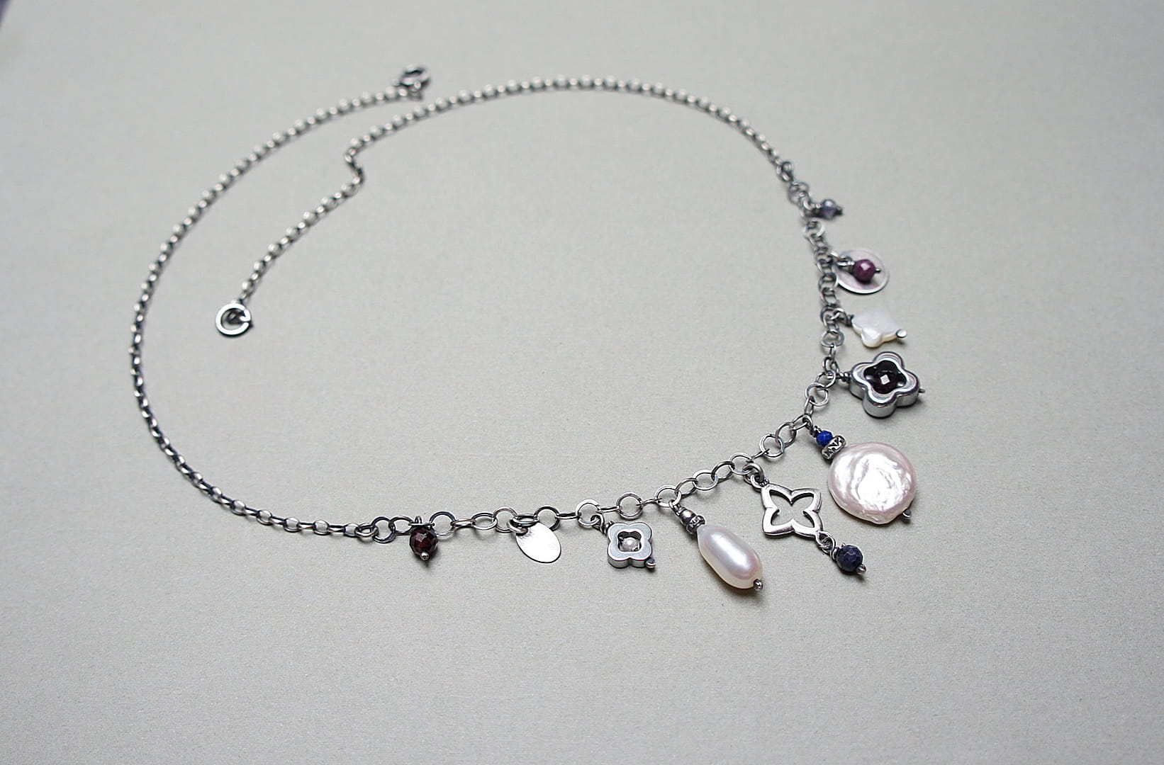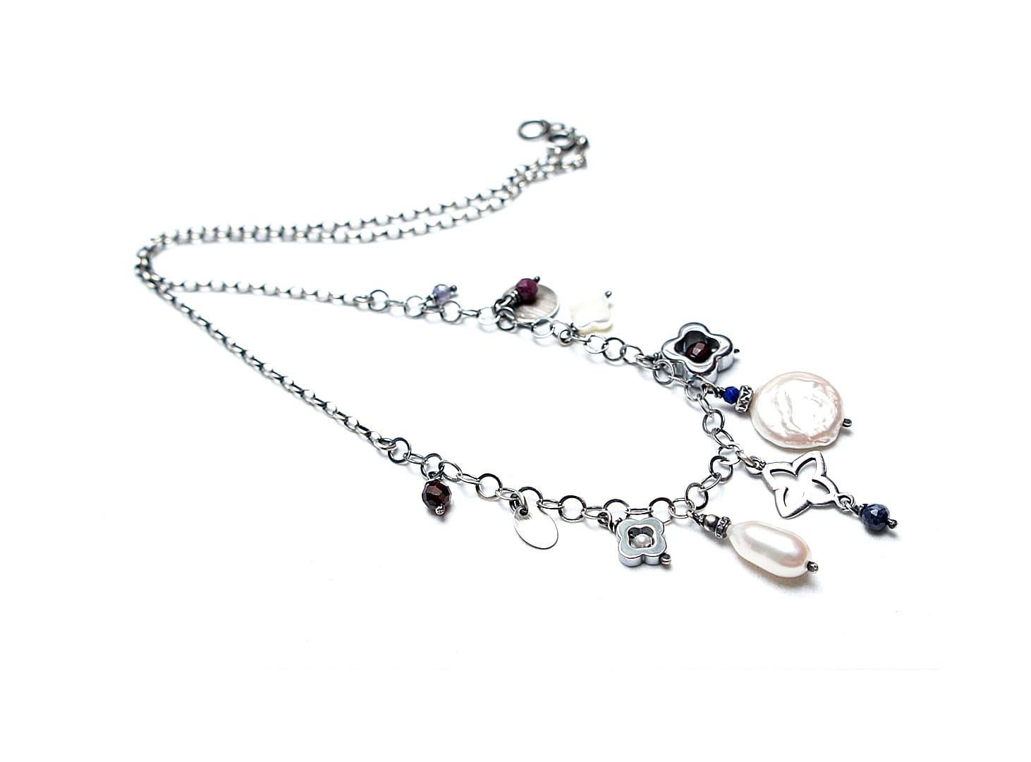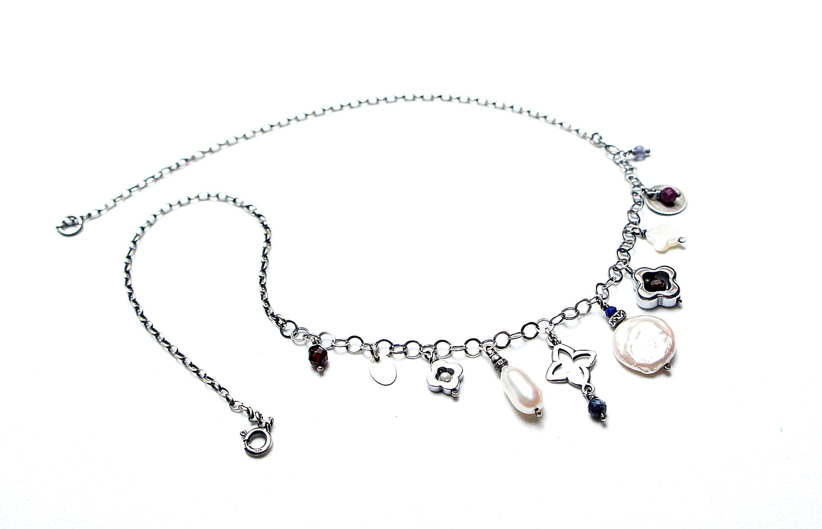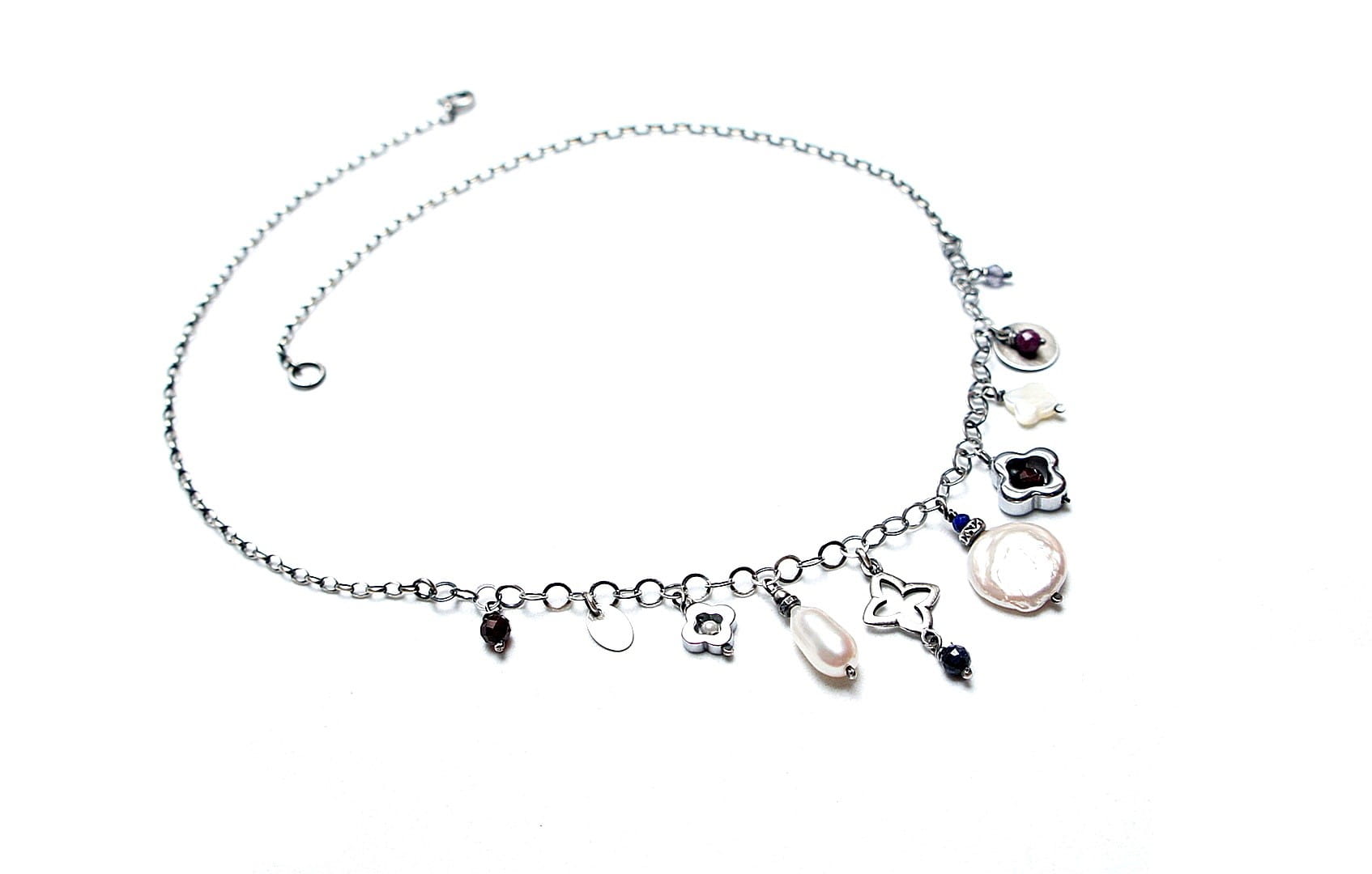 Naszyjnik wykonany ze srebra pr. 925 w połączeniu z naturalną perłą [13mm kropla], macicą perłową [koniczynka 8mm], naturalną perłą biwa [14mm - monetka], naturalnymi rubinami, szafirami, granatami, iolitami, lapisem lazuli [4mm,3mm i 2mm], hematytowymi koniczynkami oraz srebrną koniczynką. Srebro oksydowane i przetarte. Całkowita długość naszyjnika 45,5cm plus ozdobna przedłużka.