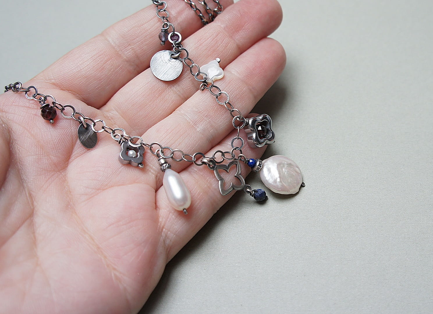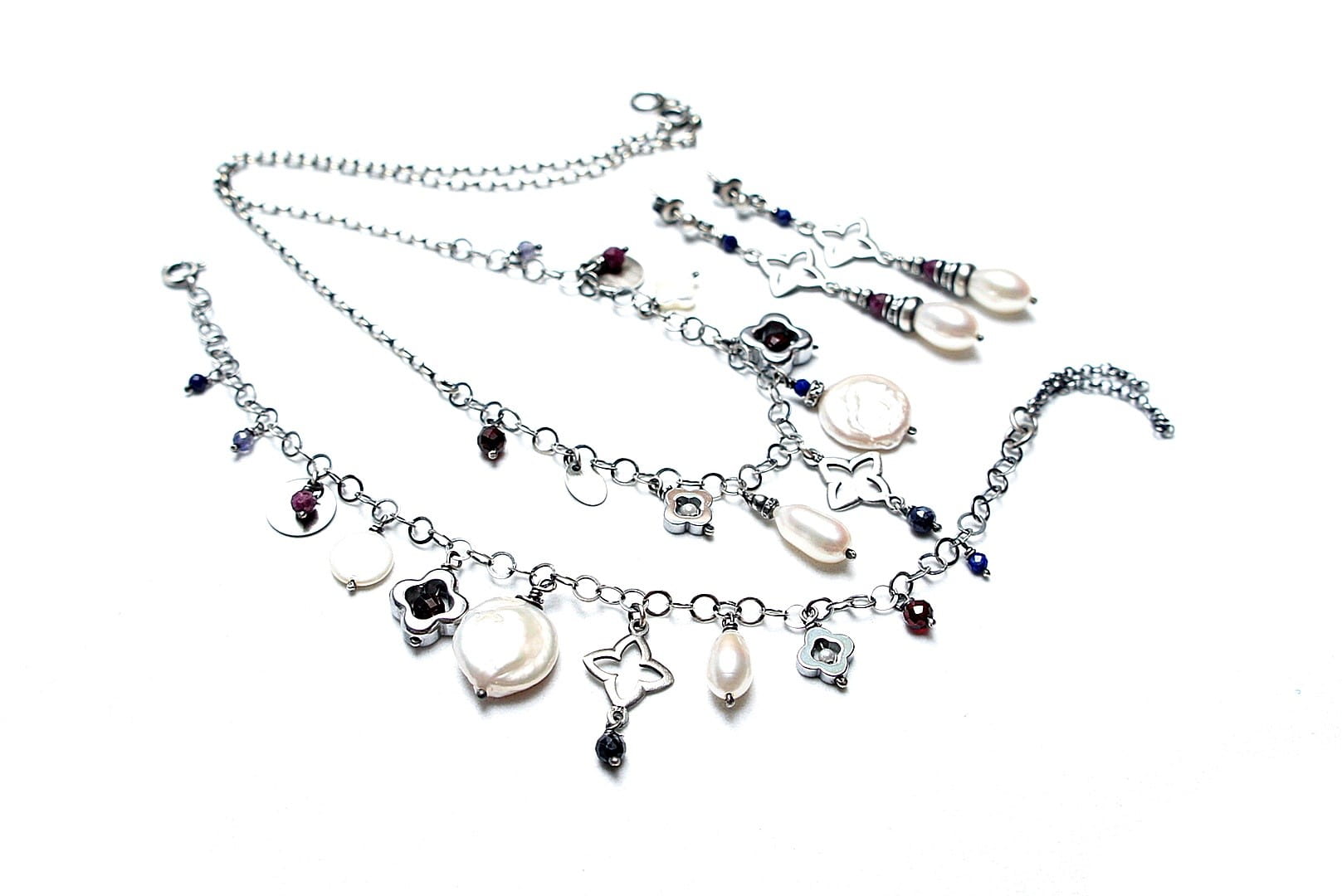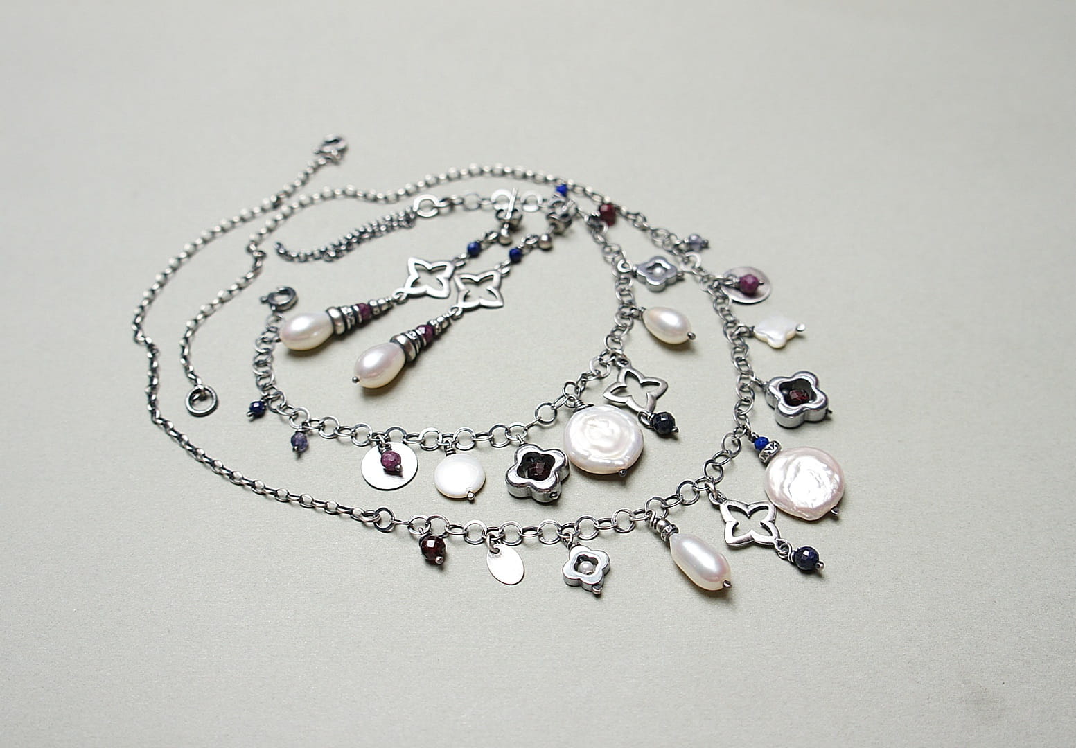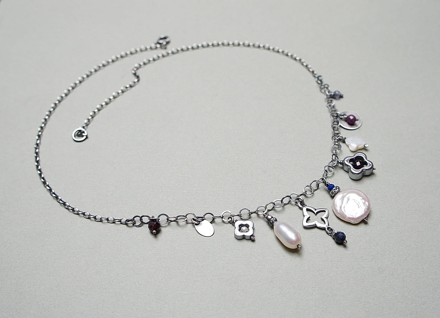 Naszyjnik wykonany ze srebra pr. 925 w połączeniu z naturalną perłą [13mm kropla], macicą perłową [koniczynka 8mm], naturalną perłą biwa [14mm - monetka], naturalnymi rubinami, szafirami, granatami, iolitami, lapisem lazuli [4mm,3mm i 2mm], hematytowymi koniczynkami oraz srebrną koniczynką. Srebro oksydowane i przetarte. Całkowita długość naszyjnika 45,5cm plus ozdobna przedłużka.