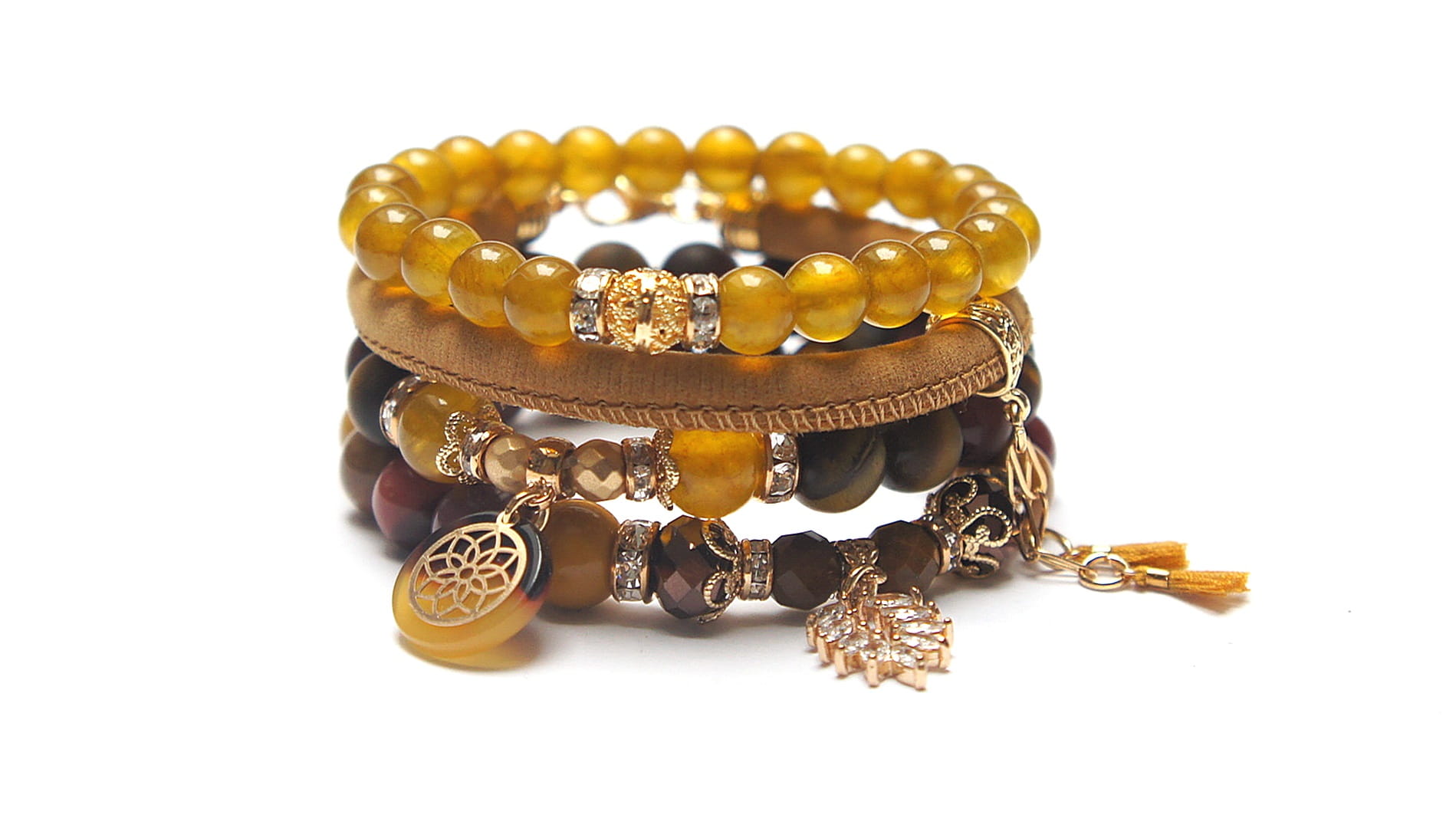 Komplet czterech bransoletek wykonanych z naturalnych kamieni: mokait [10mm], jaspis fasetowany [8mm], jadeit szklisty [8 i 10mm], hematyt fasetowany, platerowany [8mm], kryształków fasetowanych [10mm], rzemienia z naturalnej skóry, zawieszki z żywicy, zawieszki wysadzanej cyrkoniami, chwostów oraz elementów metalowych w kolorze złota. Bransoletki pasują na nadgarstek 16 - 17cm.